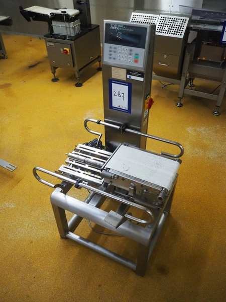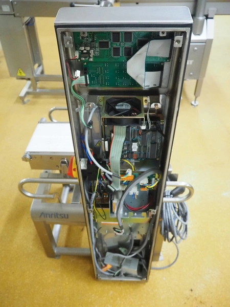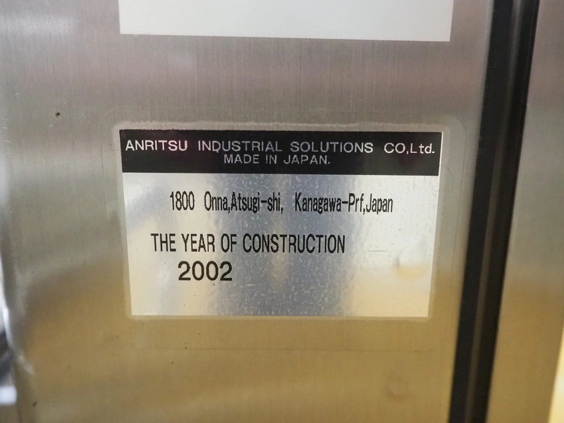 Anritsu checkweigher, model: KW5504AW, serial number: 410006370, year of construction: 2002, 100-120/200-240 V, 1 Ph, 50/60 Hz, 50 g - 3000 g, d= 0.2 g, capacity: 200 p/m, plastic belt, belt width: 200 mm, total dimensions: 750 mm x 700 mm x 1210 mm. Incomplete.