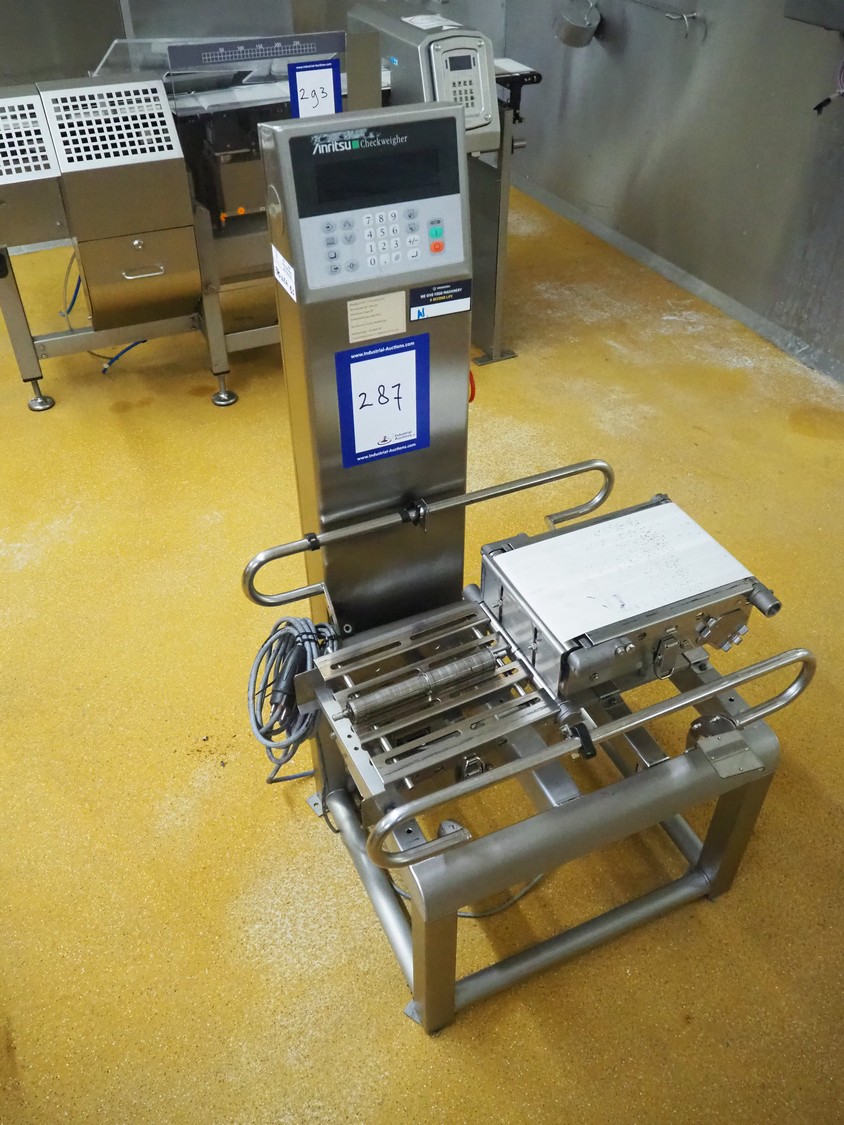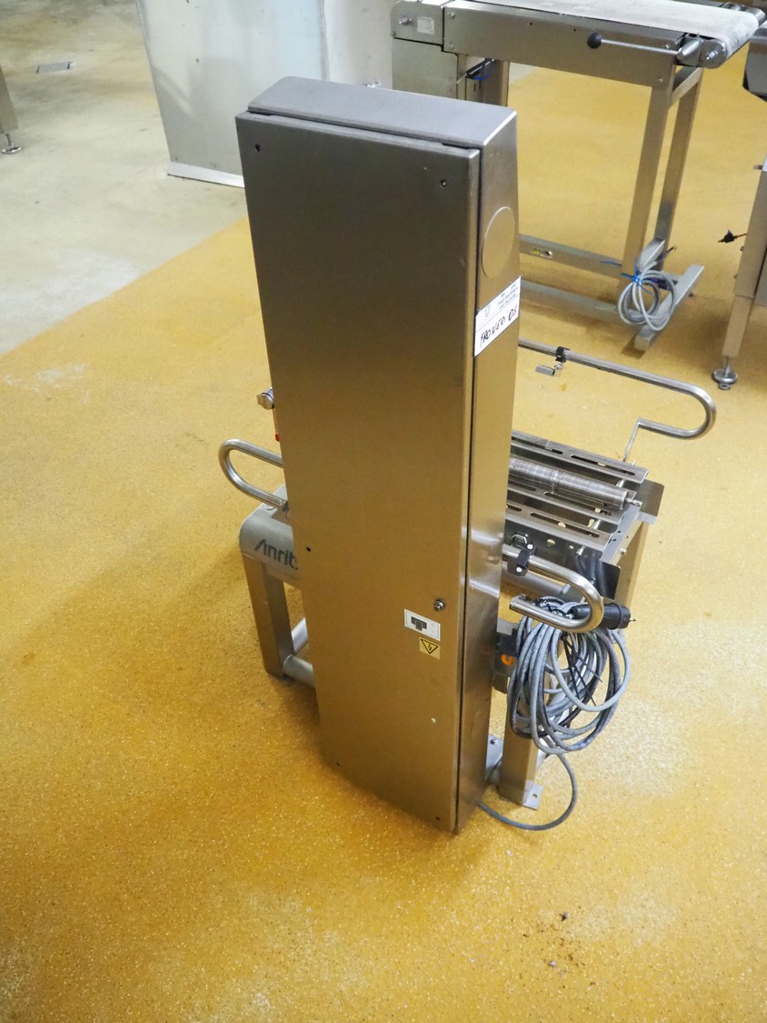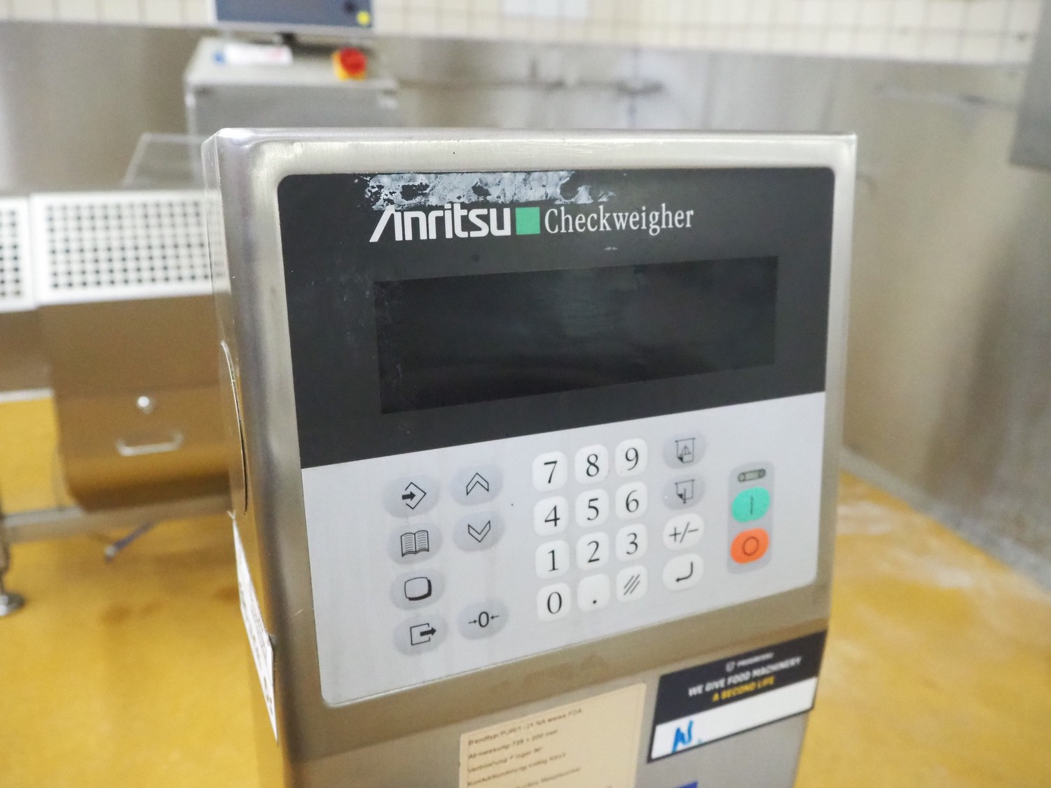 Anritsu checkweigher, model: KW5504AW, serial number: 410006370, year of construction: 2002, 100-120/200-240 V, 1 Ph, 50/60 Hz, 50 g - 3000 g, d= 0.2 g, capacity: 200 p/m, plastic belt, belt width: 200 mm, total dimensions: 750 mm x 700 mm x 1210 mm. Incomplete.