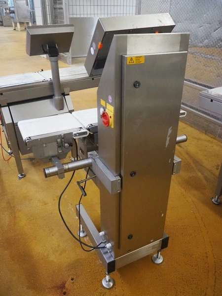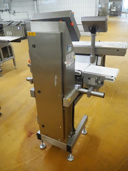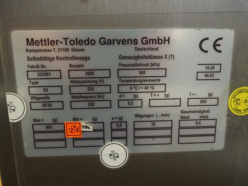 Mettler-Toledo Garvens GmbH checkweigher with rejector, type: S3, factory number: 2005, 230 V, 50/60 Hz, year of construction: 2008, maximum capacity: 800 g, minimum capacity: 100 g, e= 0.5 g, d= 0.5 g, plastic belts, belt width: 250 mm, total dimensions: 1050 mm x 750 mm x 1500 mm.