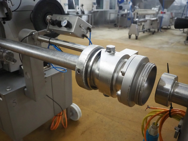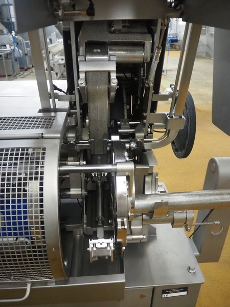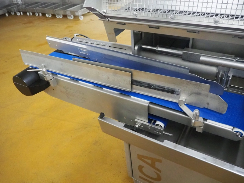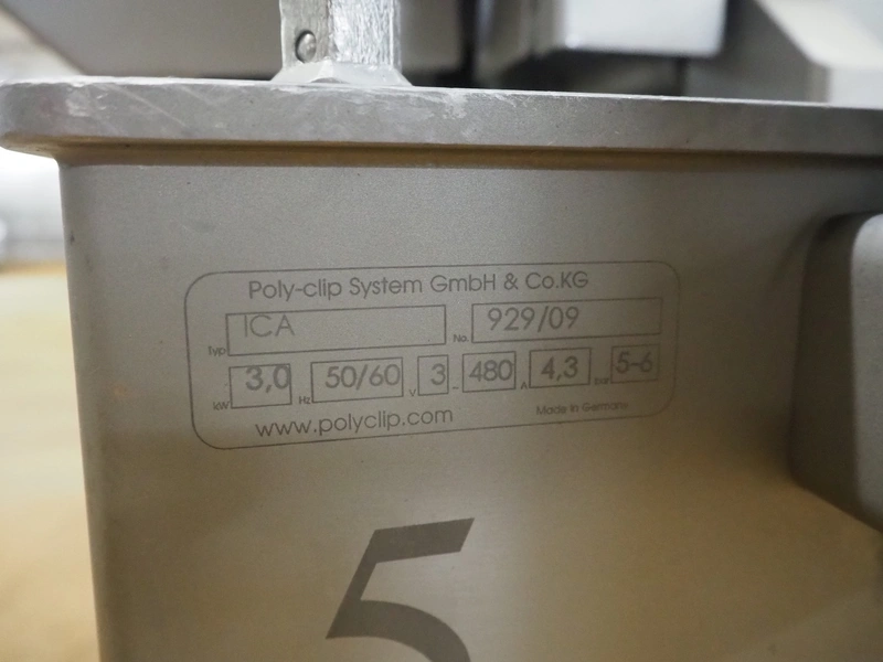 Poly-Clip System mobile double clipper, type: ICA, number: 929, year of construction: 2009, 400 V, 3 Ph, 50/60 Hz, 4.3 A, 3.0 kW, plastic outfeed belt, belt width: 180 mm, total dimensions: 2650 mm x 1000 mm x 1920 mm.