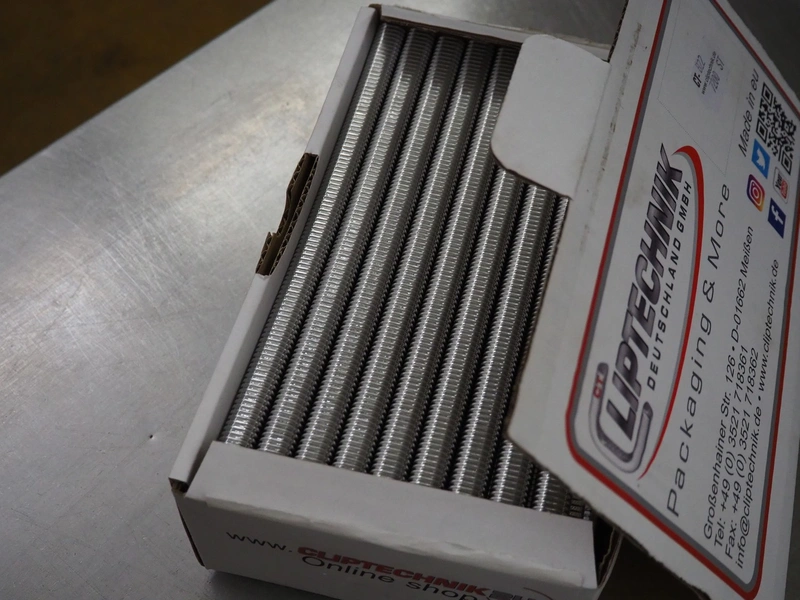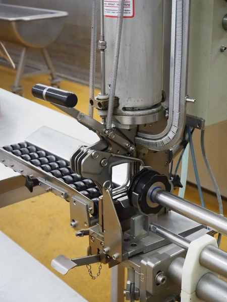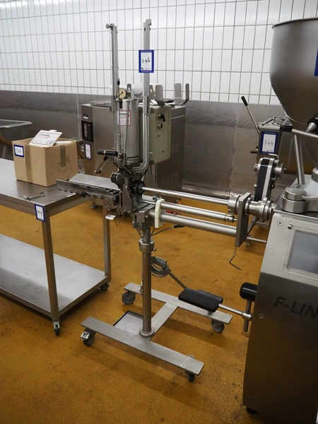 Tipper Tie Technopack GmbH mobile double clipper, type: KDCN.037.020, plastic outfeed rollers, roller width: 90 mm, total dimensions: 1100 mm x 600 mm x 1850 mm. With box with clips.