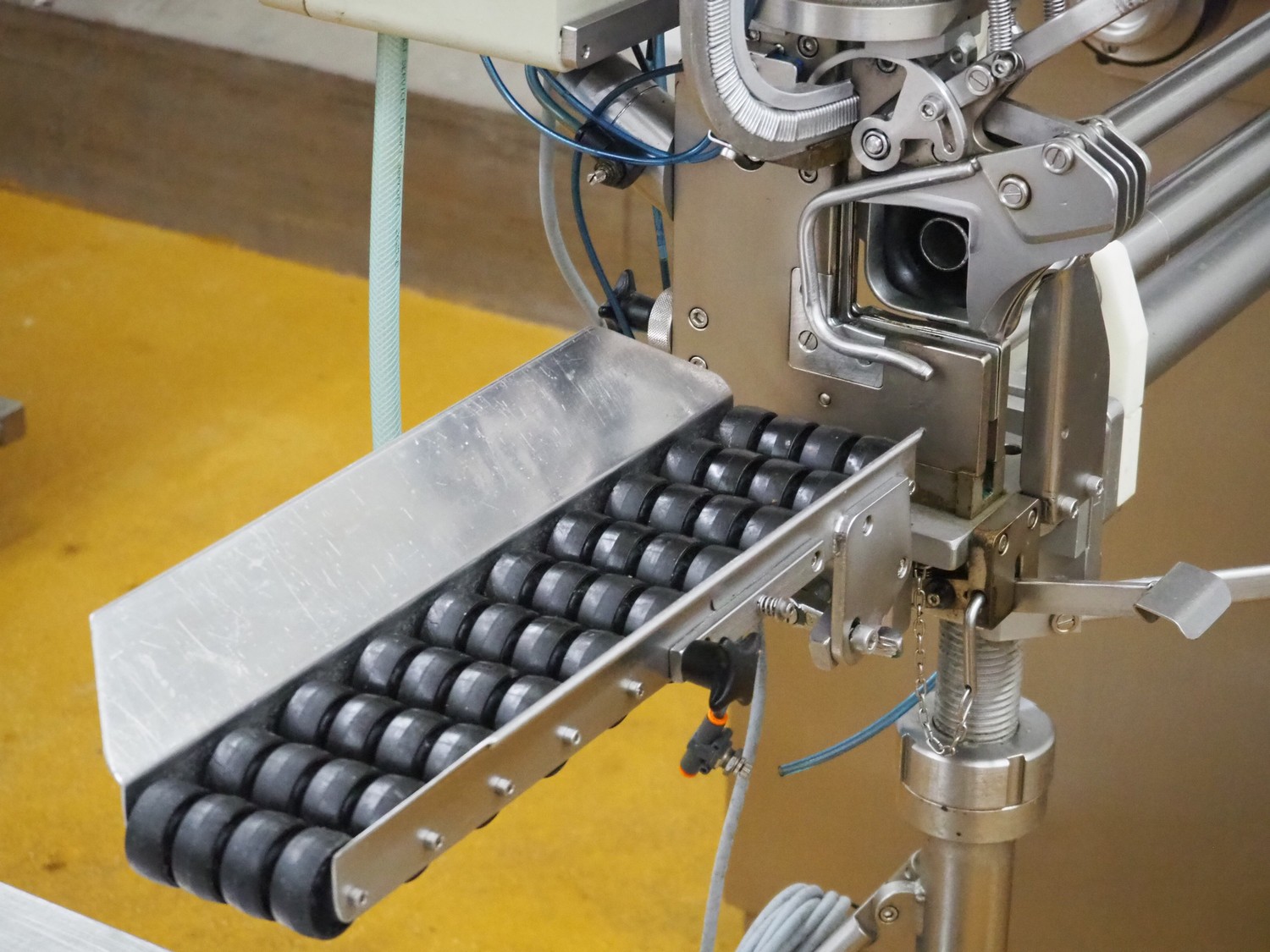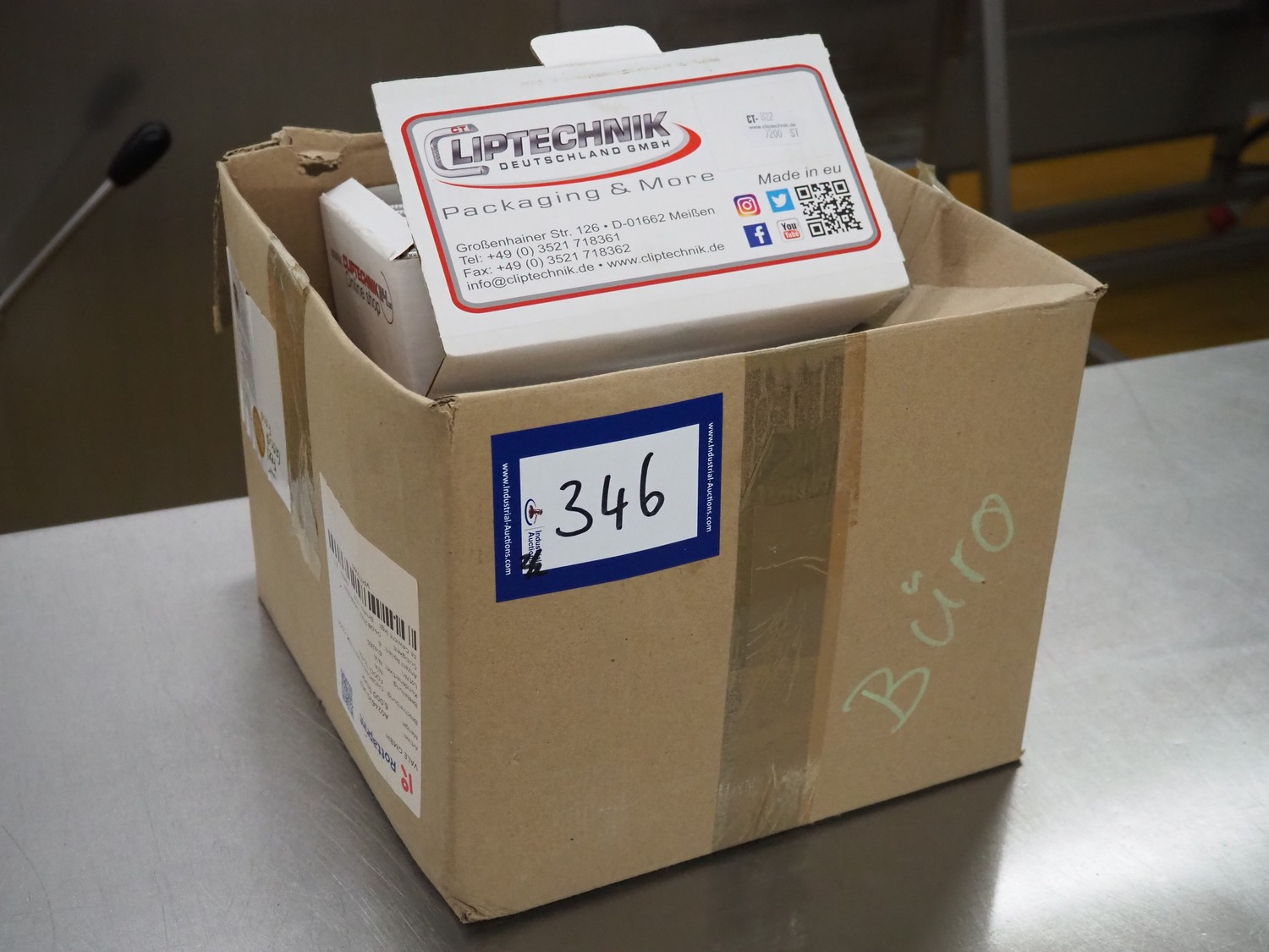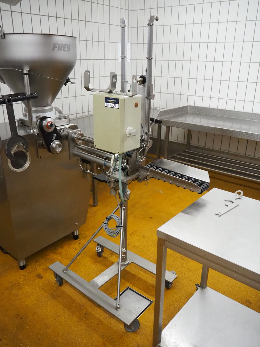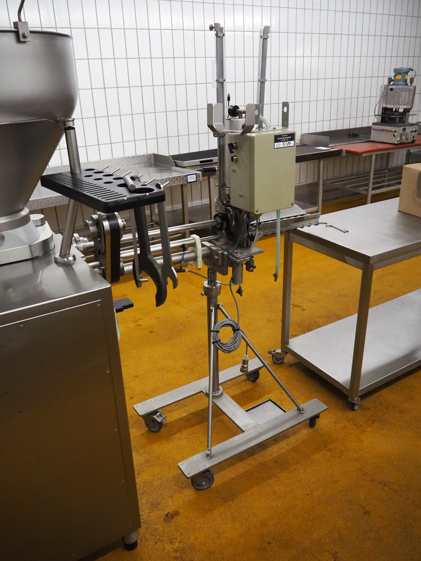 Tipper Tie Technopack GmbH mobile double clipper, type: KDCN.037.020, plastic outfeed rollers, roller width: 90 mm, total dimensions: 1100 mm x 600 mm x 1850 mm. With box with clips.