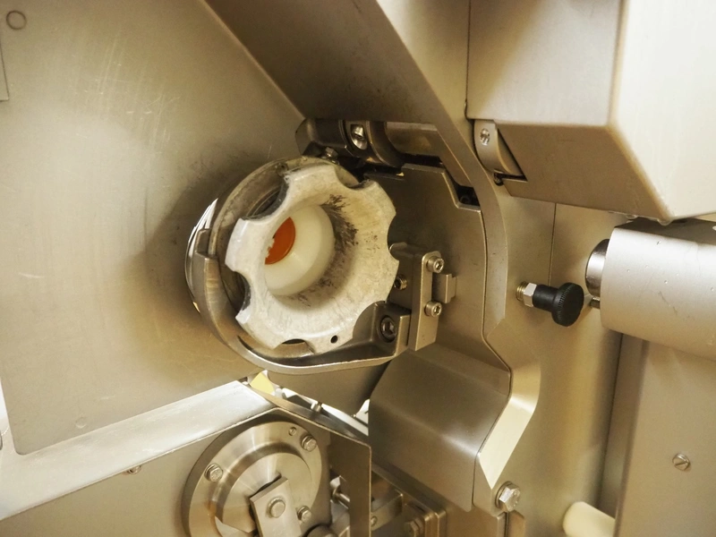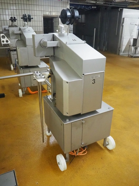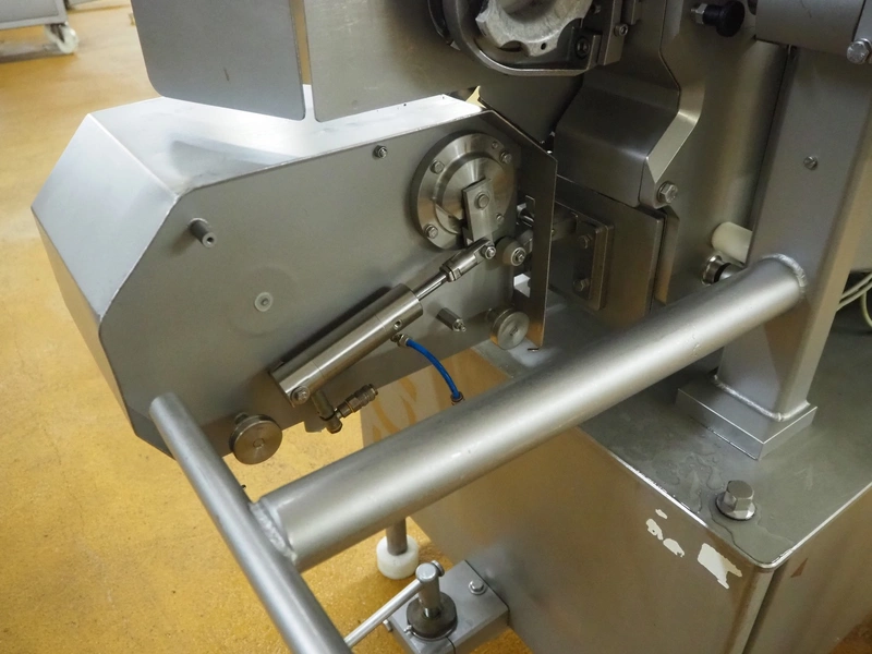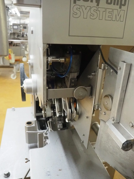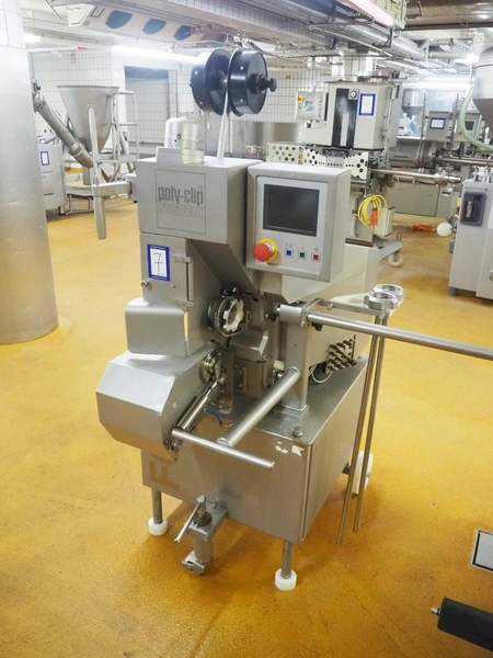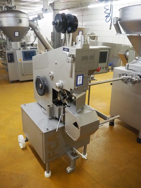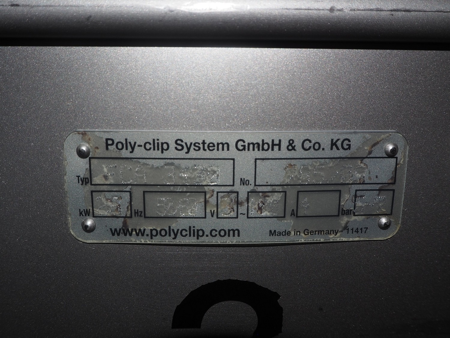 Poly-Clip System mobile double clipper, type: FCA 3430, number: 785, year of construction: 2009, 400 V, 3 Ph, 50/60 Hz, 4 A, 2.8 kW, dimensions: 1750 mm x 1200 mm x 1800 mm. Missing outfeed slide.