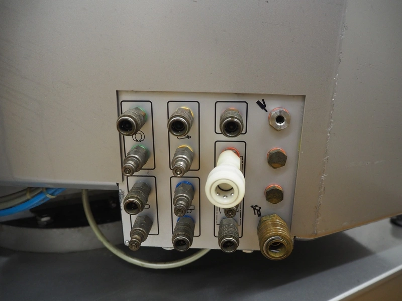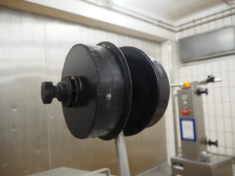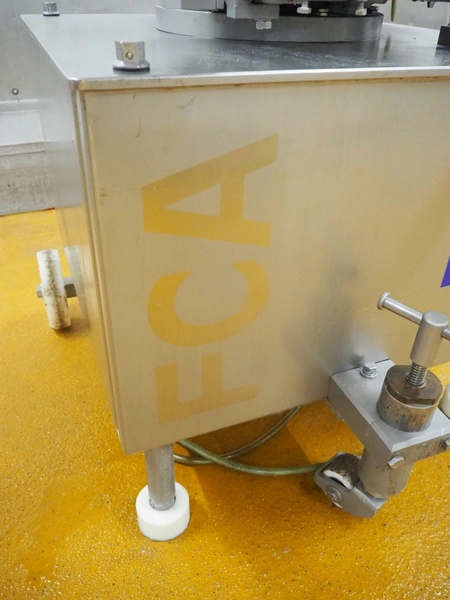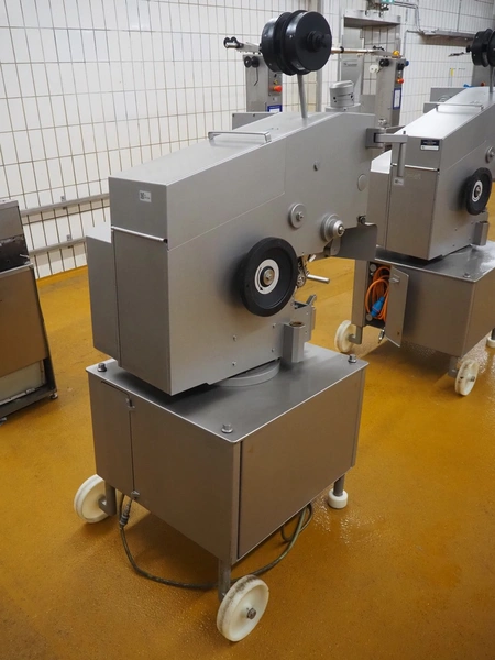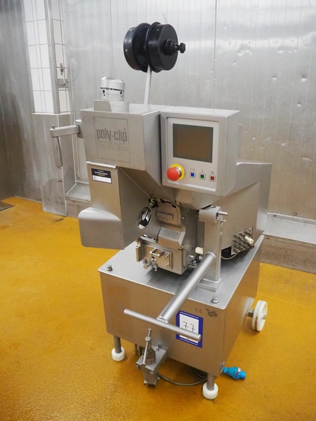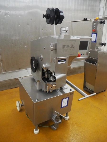 Poly-Clip System mobile double clipper, type FCA 3430, dimensions: 1250 mm x 900 mm x 1800 mm. Missing outfeed slide.