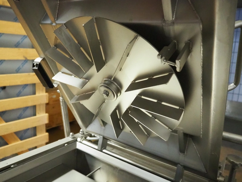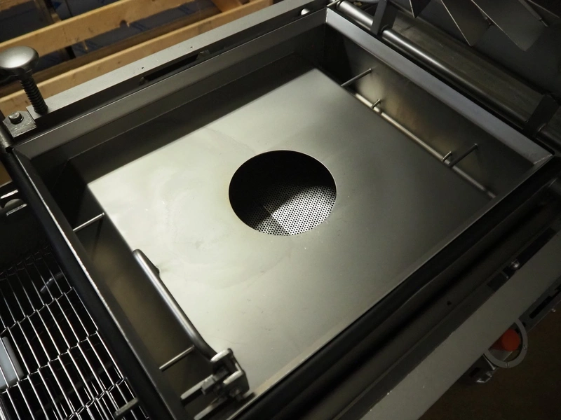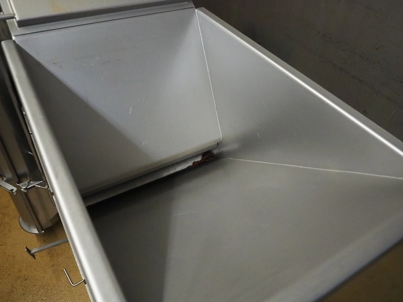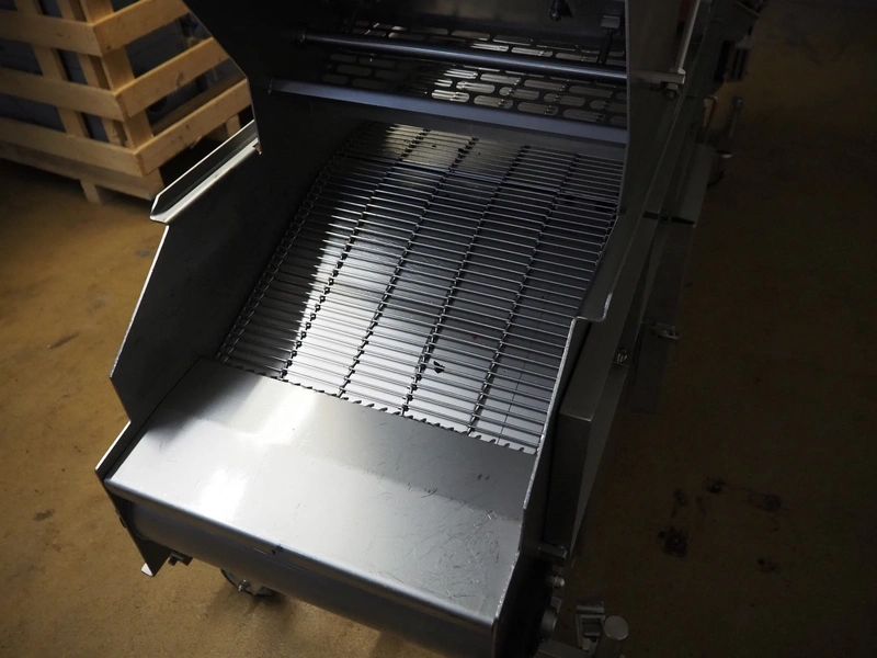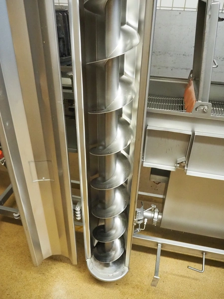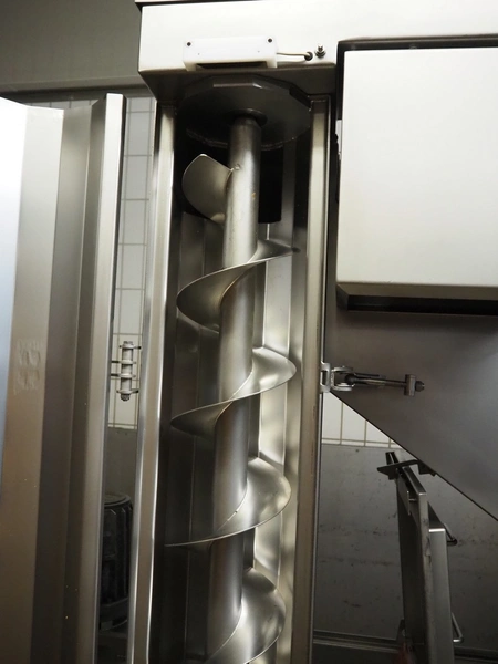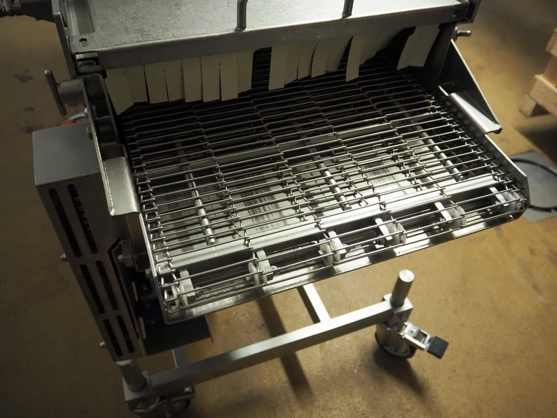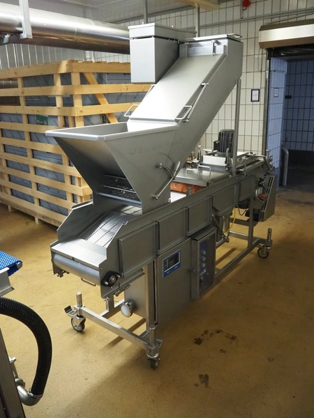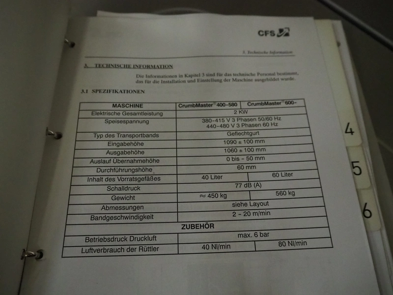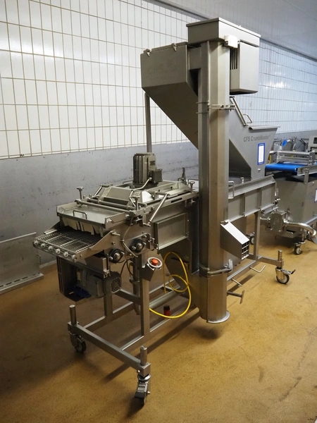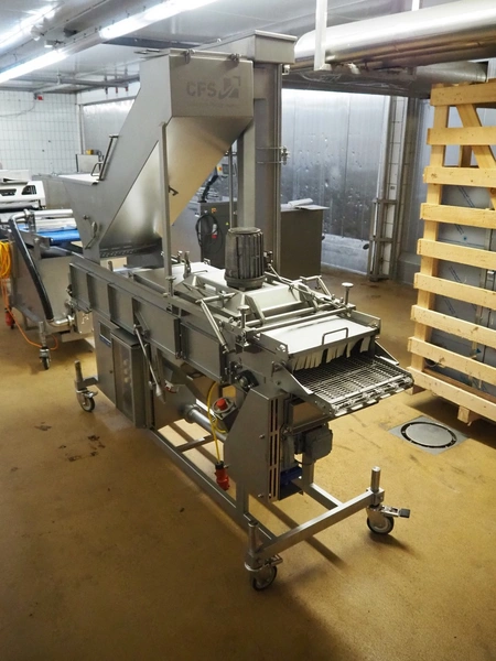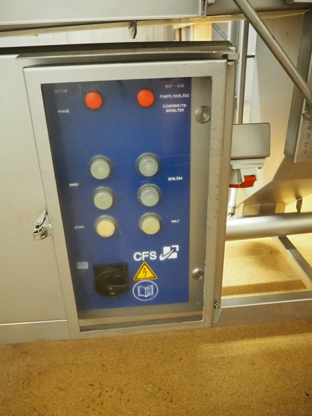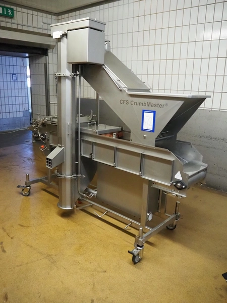 CFS mobile breading machine, type: CRM400, machine number: 580, year of construction: 2008, 400 V, 3 Ph, 50 Hz, 5 A, 1.6 kW, 450 kg, s/s mesh belt, belt width: 400 mm, s/s screw, diameter screw: 185 mm, tier: 170 mm, total dimensions: 2650 mm x 950 mm x 2250 mm. Including extra mesh belts.