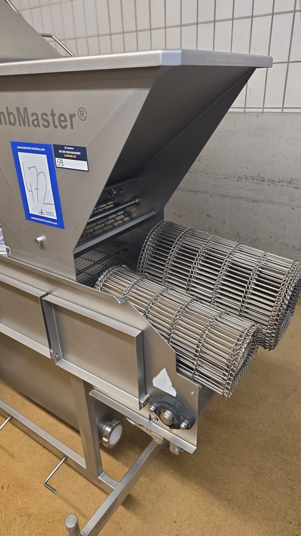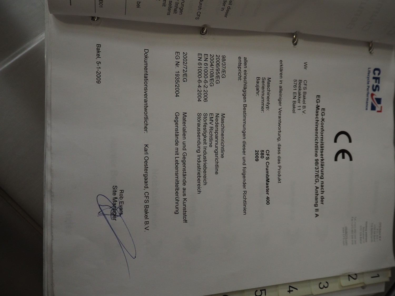 CFS mobile breading machine, type: CRM400, machine number: 580, year of construction: 2008, 400 V, 3 Ph, 50 Hz, 5 A, 1.6 kW, 450 kg, s/s mesh belt, belt width: 400 mm, s/s screw, diameter screw: 185 mm, tier: 170 mm, total dimensions: 2650 mm x 950 mm x 2250 mm. Including extra mesh belts.