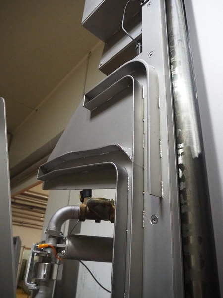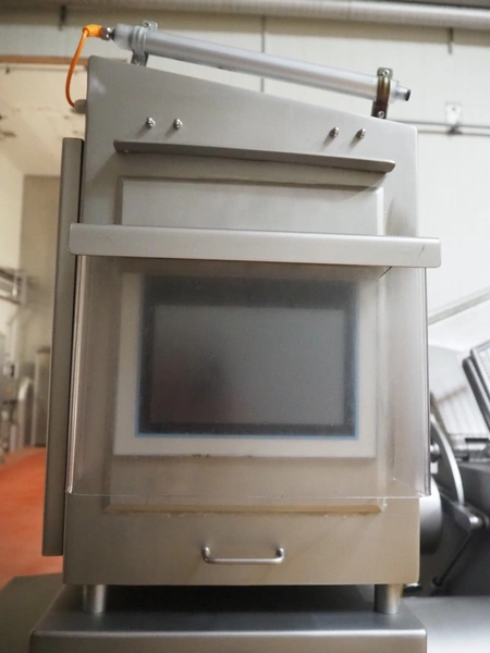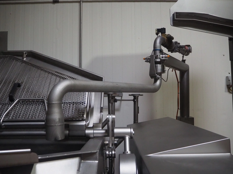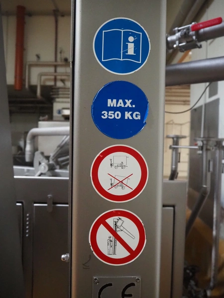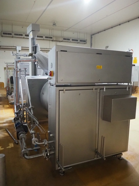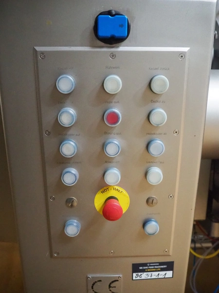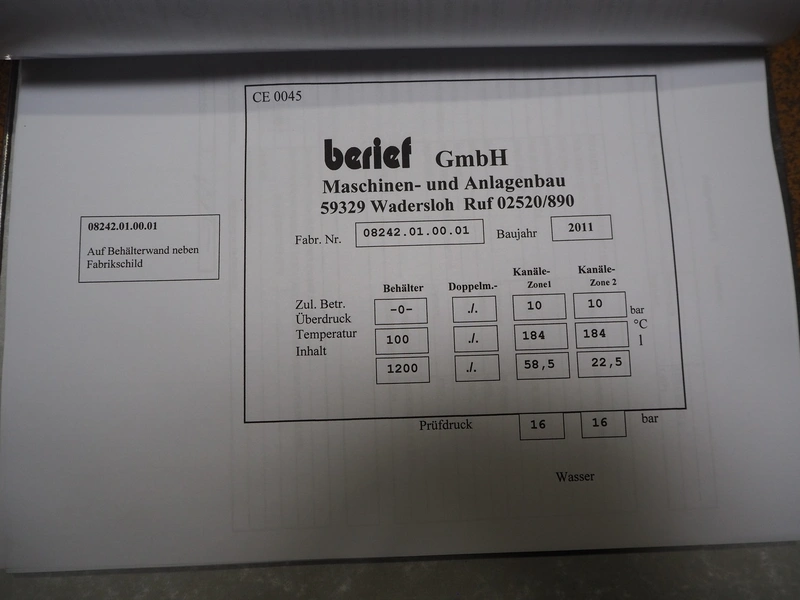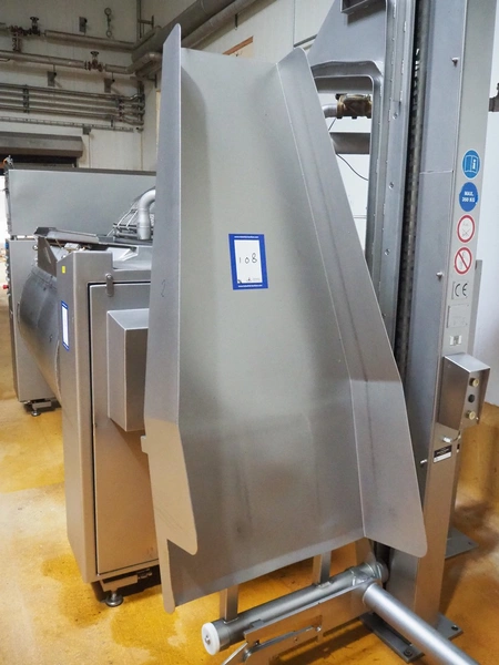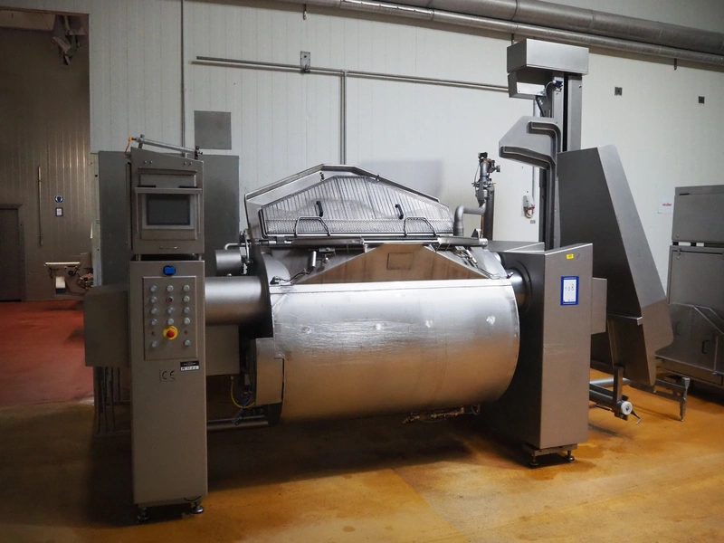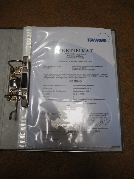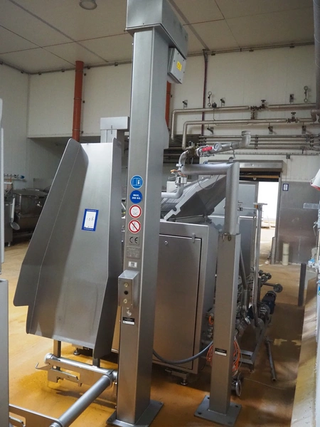 Berief tiltable cooking and roasting vessel with mixing arm and lifter for meat bins, fabrication number: 08242.01.01, year of construction: 2011, volume: 1200 liter, dimensions: 3200 mm x 2000 mm x 2330 mm, dimensions lifter: 1500 mm x 1250 mm x 3250 mm.