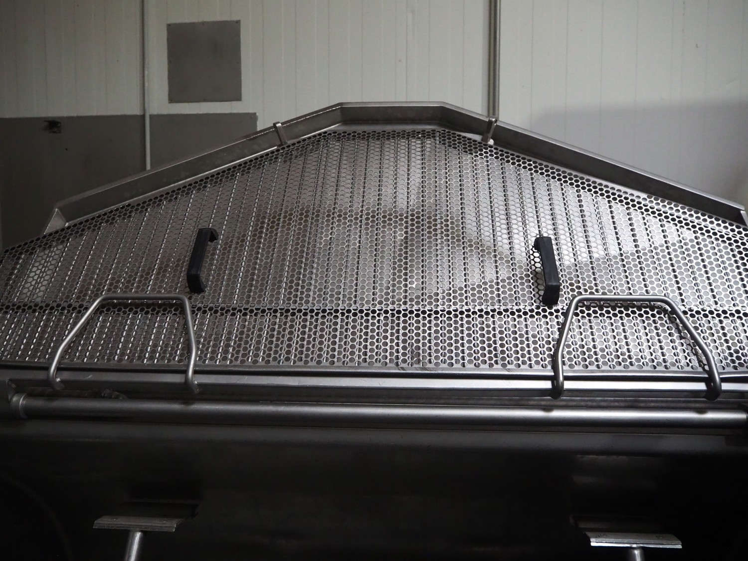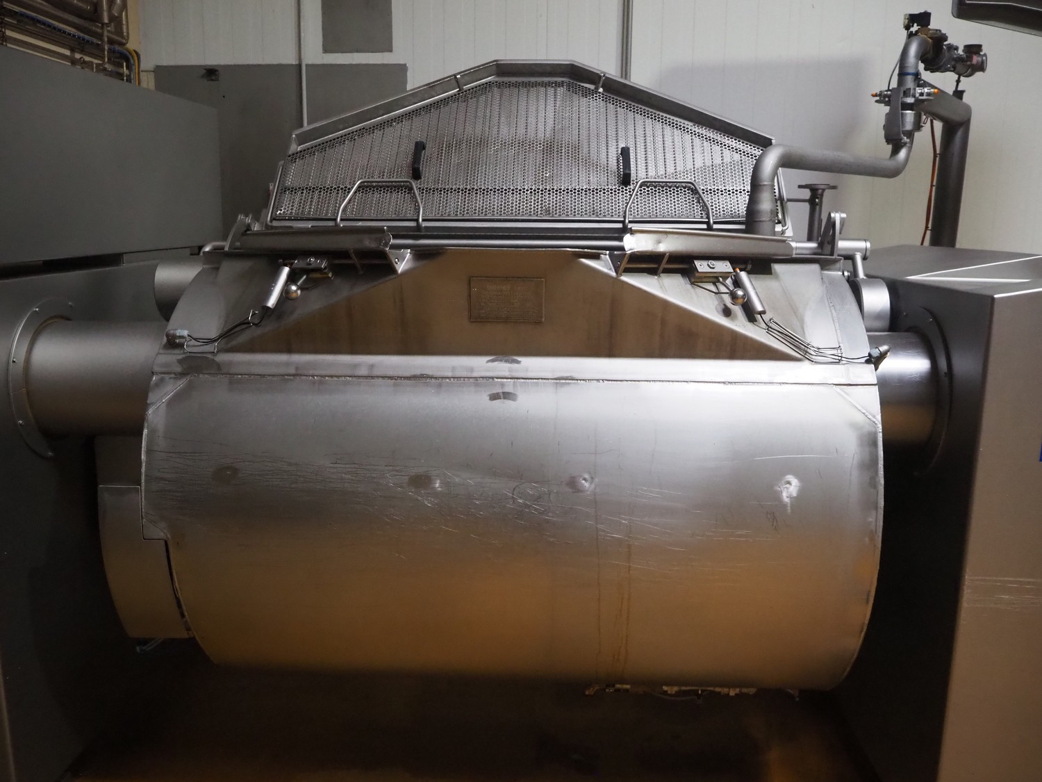 Berief tiltable cooking and roasting vessel with mixing arm and lifter for meat bins, fabrication number: 08242.01.01, year of construction: 2011, volume: 1200 liter, dimensions: 3200 mm x 2000 mm x 2330 mm, dimensions lifter: 1500 mm x 1250 mm x 3250 mm.