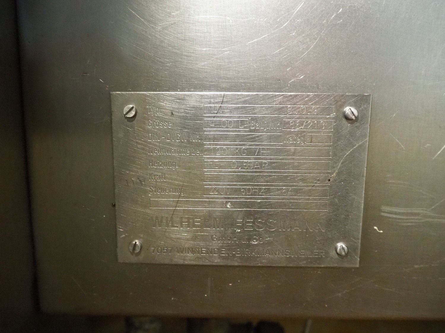 Fessmann cooking vessel, type: NOVA 8.0.9, number: 213, year of construction: 1986, 220 V, 50 Hz, 6 A, volume: 400 liter, 220 V, 50 Hz, 6 A, dimensions: 1200 mm x 1300 mm x 1100 mm.