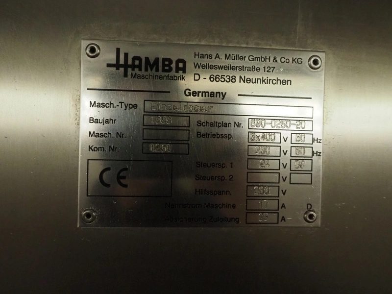Hamba Maschinenfabrik dosing machine, machine type: Einzeldoseur, serial number: 0250, year of construction: 1999, 3 x 400 V, 17 A, Raff + Grund tank, volume: 130 liter, 3 bar, dimensions tank: 700 mm x 420 mm x 450 mm, diameter pipe: 30 mm, total dimensions: 1800 mm x 970 mm x 2400 mm.