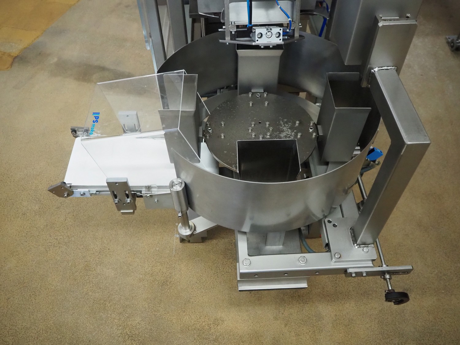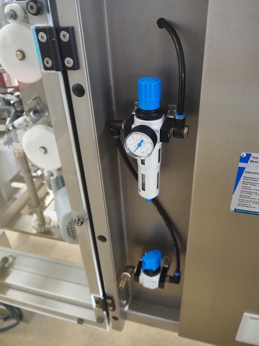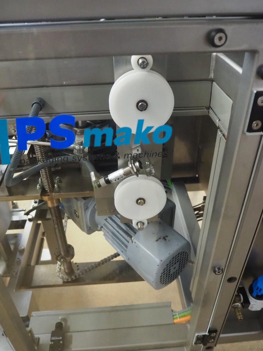 P+S Mako mobile bag filling and clipping machine, type: DC 60-CSP, machine number: 70.199, year of construction: 2004, 400 V, 3 Ph, 50 Hz, 4 A, dimensions chamber: 140 mm x 120 mm, plastic outfeed belt, belt width: 200 mm, total dimensions: 1800 mm x 1200 mm x 1900 mm.