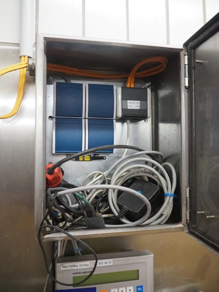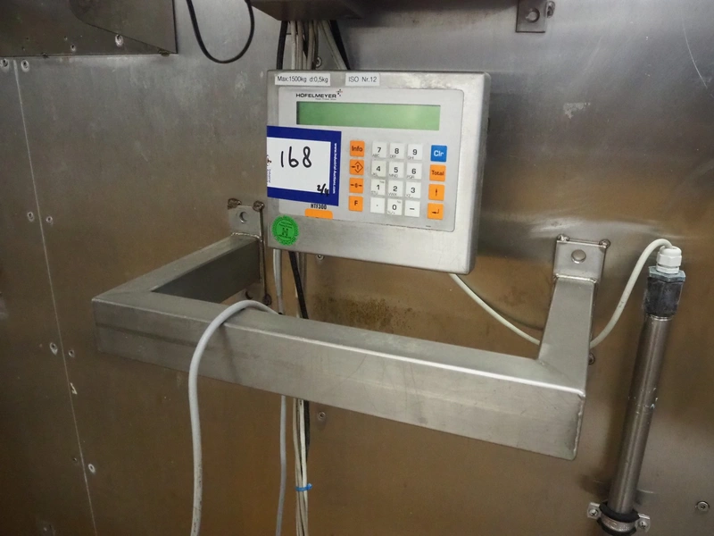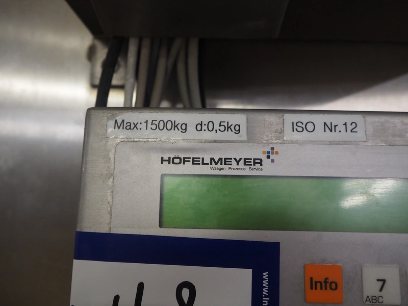 Höfelmeyer Waagen GmbH floor weighing scale, maximum: 1500 kg, d: 0.5 kg, dimensions scale: 1250 mm x 1500 mm, Höfelmeyer Waagen GmbH indicator, model: HTF 300, serial number: 040442, last calibrated: 11-2023. With s/s film roll holder.