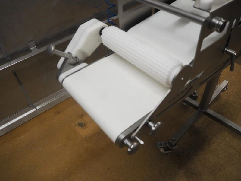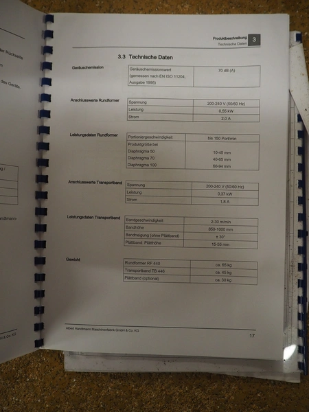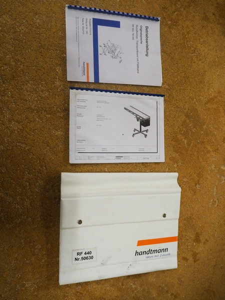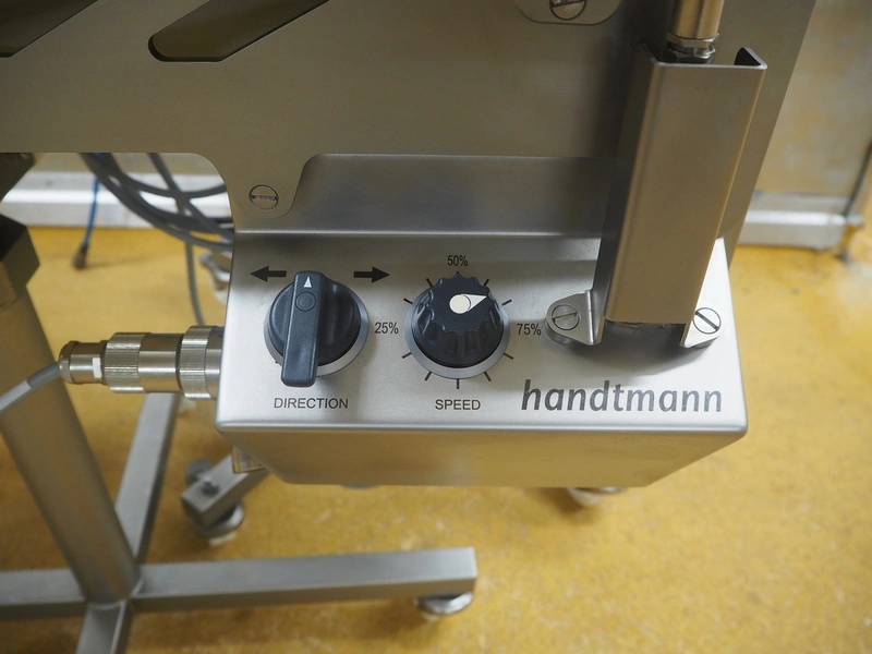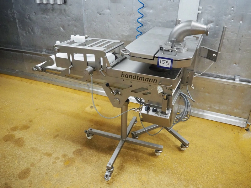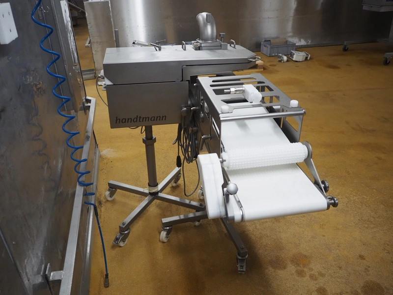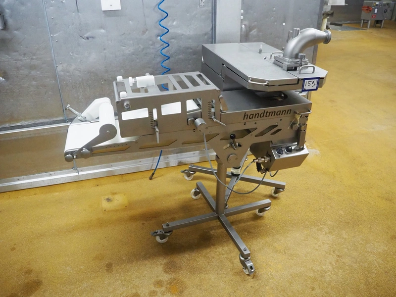 Handtmann mobile diaphragm, type: RF440, number: 50630, year of construction: 2023, 200/240 V, 2 A, 0.55 kW, diameter head: 140 mm, plastic belts, belt width: 300 mm, roller width: 300 mm, total dimensions: 1500 mm x 1000 mm x 1350 mm. With 2 pallets with parts.