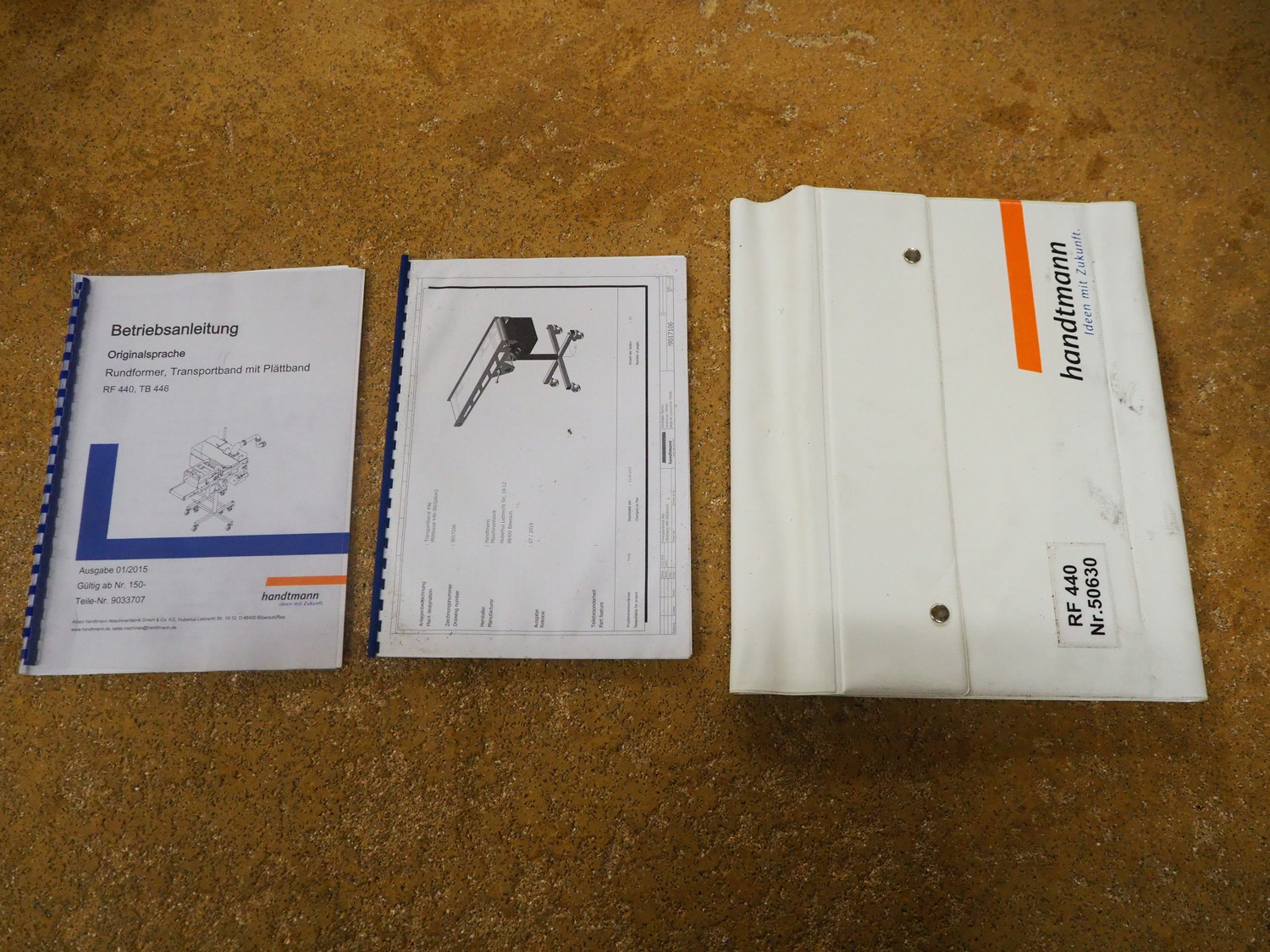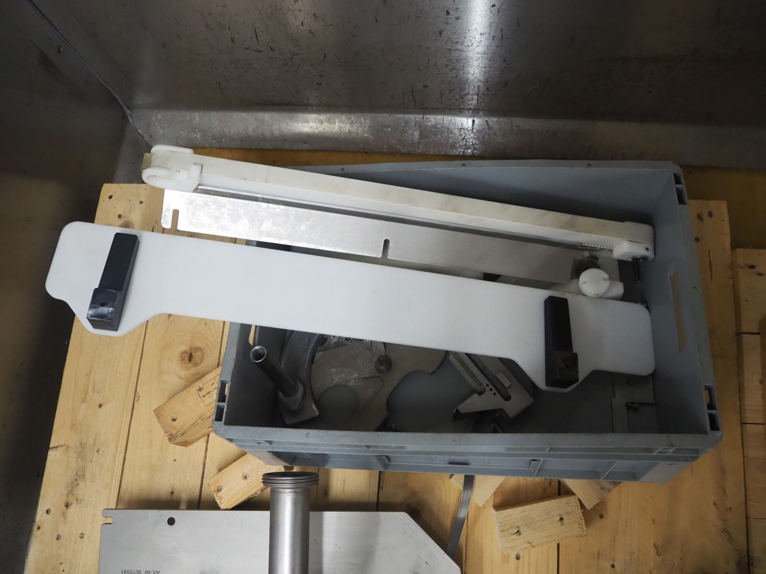 Handtmann mobile diaphragm, type: RF440, number: 50630, year of construction: 2023, 200/240 V, 2 A, 0.55 kW, diameter head: 140 mm, plastic belts, belt width: 300 mm, roller width: 300 mm, total dimensions: 1500 mm x 1000 mm x 1350 mm. With 2 pallets with parts.