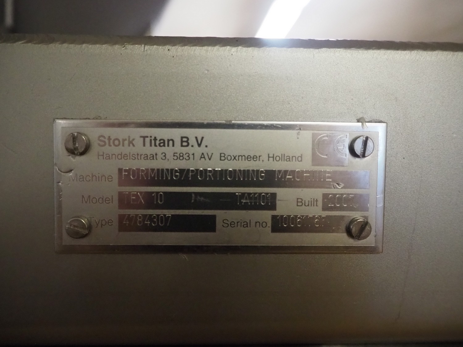 Stork Titan B.V. mobile forming and portioning machine, model: TEX 10, serial number: 10061767, year of construction: 2007, diameter worm: 150 mm, total dimensions: 2200 mm x 1700 mm x 2450 mm. Missing worm and plates.