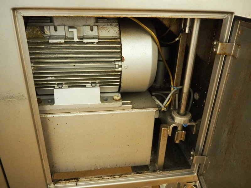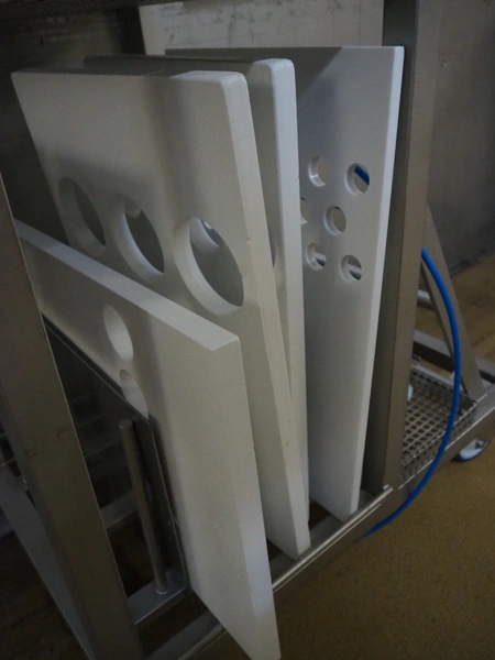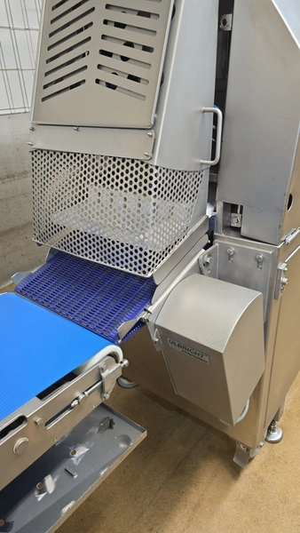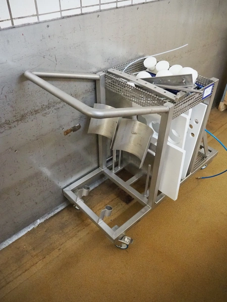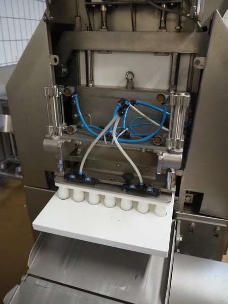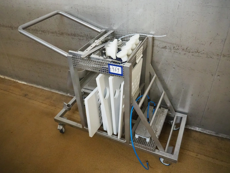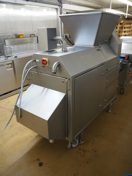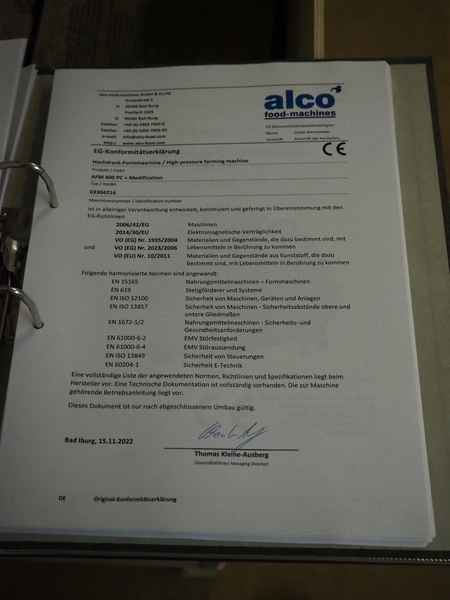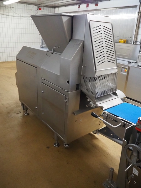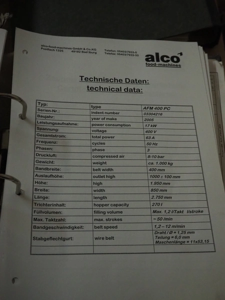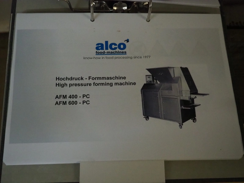Alco Food-Machines GmbH&Co.KG mobile forming machine, type: AFM 400-PC, serial number: 03304216, year of construction: 2005, 400 V, 17 kW, plastic mesh outfeed belt, belt width: 400 mm, dimensions dye: Ø 40 mm, total dimensions: 2600 mm x 850 mm x 1950 mm. With tool trolley with forming plates, dimensions: 1300 mm x 600 mm x 2100 mm.