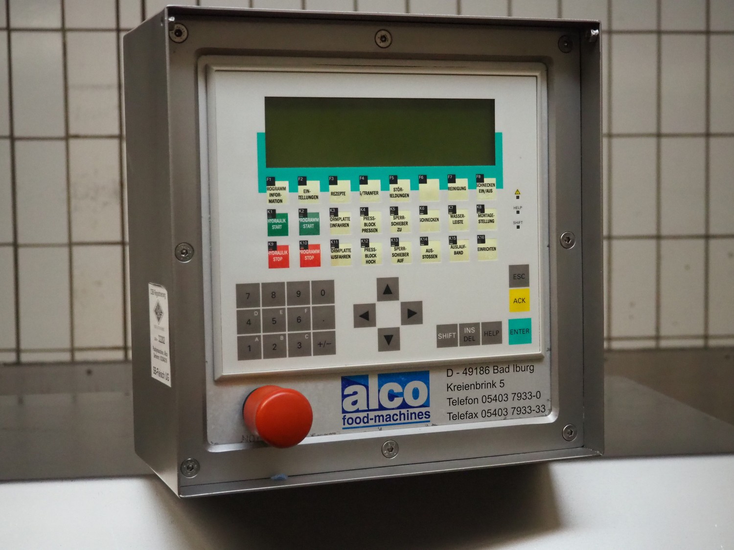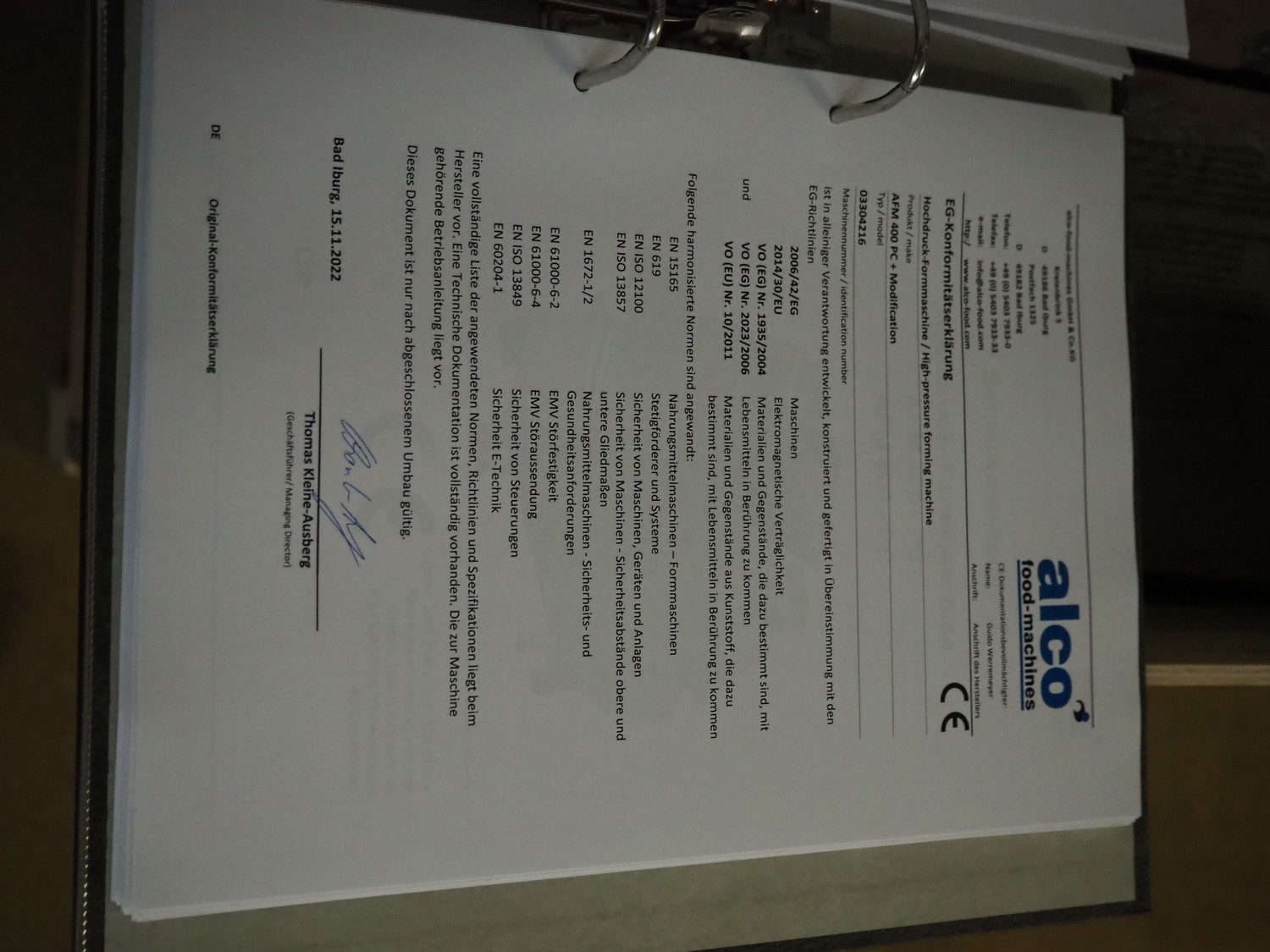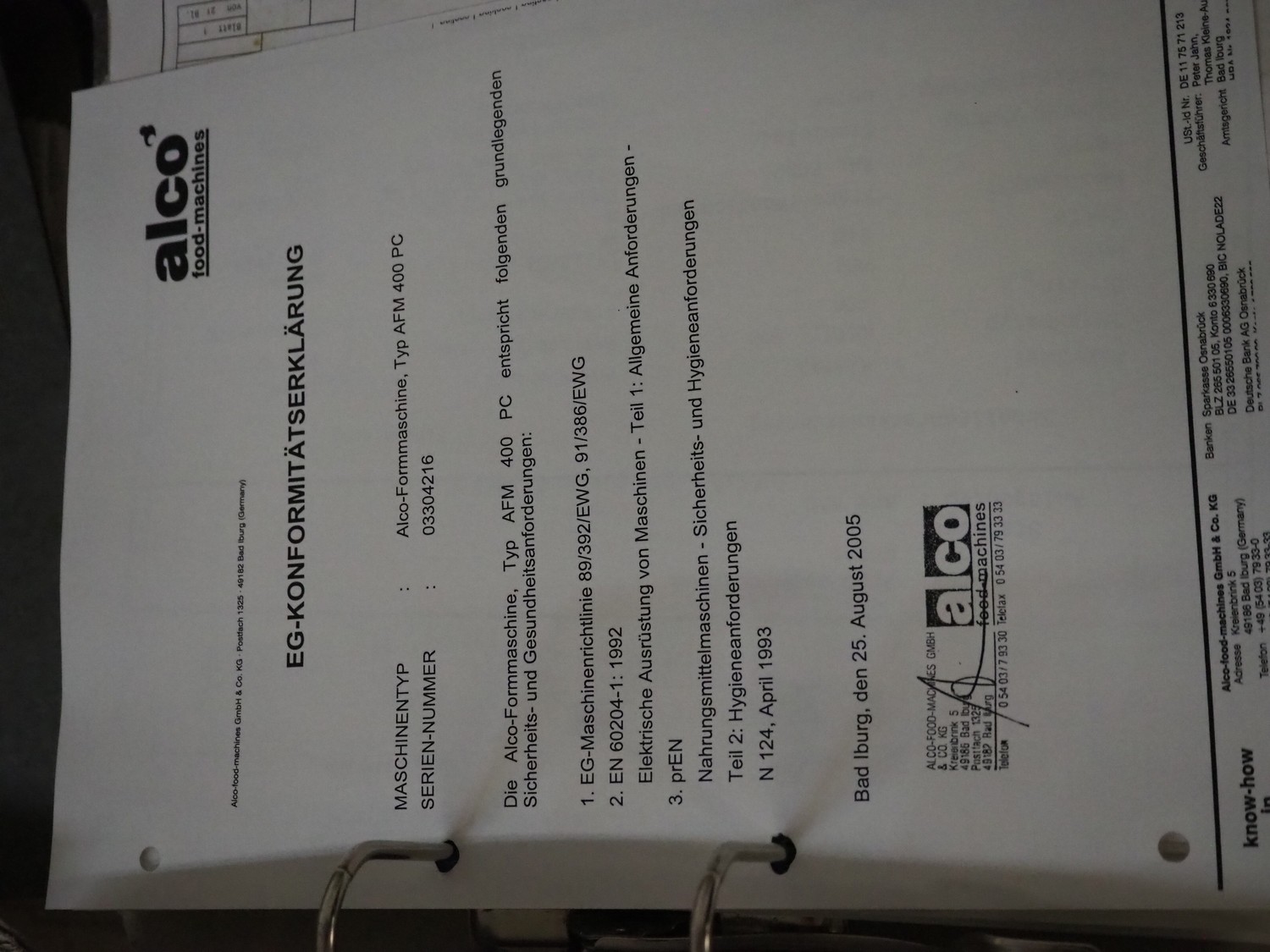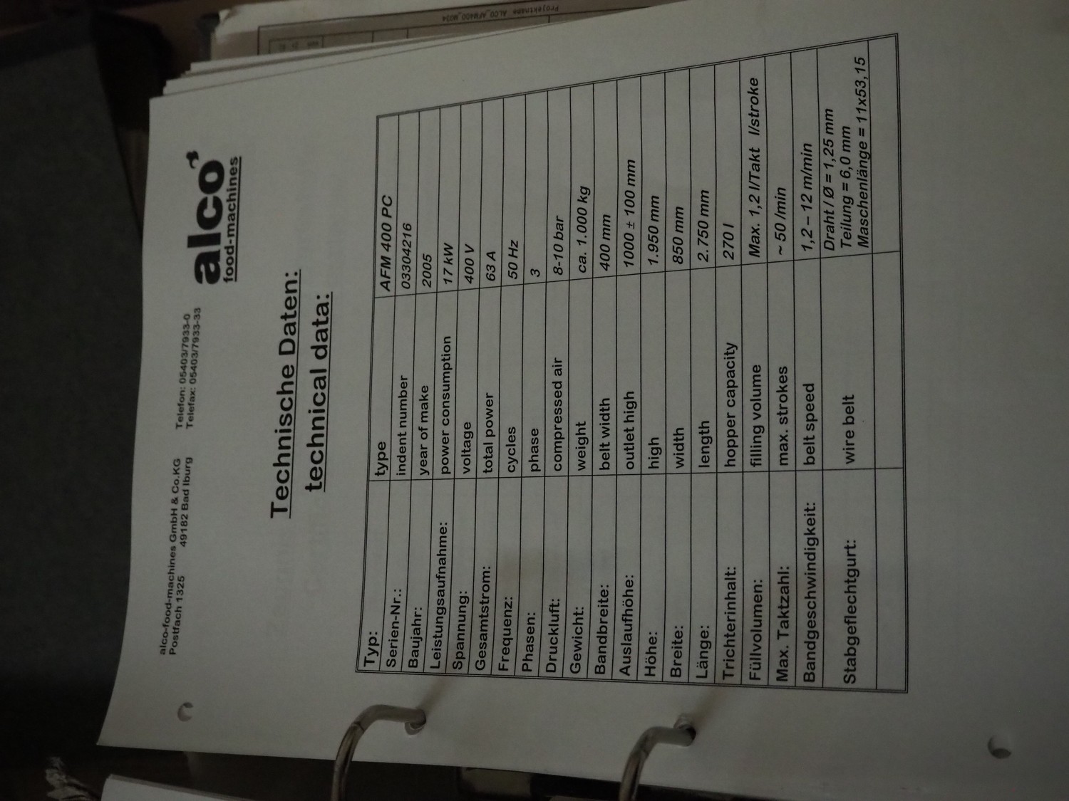 Alco Food-Machines GmbH&Co.KG mobile forming machine, type: AFM 400-PC, serial number: 03304216, year of construction: 2005, 400 V, 17 kW, plastic mesh outfeed belt, belt width: 400 mm, dimensions dye: Ø 40 mm, total dimensions: 2600 mm x 850 mm x 1950 mm. With tool trolley with forming plates, dimensions: 1300 mm x 600 mm x 2100 mm.