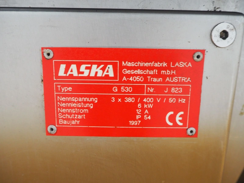 Laska frozen block cutter, type: G 530, number: J 823, year of construction: 1997, 380/400 V, 3 Ph, 50 Hz, 6 kW, 12 A, maximum block size: 520 mm x 400 mm, total dimensions: 2650 mm x 950 mm x 1800 mm.