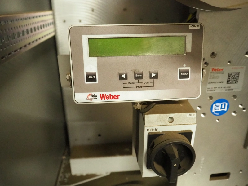 Weber pallet labeller, type: Legi-Air 4050P (V2), serial number: 50038350, year of construction: 12/2019, 100-240 V, 50/60 Hz, 1200 Watt, 5 bar, dimensions labeller: 800 mm x 1040 mm x 2000 mm.