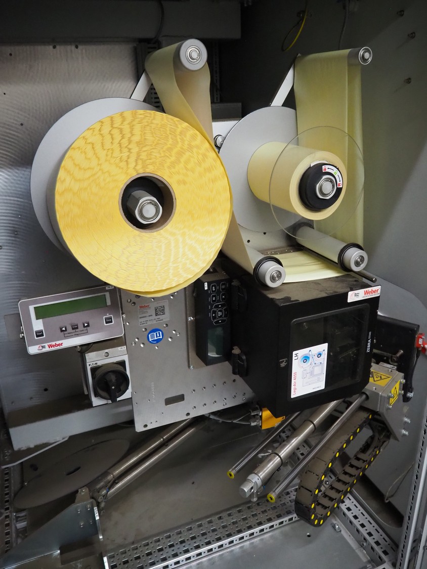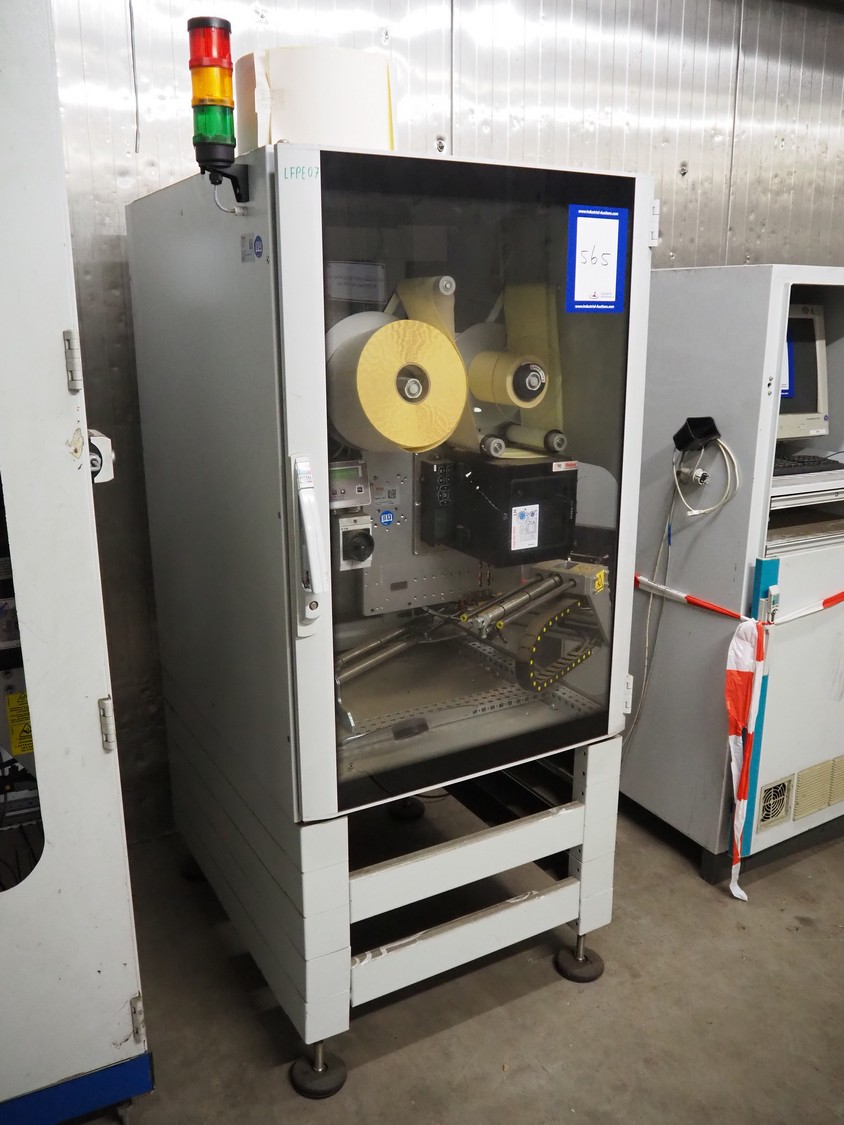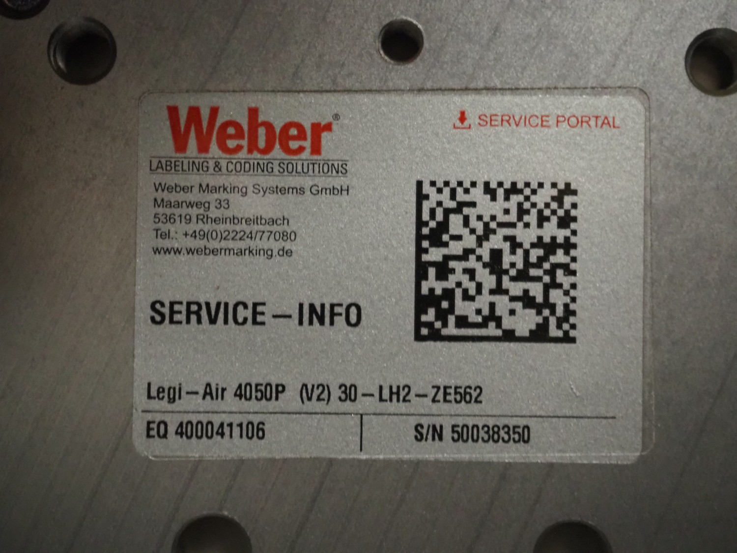 Weber pallet labeller, type: Legi-Air 4050P (V2), serial number: 50038350, year of construction: 12/2019, 100-240 V, 50/60 Hz, 1200 Watt, 5 bar, dimensions labeller: 800 mm x 1040 mm x 2000 mm.