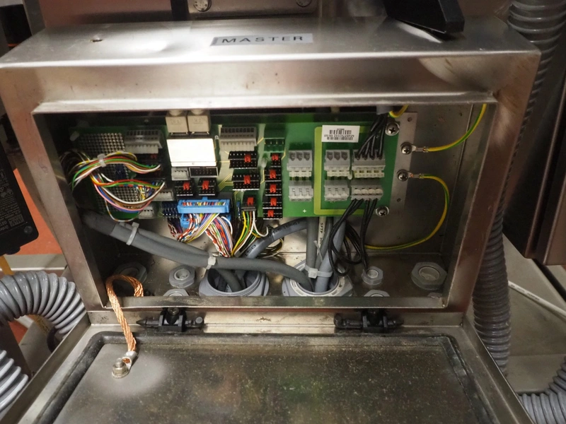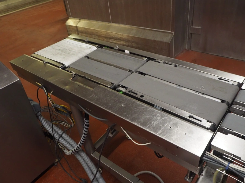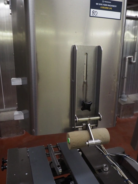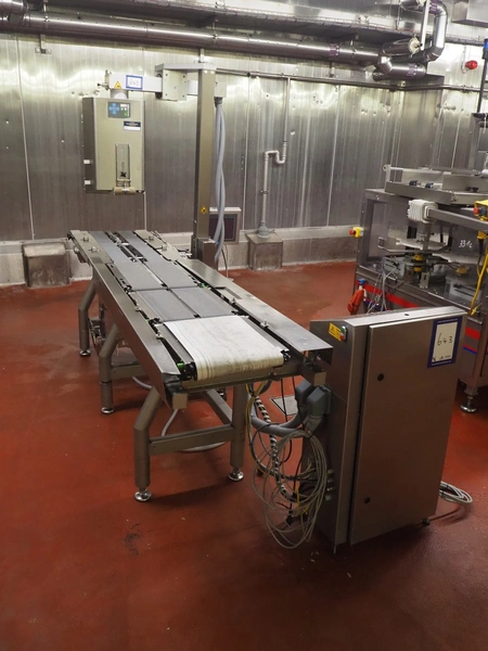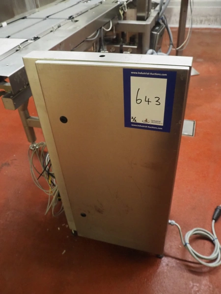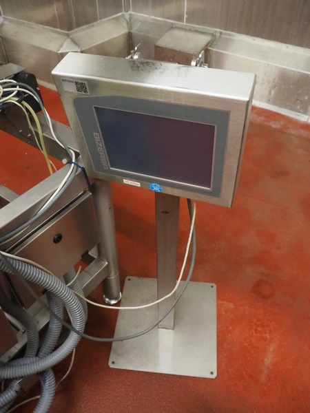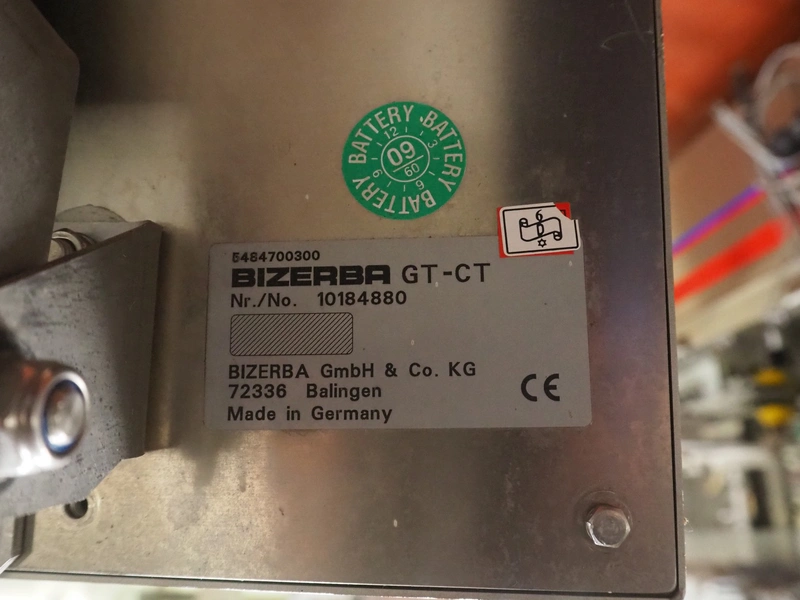 Bizerba labeler, type: GLM-I, serial number: 10184875, 230 V, 50 Hz, 2.4 A, maximum: 6 kg, minimum: 20 g, type labeller: GT-CT, number: 10184880, plastic belt, belt width: (1x) 300 mm, (4x) 140 mm, (2x) 90 mm, label width: 130 mm, total dimensions: 2650 mm x 950 mm x 1980 mm. Including display, dimensions: 400 mm x 400 mm x 1080 mm, switch cabinet, dimensions: 580 mm x 340 mm x 1010 mm.