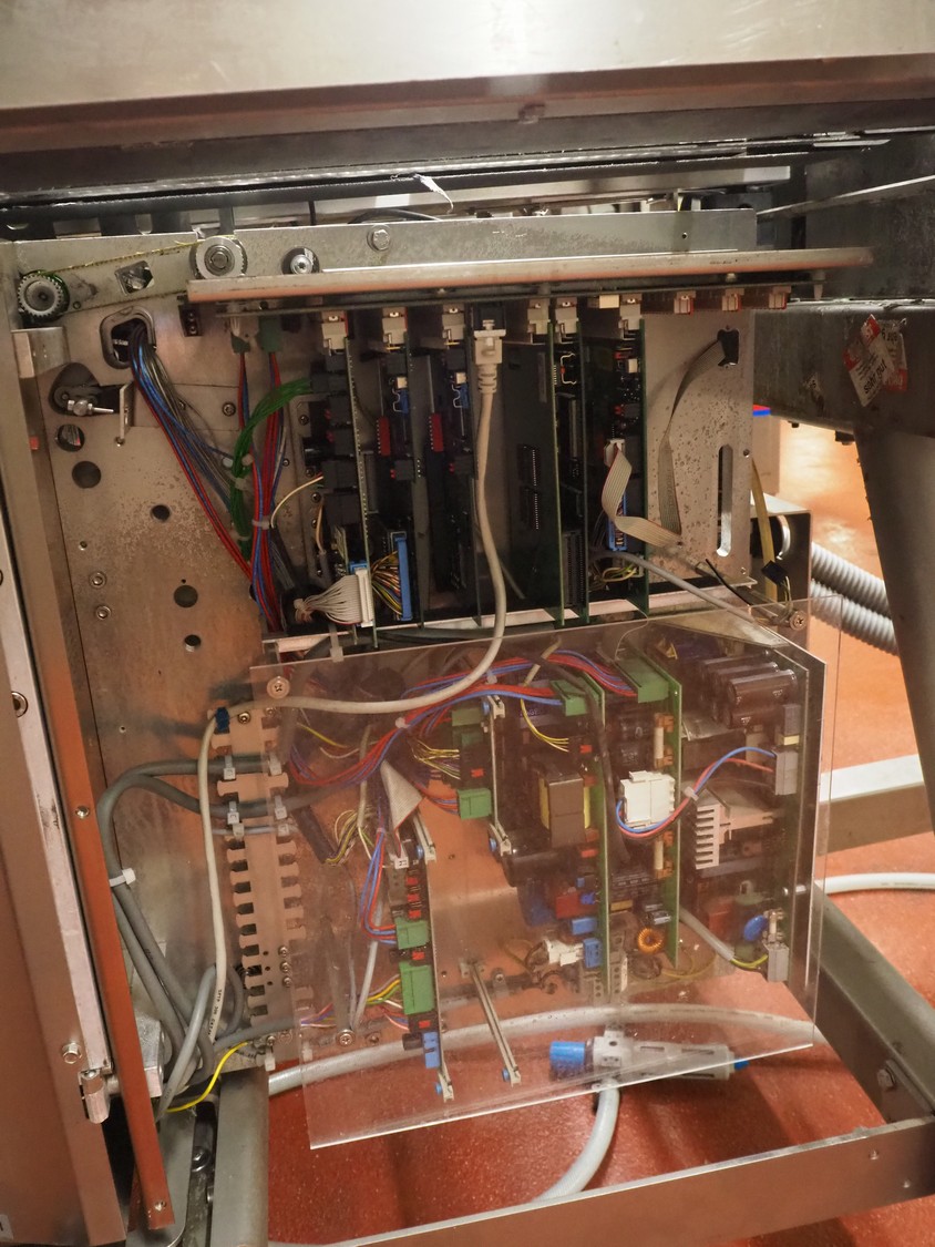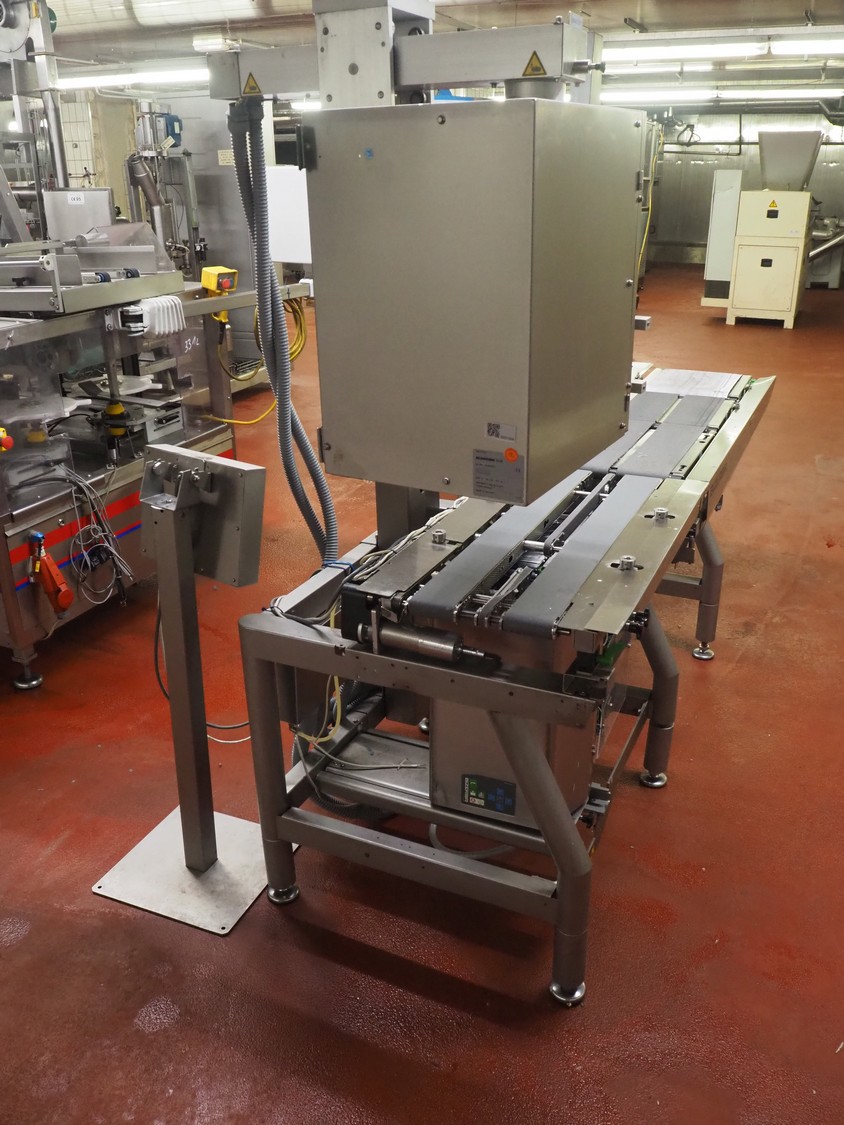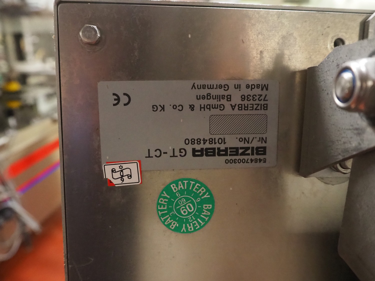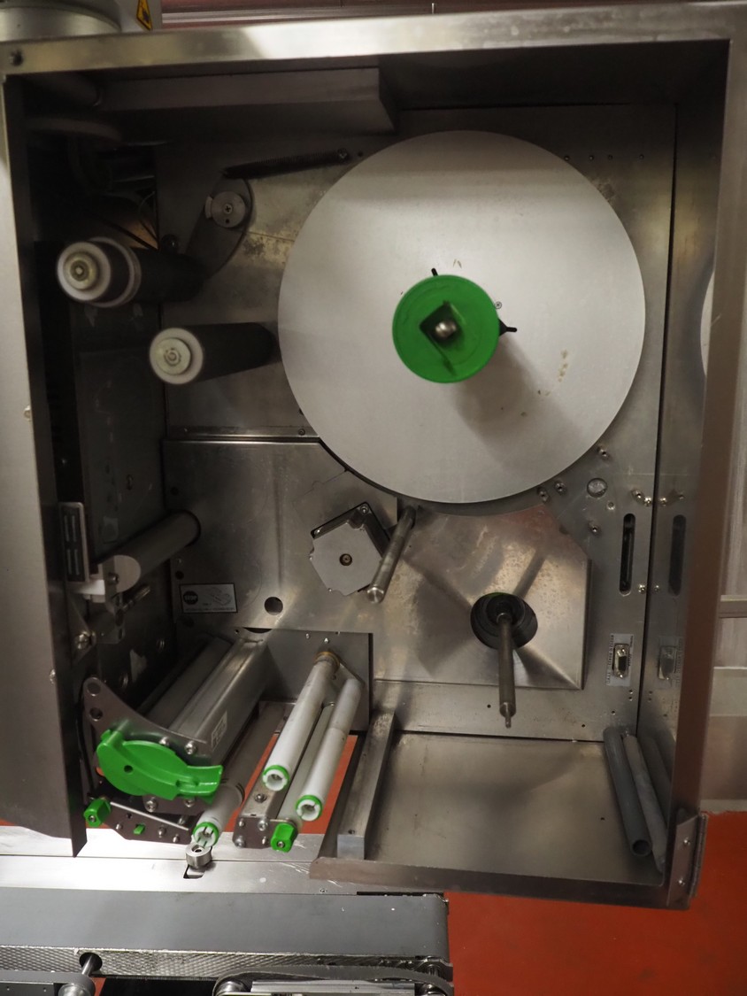 Bizerba labeler, type: GLM-I, serial number: 10184875, 230 V, 50 Hz, 2.4 A, maximum: 6 kg, minimum: 20 g, type labeller: GT-CT, number: 10184880, plastic belt, belt width: (1x) 300 mm, (4x) 140 mm, (2x) 90 mm, label width: 130 mm, total dimensions: 2650 mm x 950 mm x 1980 mm. Including display, dimensions: 400 mm x 400 mm x 1080 mm, switch cabinet, dimensions: 580 mm x 340 mm x 1010 mm.