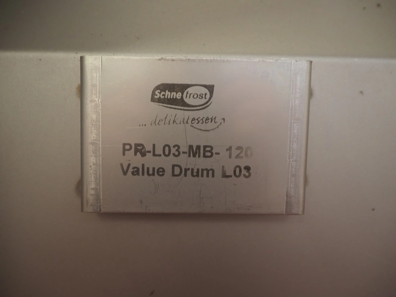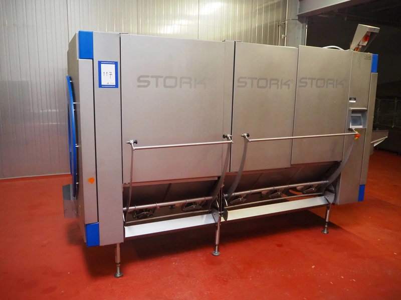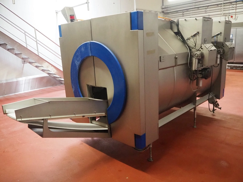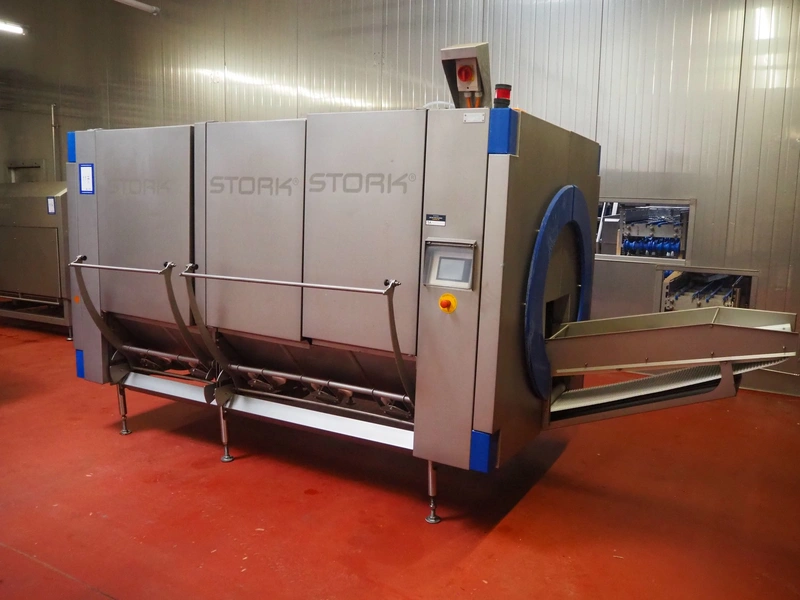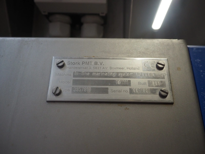 Stork PMT In-line marinating system Valuedrum, model: TB1111, type: 3857819, serial number: 10071881, year of construction: 2009, plastic belt, belt width: 400 mm, total dimensions: 4400 mm x 2250 mm x 2350 mm.