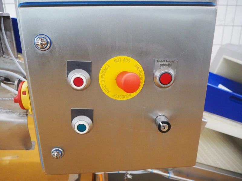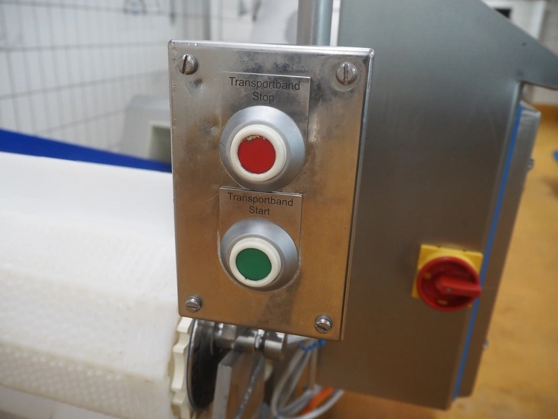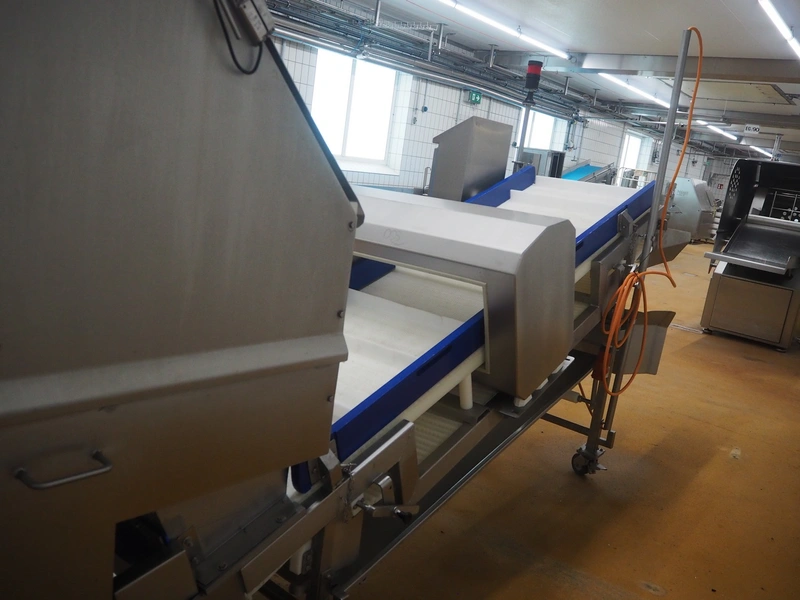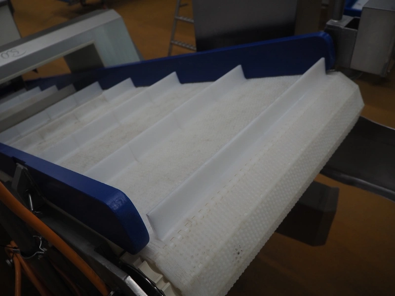 OCS mobile metal detector, plastic elevating belt with dividers, belt width: 670 mm, distance between dividers: 300 mm, divider height: 50 mm, clearance: 700 mm x 225 mm, elevating height: 1300 mm, total dimensions: 3200 mm x 1200 mm x 2000 mm.