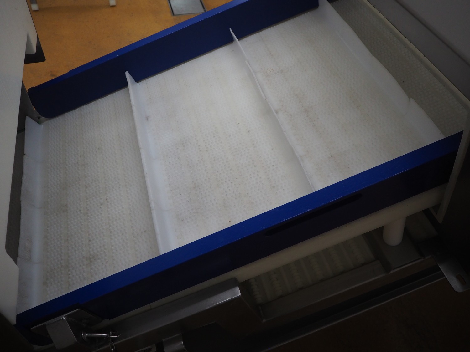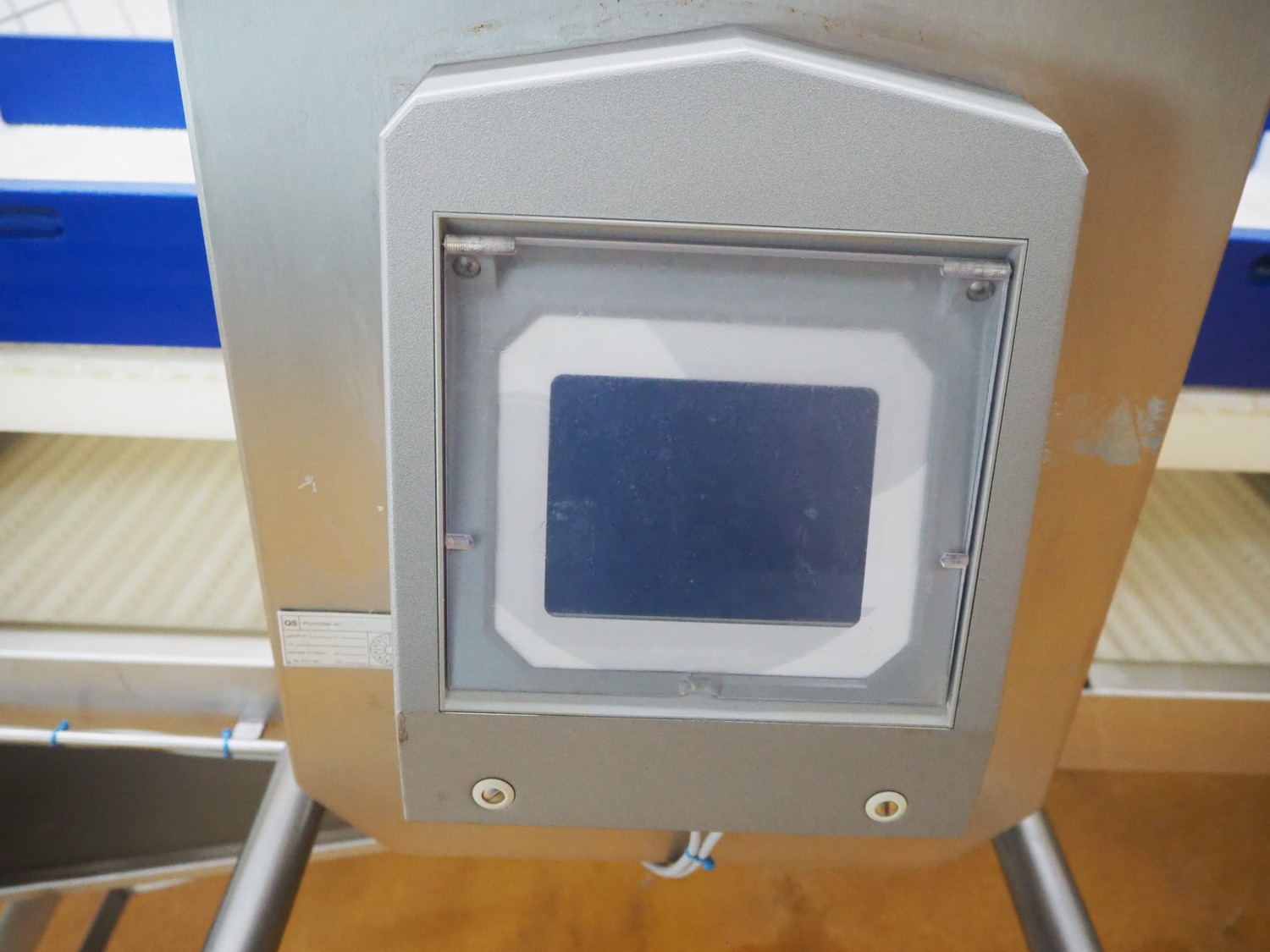 OCS mobile metal detector, plastic elevating belt with dividers, belt width: 670 mm, distance between dividers: 300 mm, divider height: 50 mm, clearance: 700 mm x 225 mm, elevating height: 1300 mm, total dimensions: 3200 mm x 1200 mm x 2000 mm.