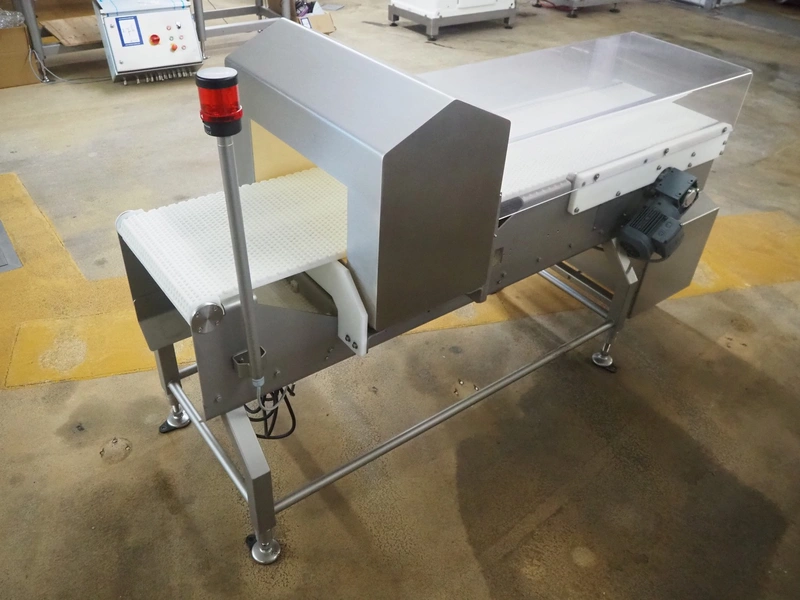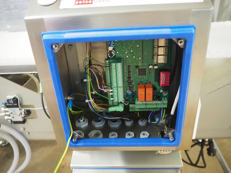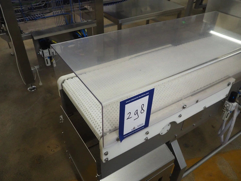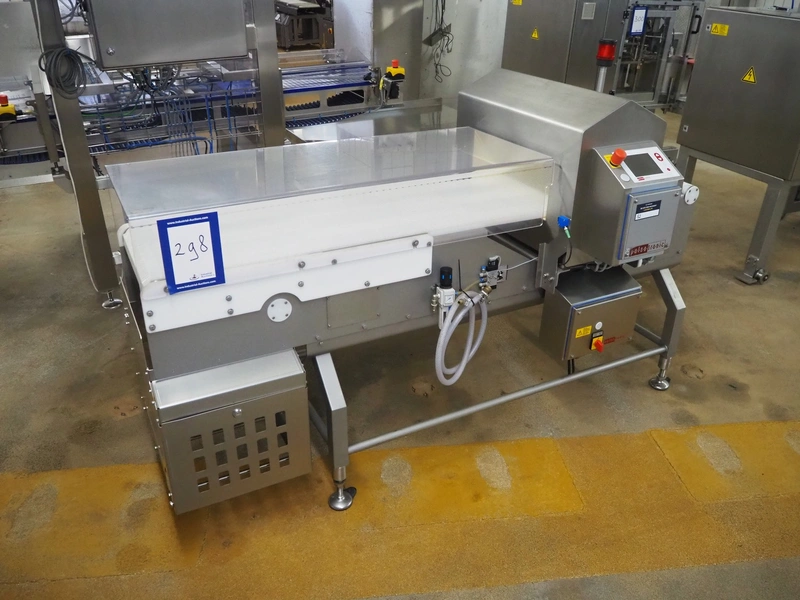 Pulsotronic metal detector with retracting rejection conveyor, type: M-Pulse 2, serial number: 90004403, year of construction: 2013, 230 V, 1 Ph, 50-60 Hz, 350 W, plastic mesh belt, belt width: 400 mm, clearance: 450 mm x 170 mm, total dimensions: 2000 mm x 900 mm x 1200 mm.