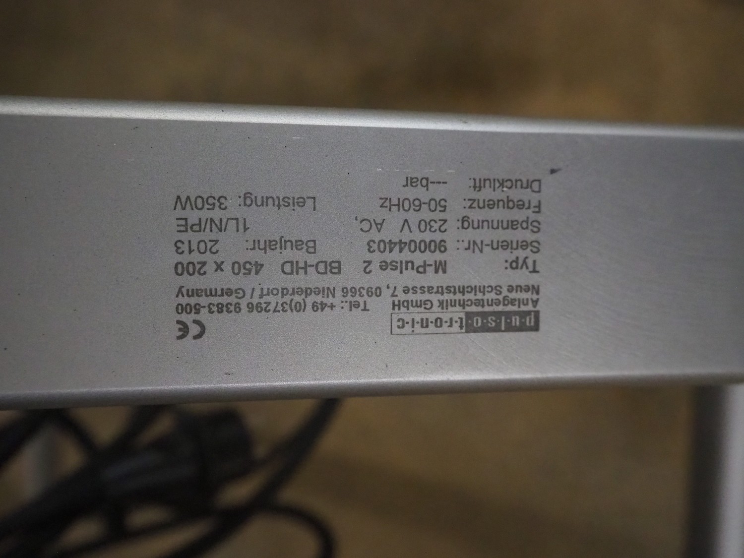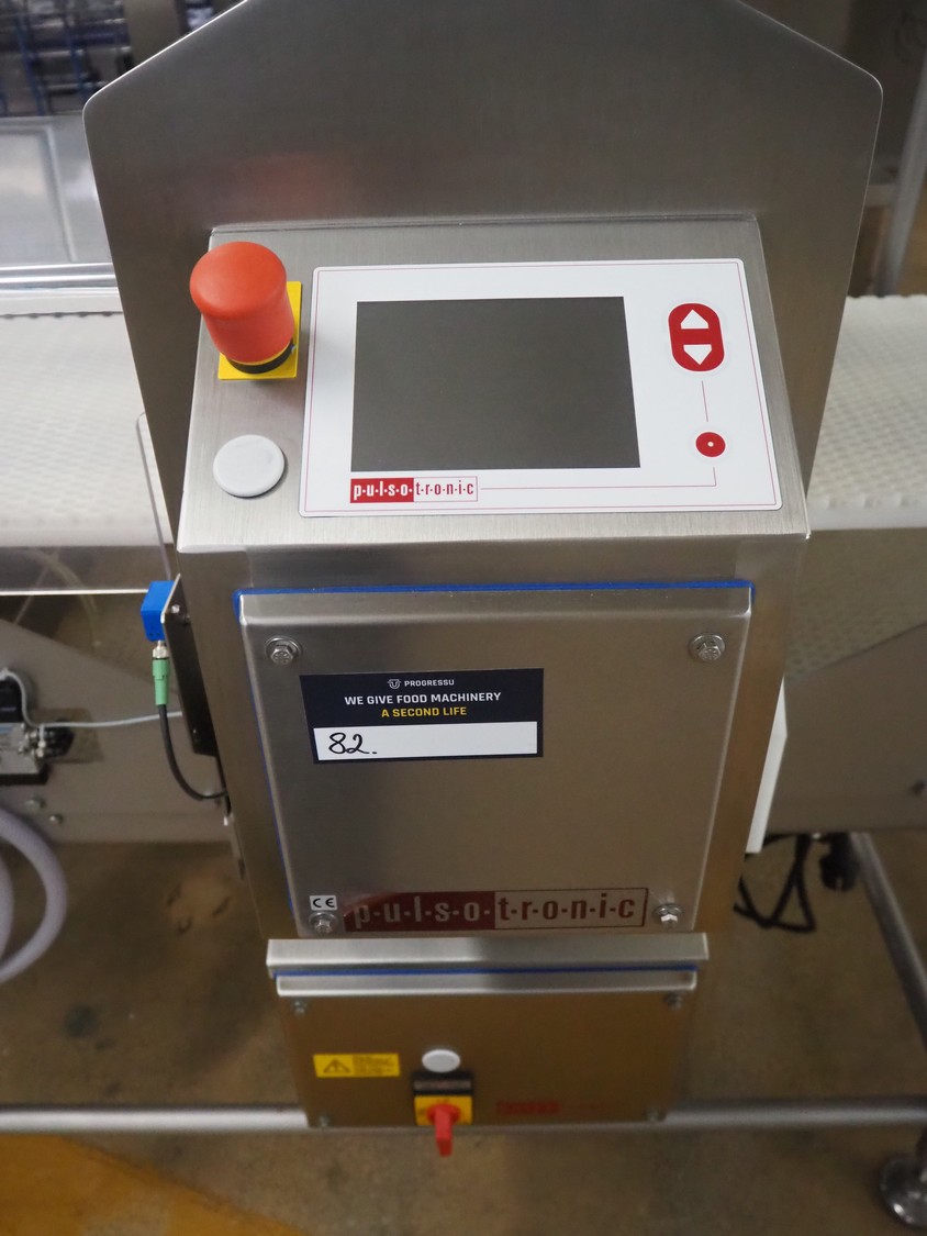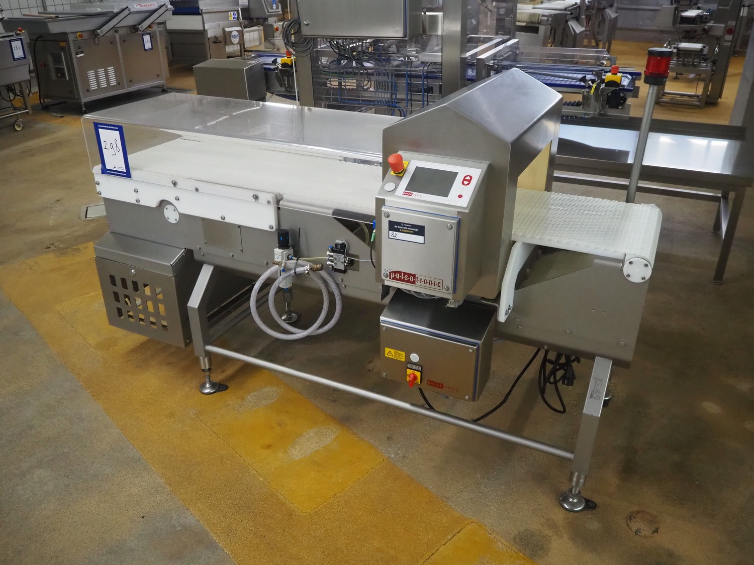 Pulsotronic metal detector with retracting rejection conveyor, type: M-Pulse 2, serial number: 90004403, year of construction: 2013, 230 V, 1 Ph, 50-60 Hz, 350 W, plastic mesh belt, belt width: 400 mm, clearance: 450 mm x 170 mm, total dimensions: 2000 mm x 900 mm x 1200 mm.