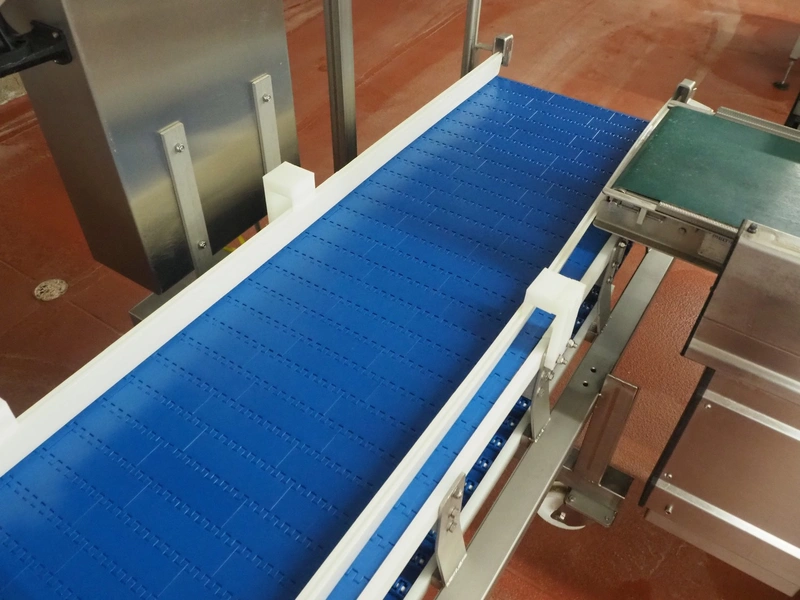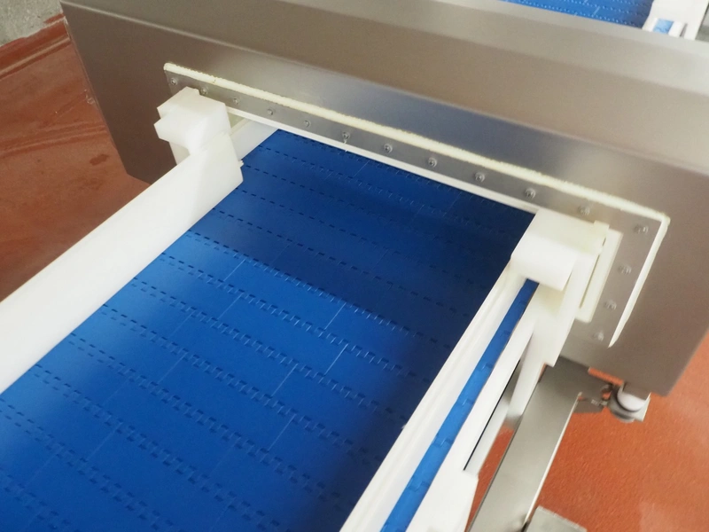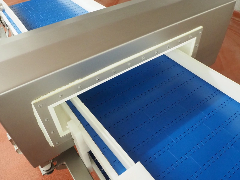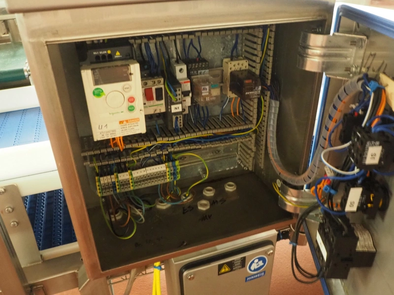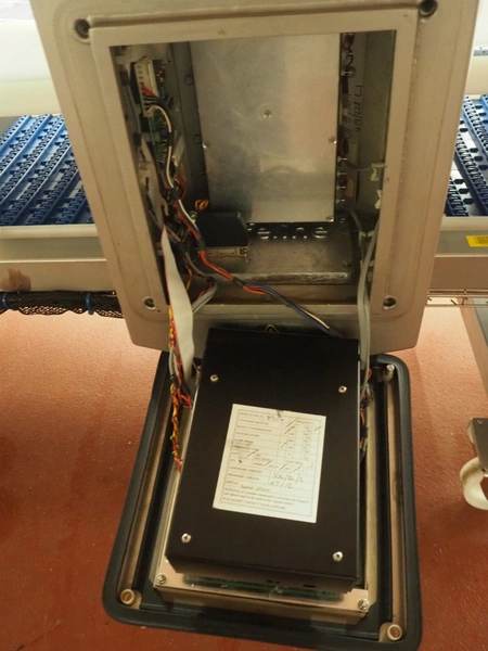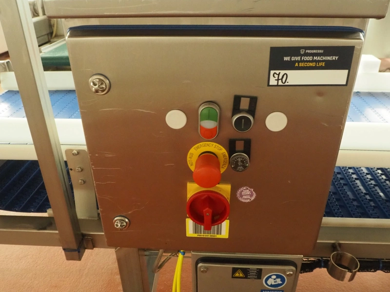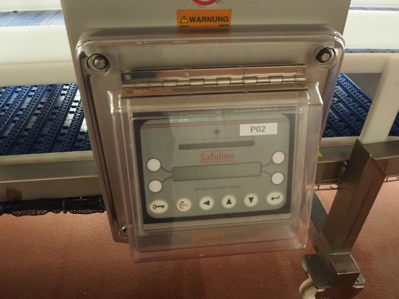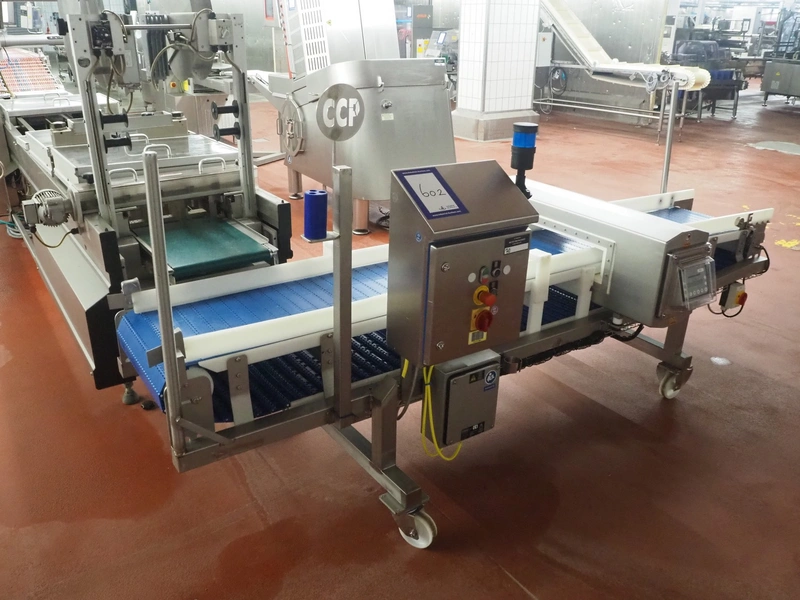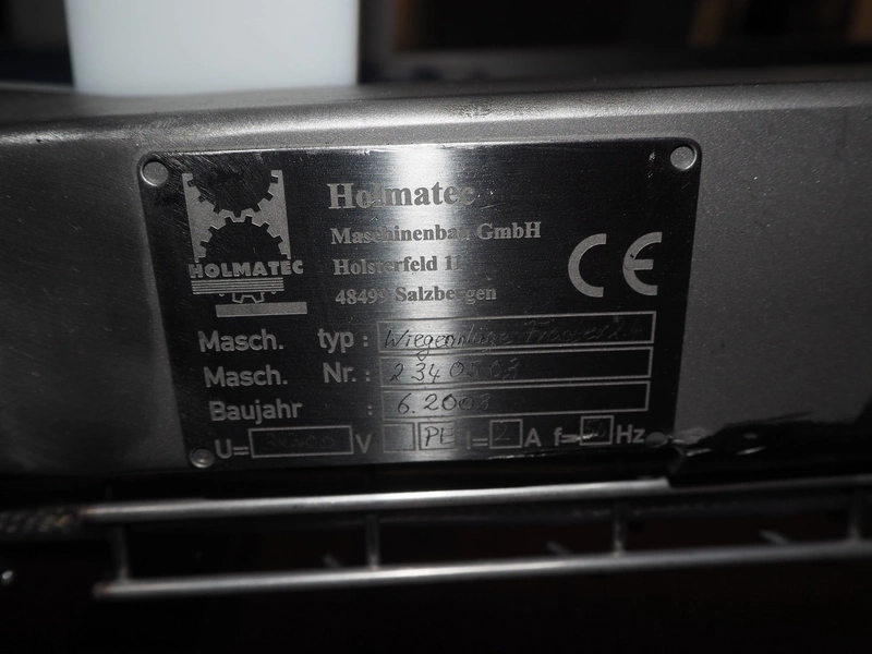 Holmatec Maschinenbau GmbH mobile metal detector, type: Wiegeanlage Froster2, machine number: 2340503, year of construction: 6.2003, 400 V, 3 Ph, 50 Hz, 2 A, plastic belt, belt width: 420 mm, clearance: 600 mm x 80 mm, total dimensions: 3250 mm x 1150 mm x 1470 mm.