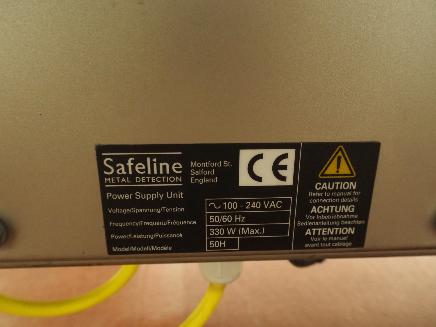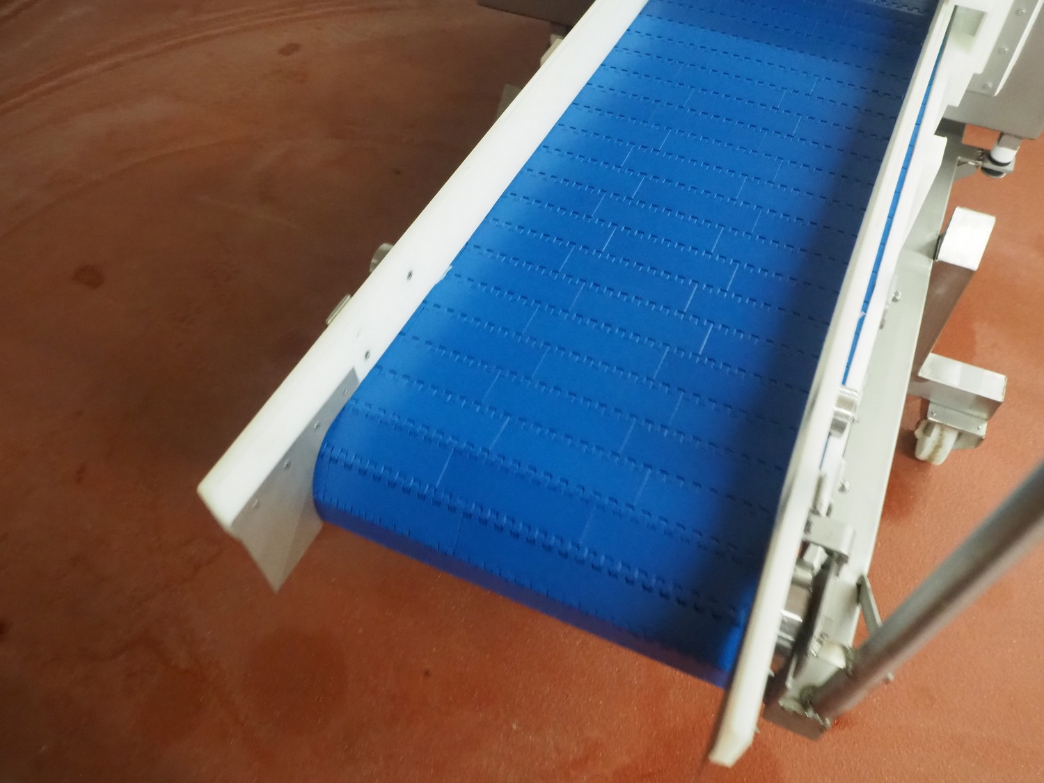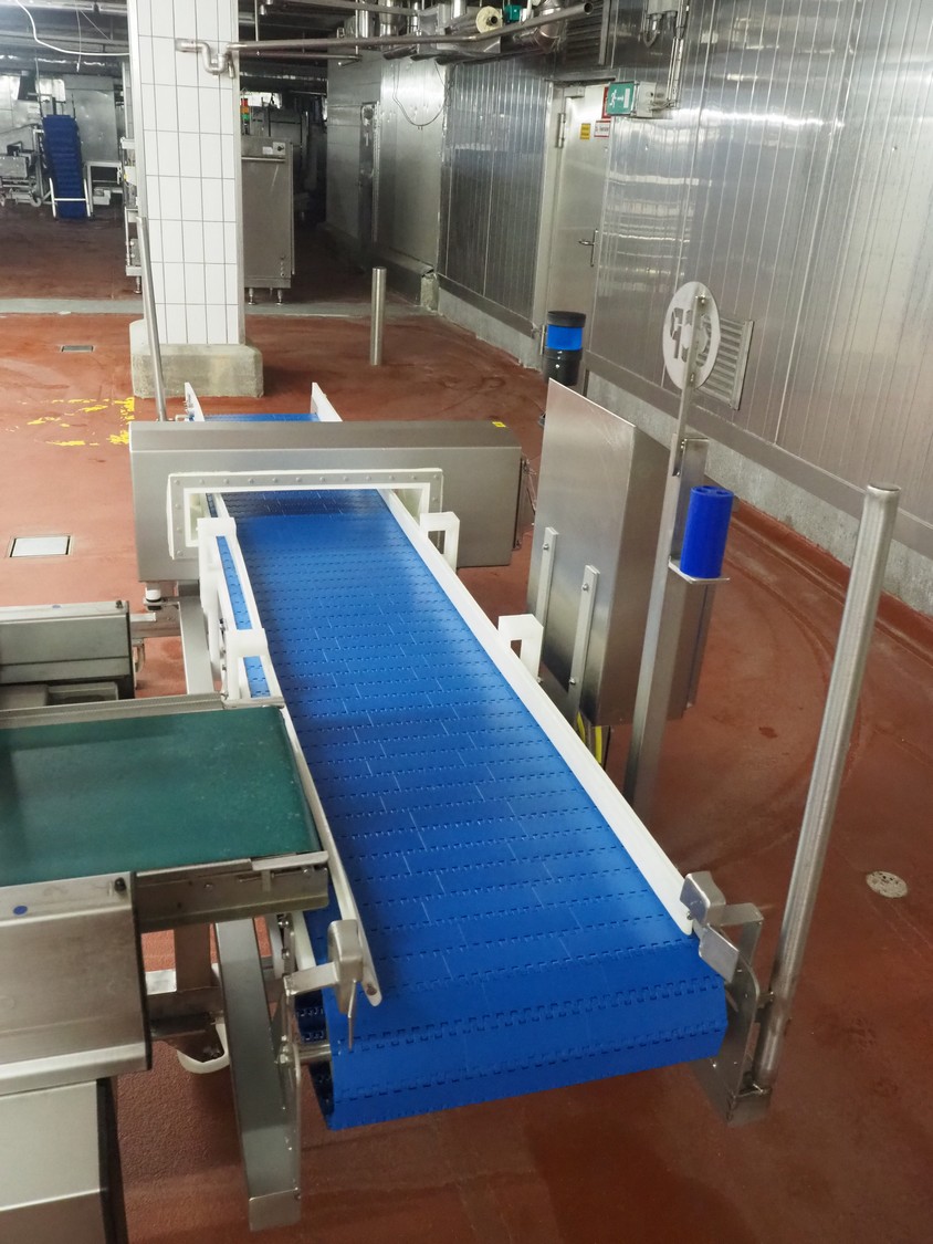 Holmatec Maschinenbau GmbH mobile metal detector, type: Wiegeanlage Froster2, machine number: 2340503, year of construction: 6.2003, 400 V, 3 Ph, 50 Hz, 2 A, plastic belt, belt width: 420 mm, clearance: 600 mm x 80 mm, total dimensions: 3250 mm x 1150 mm x 1470 mm.