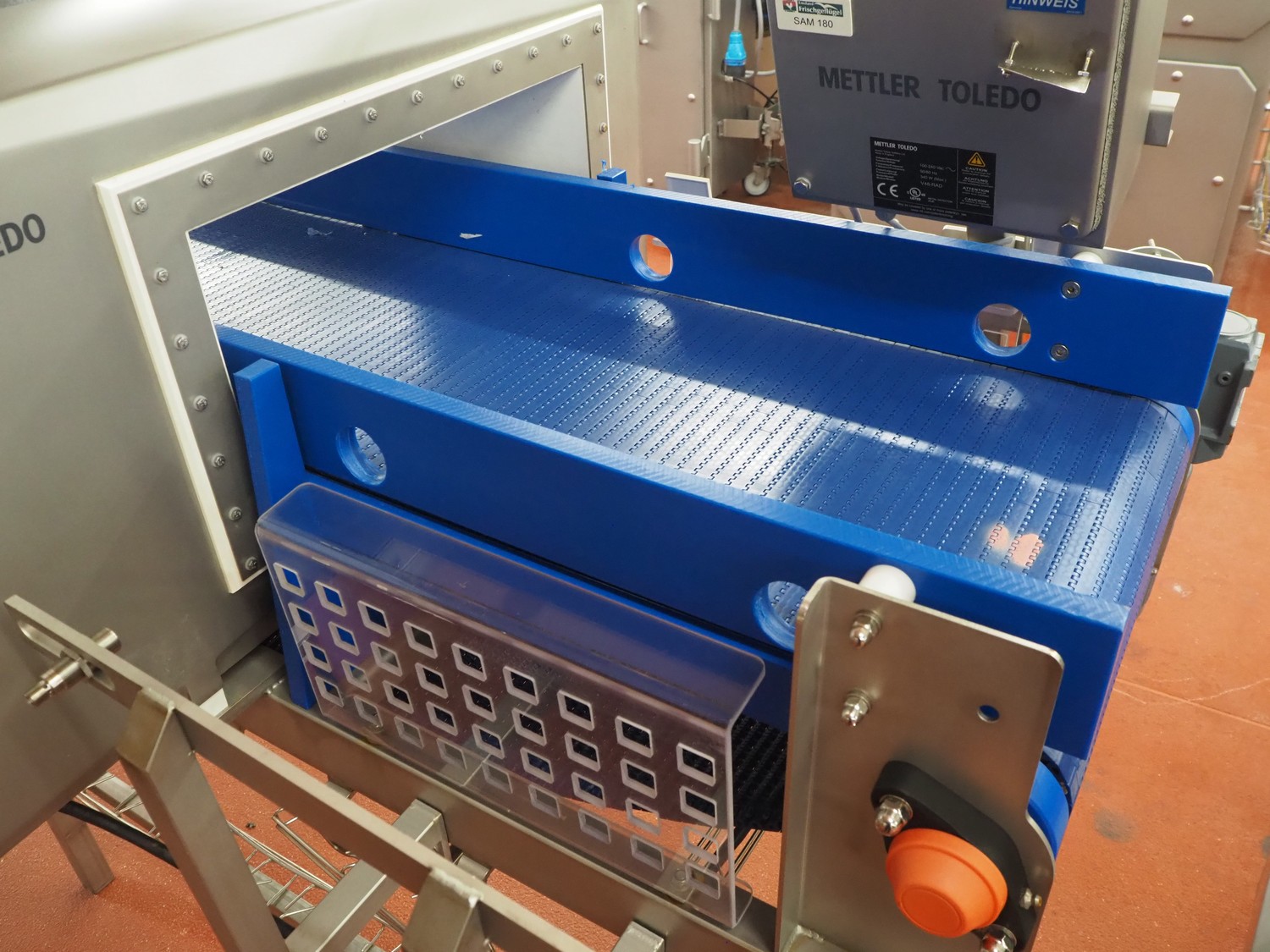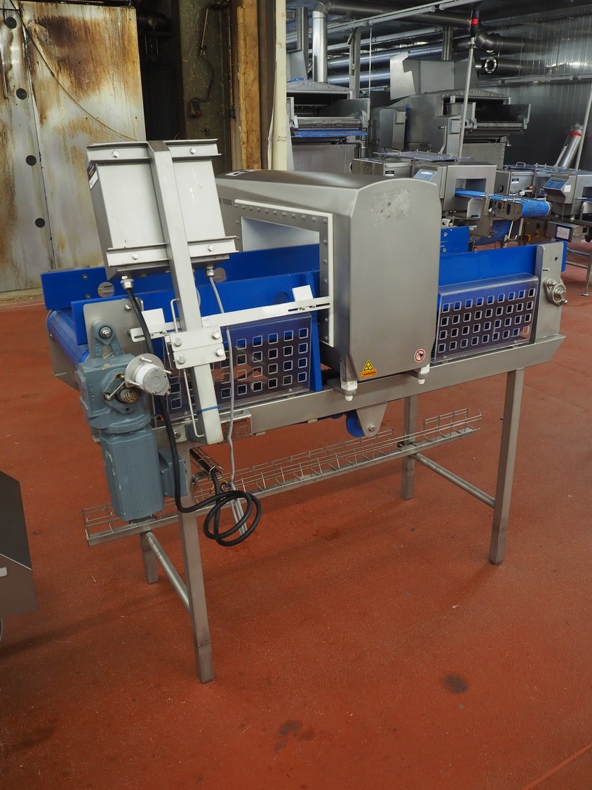 Kersting / Mettler Toledo metal detector, type: FB Metallcheck, number: 40080, year of construction: 2015, 400 V, 50 Hz, plastic belt, belt width: 430 mm, clearance: 500 mm x 210 mm, total dimensions: 1800 mm x 1100 mm x 1530 mm.