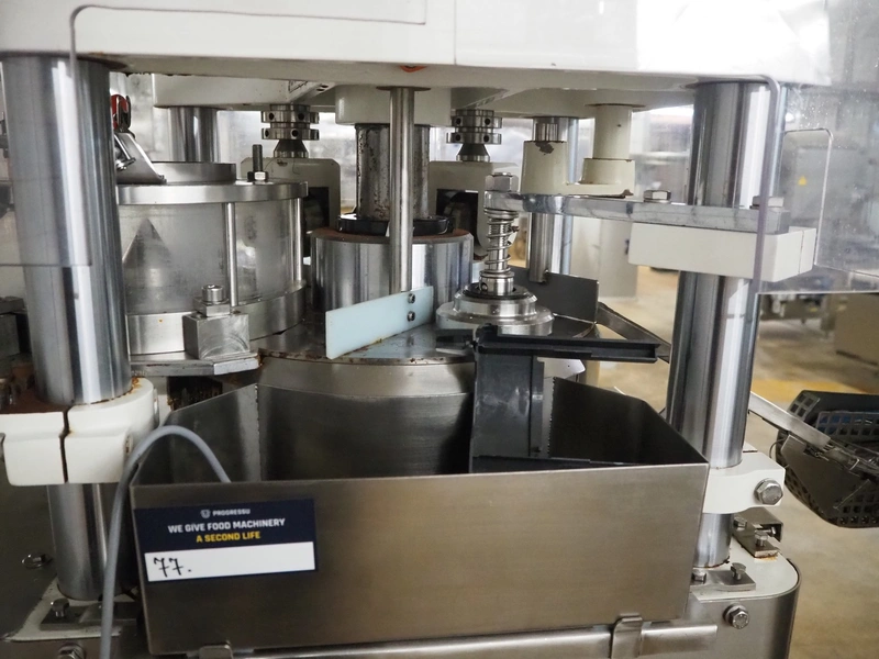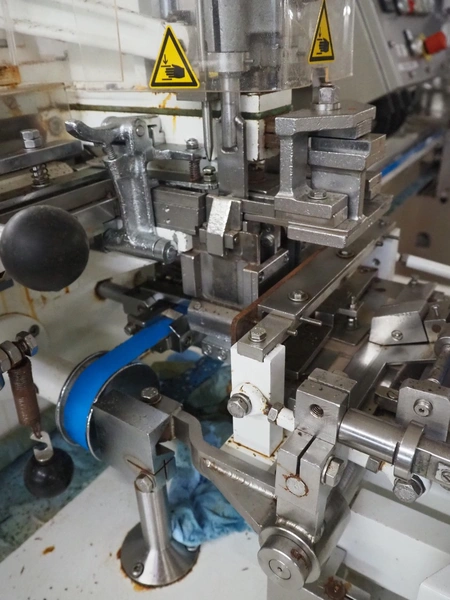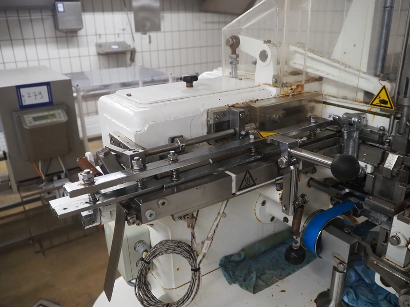 Wilhelm Fette GmbH press for bouillon cubes with Sapal packaging machine, type: Perfecta P4/B, number: 02518, year of construction: 1985, 380-415 V, 50 Hz, 7.5 A, plastic belt, belt width: 30 mm, label width: 150 mm, total dimensions; 1500 mm x 1150 mm x 2100 mm and 1900 mm x 1700 mm x 1750 mm.