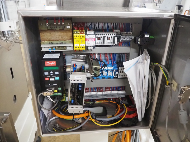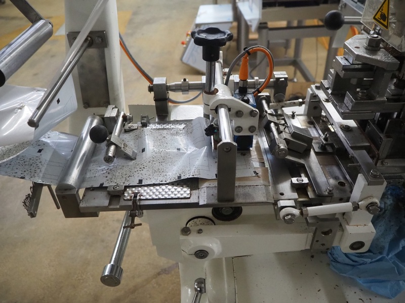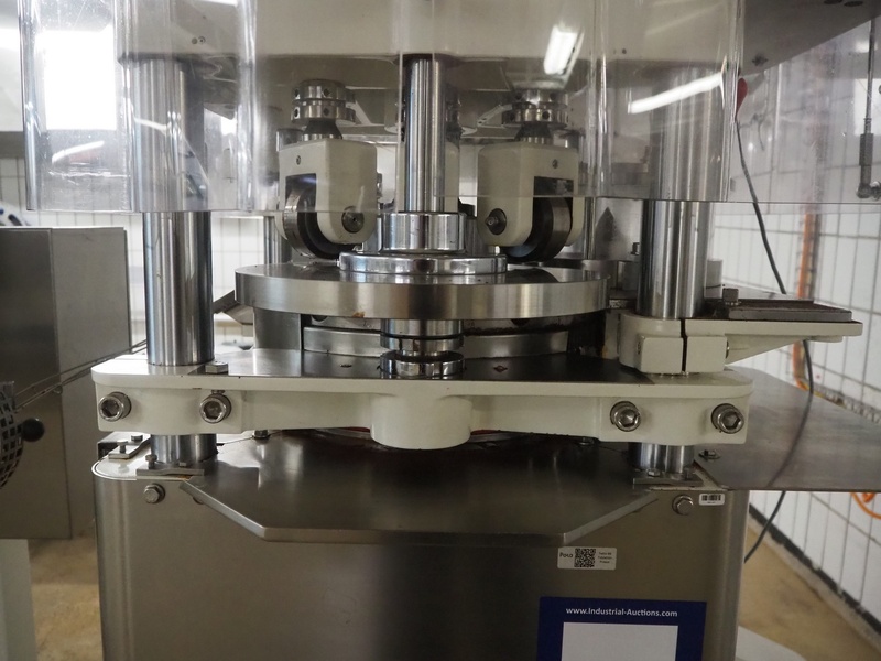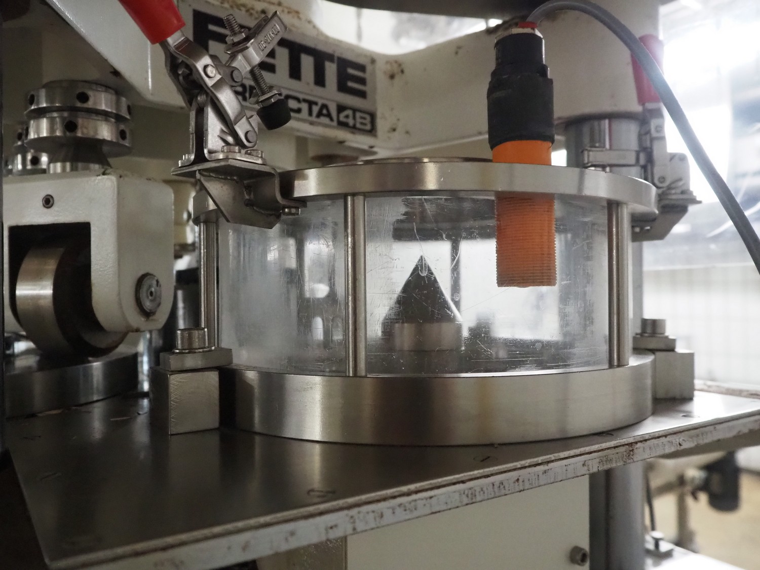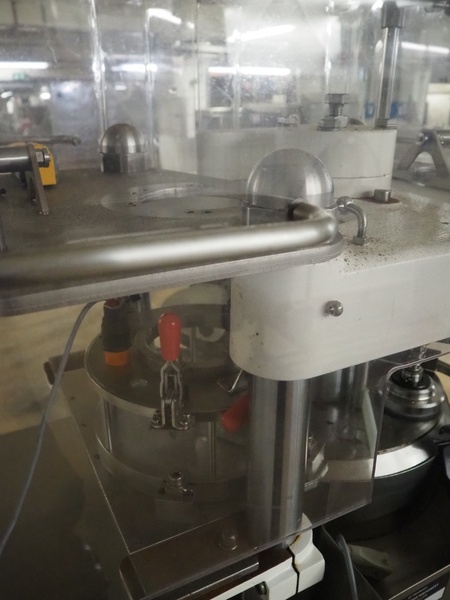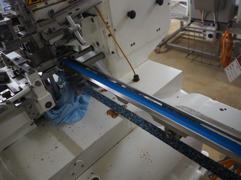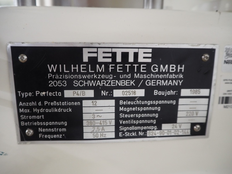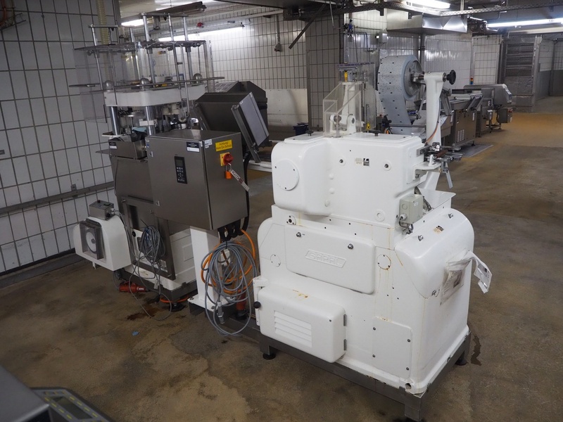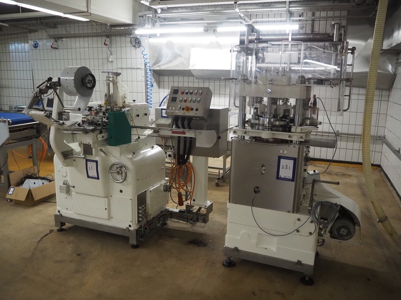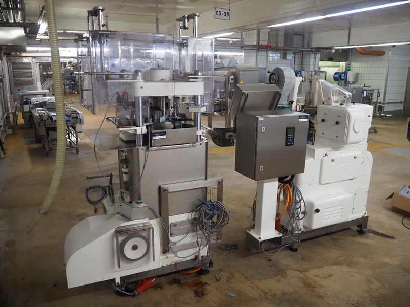 Wilhelm Fette GmbH press for bouillon cubes with Sapal packaging machine, type: Perfecta P4/B, number: 02518, year of construction: 1985, 380-415 V, 50 Hz, 7.5 A, plastic belt, belt width: 30 mm, label width: 150 mm, total dimensions; 1500 mm x 1150 mm x 2100 mm and 1900 mm x 1700 mm x 1750 mm.