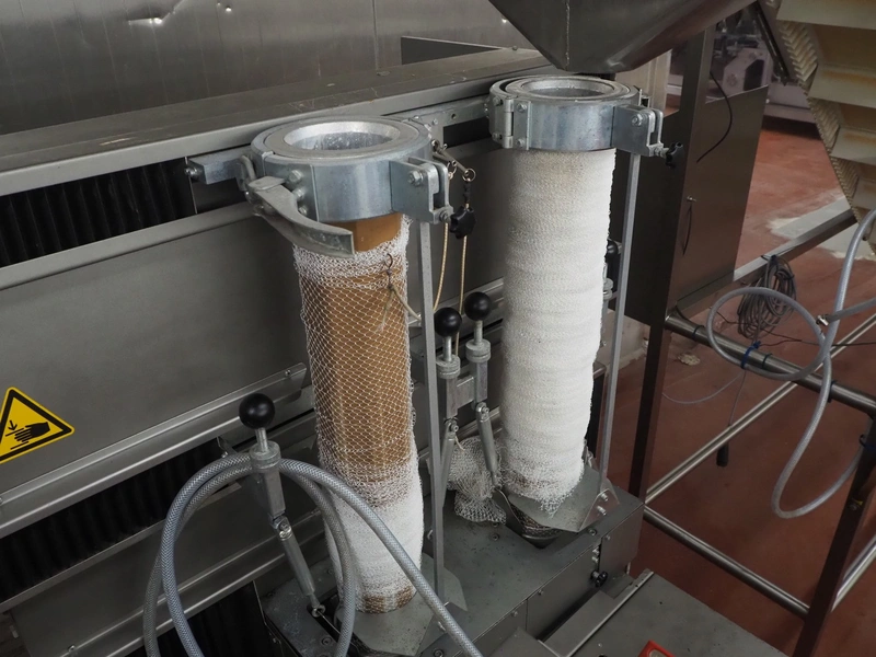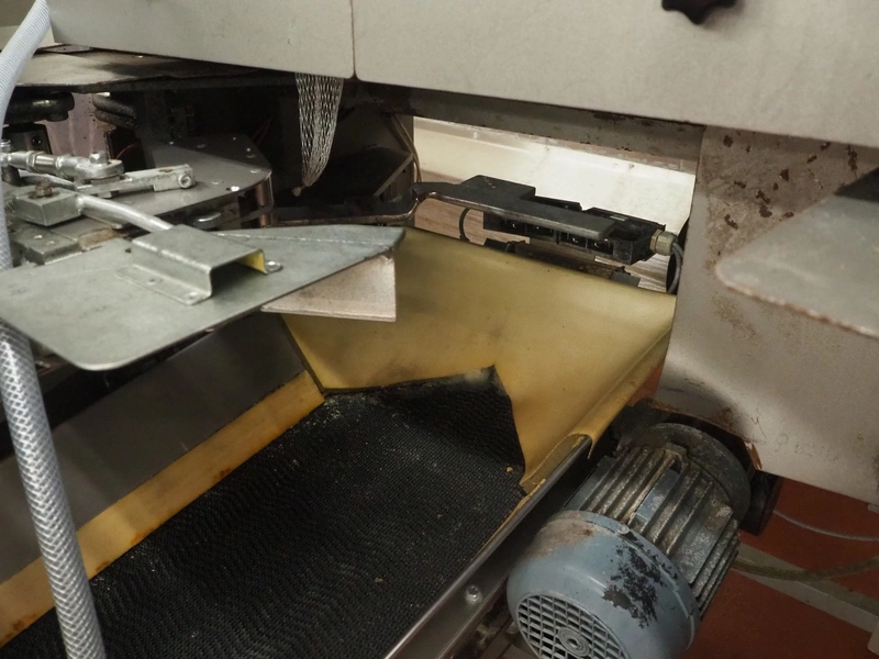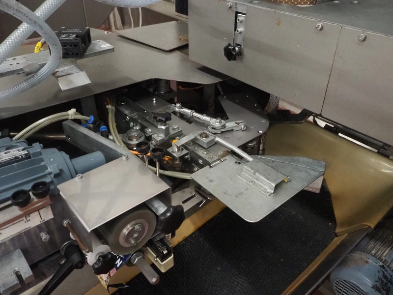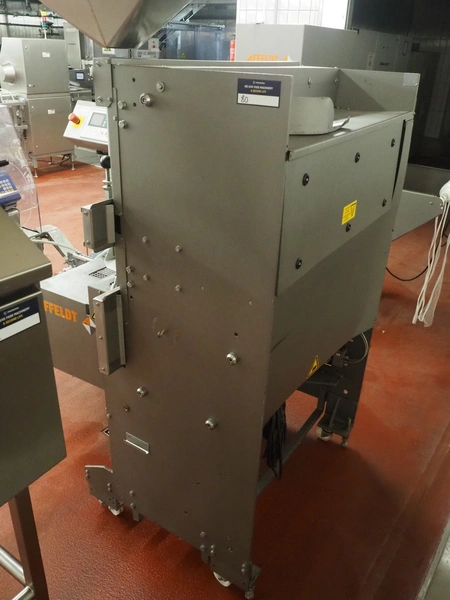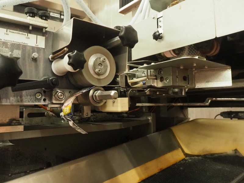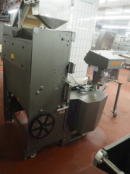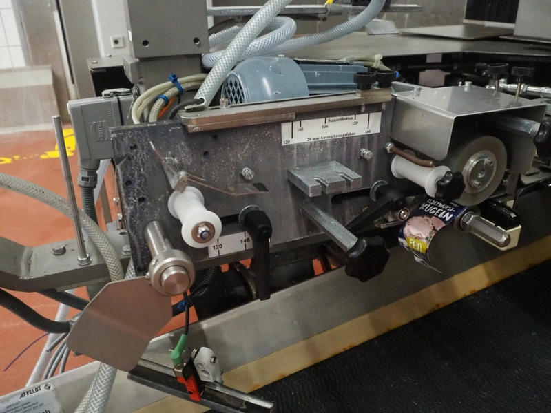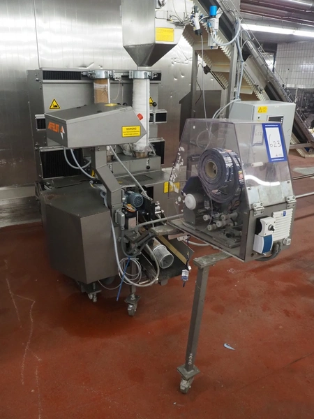 Affeldt netting machine with labeller, type: AVN 955, serial number: 2033, year of construction: 2016, 400/230 V, 50 Hz, diameter: (2x) 120 mm, plastic belt, belt width: 250 mm, label width: 50 mm, total dimensions: 2400 mm x 1300 mm x 1700 mm.