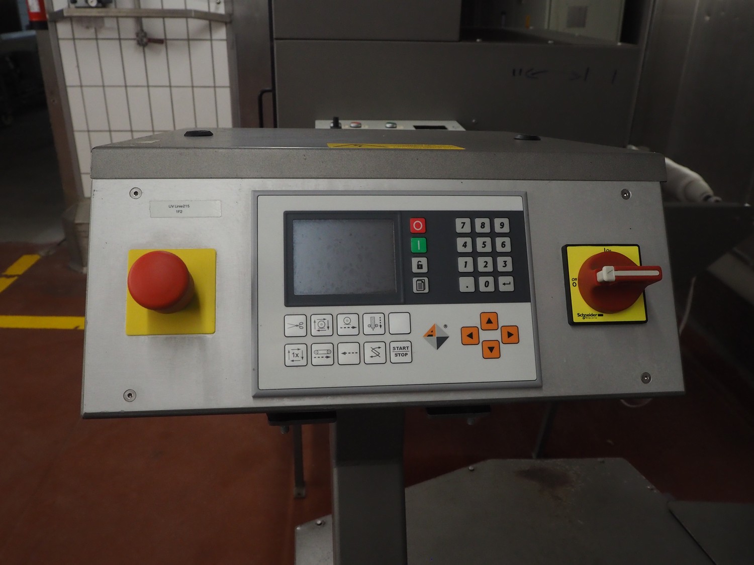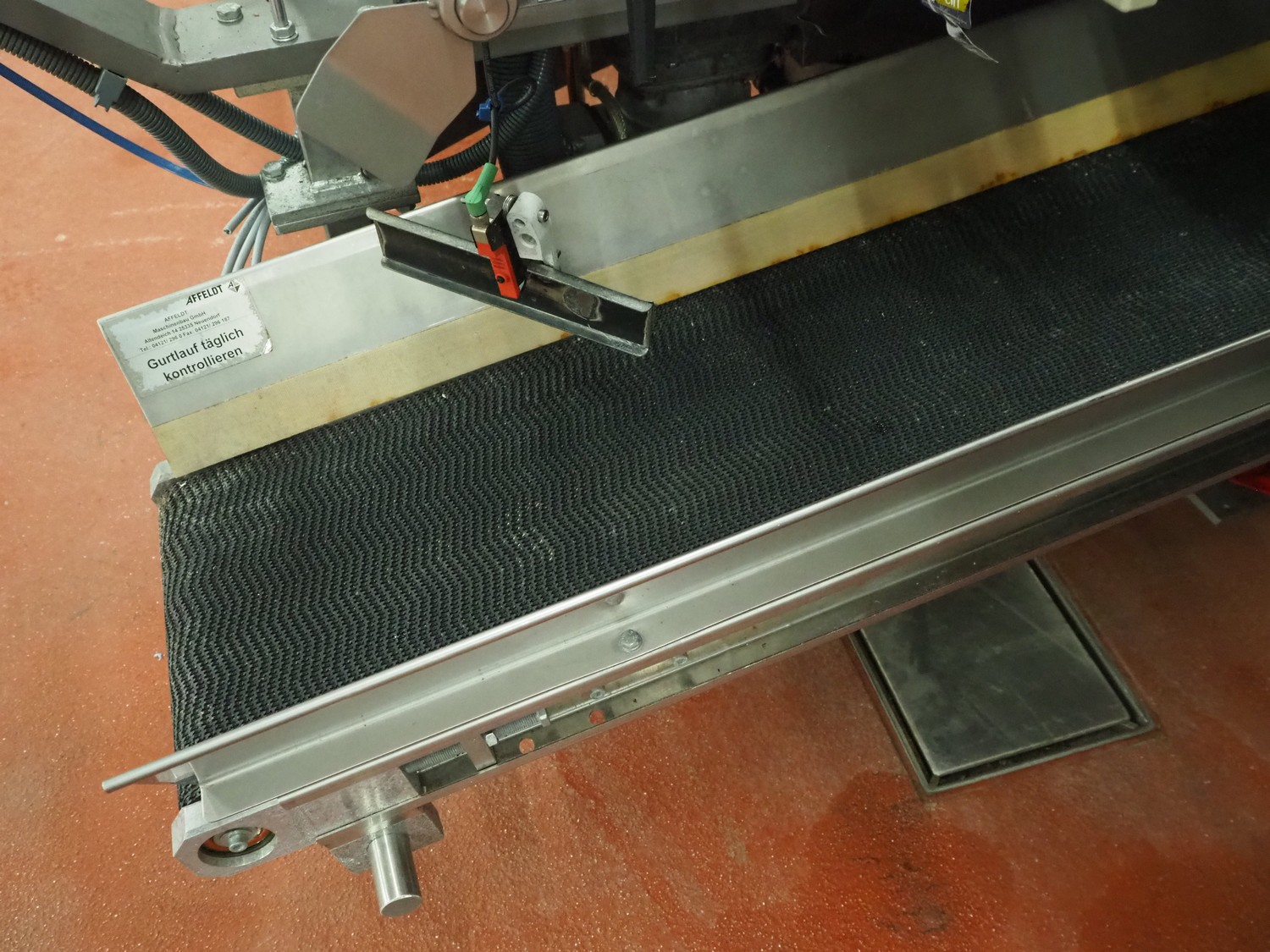 Affeldt netting machine with labeller, type: AVN 955, serial number: 2033, year of construction: 2016, 400/230 V, 50 Hz, diameter: (2x) 120 mm, plastic belt, belt width: 250 mm, label width: 50 mm, total dimensions: 2400 mm x 1300 mm x 1700 mm.