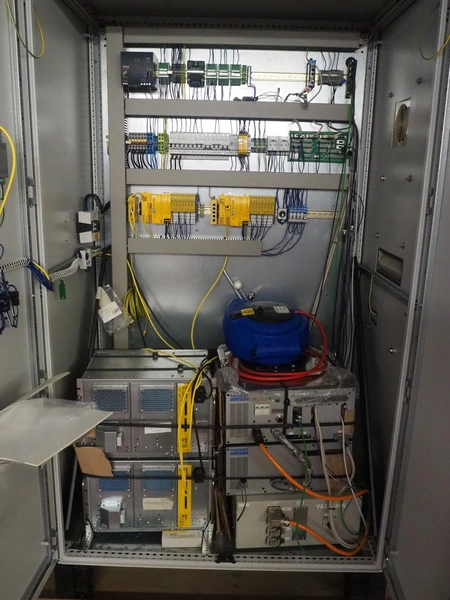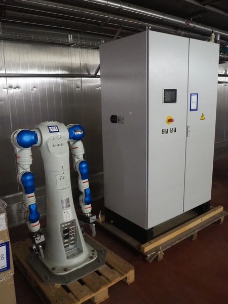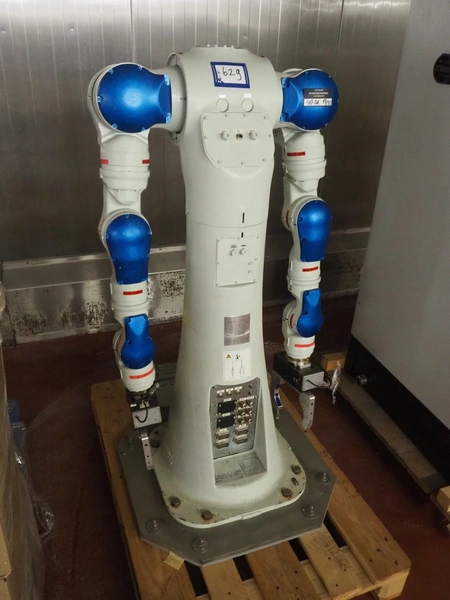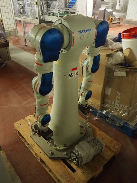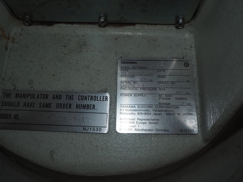 Yaskawa packaging robot, model: Motoman-SDA 10 F, year of construction: 2017, serial number: S66Z02-1-1, 400 V, 3 Ph, 50/60 Hz, 1.5 kVA, payload: D10 kg, weight: 220 kg, dimensions packaging robot: 700 mm x 700 mm x 1370 mm, dimensions switch cabinet: 1500 mm x 850 mm x 2200 mm.