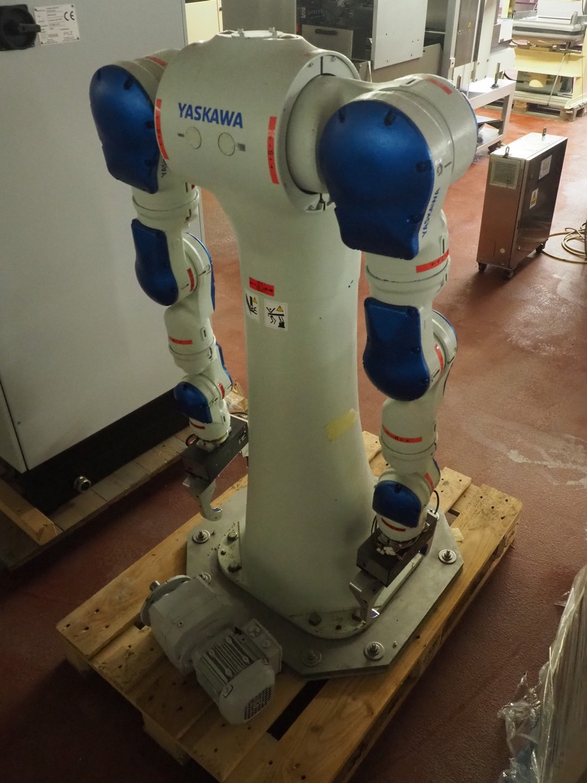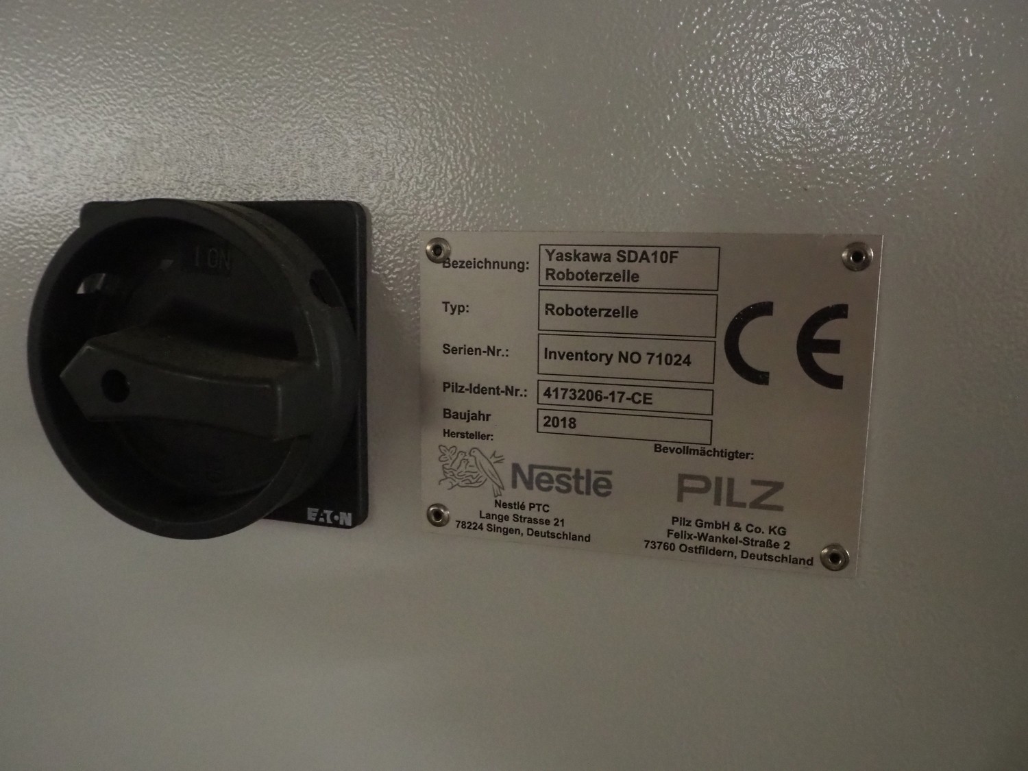 Yaskawa packaging robot, model: Motoman-SDA 10 F, year of construction: 2017, serial number: S66Z02-1-1, 400 V, 3 Ph, 50/60 Hz, 1.5 kVA, payload: D10 kg, weight: 220 kg, dimensions packaging robot: 700 mm x 700 mm x 1370 mm, dimensions switch cabinet: 1500 mm x 850 mm x 2200 mm.