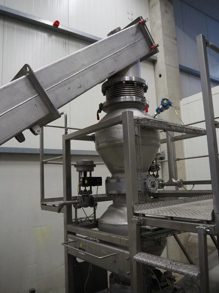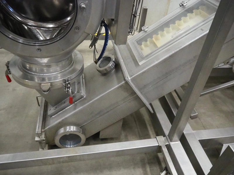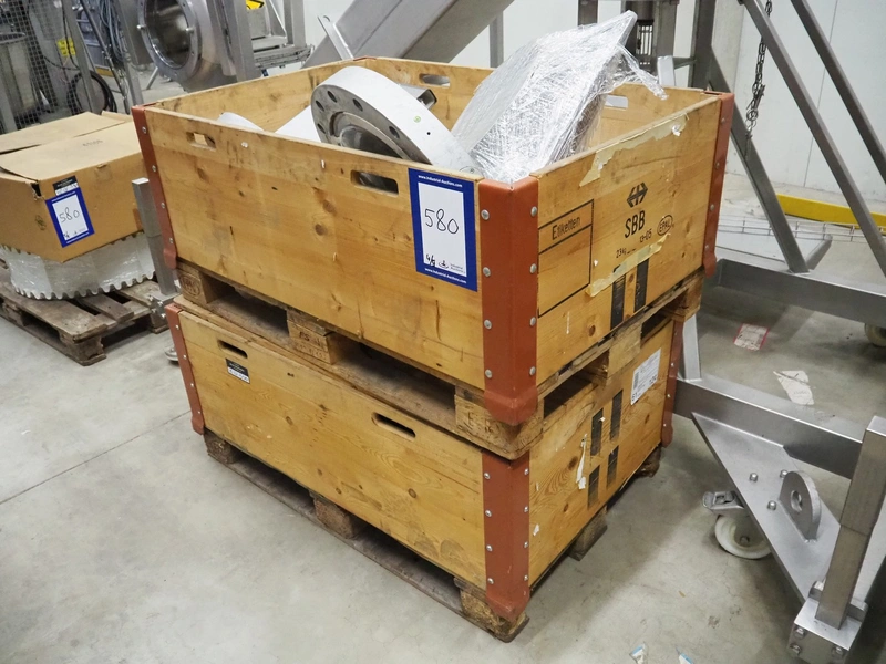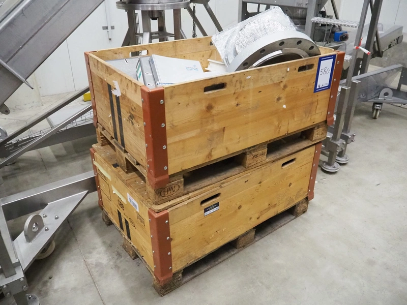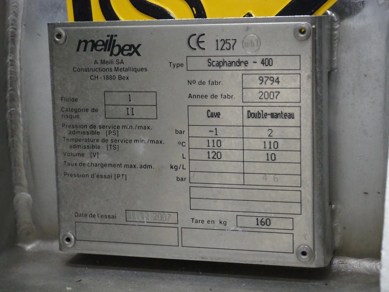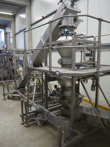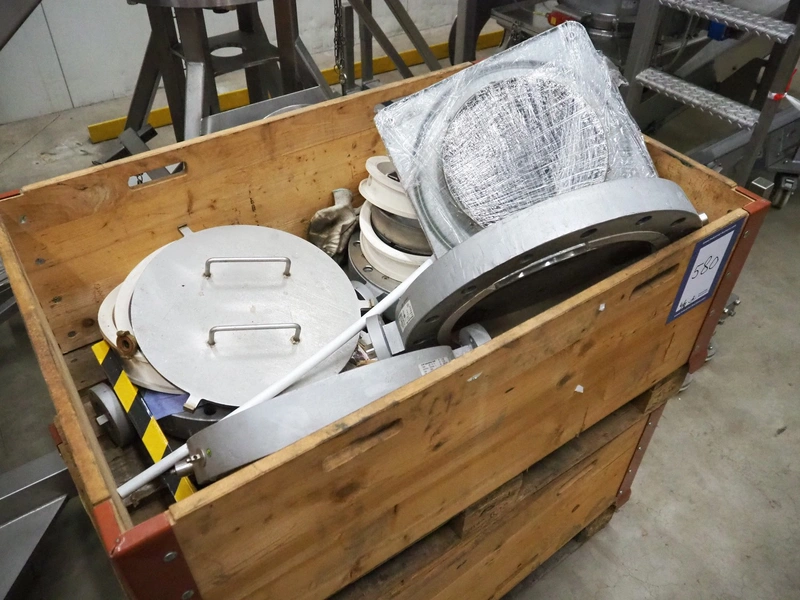 A.Meili SA processing-installation, model: Scaphandre-400, fabrication number: 9794, year of construction: 2007, -1 / 2 bar, maximum working temperature: 110˚C, volume: 120 liter, jacket: 10 liter, Kraft Apparatebau GmbH valve, type: S09-44, serial number: 2101248, year of construction: 2010, dimensions infeed station with drum: 2800 mm x 2400 mm x 2350 mm, elevating belt with dividers, belt width: 240 mm, divider height: 40 mm, elevating height: 2600 mm, total dimensions elevating belt: 2400 mm x 2200 mm x 3200 mm and processing installation, dimensions: 2600 mm x 2170 mm x 2950 mm. Including 3 pallets with valves, parts and extra belt.