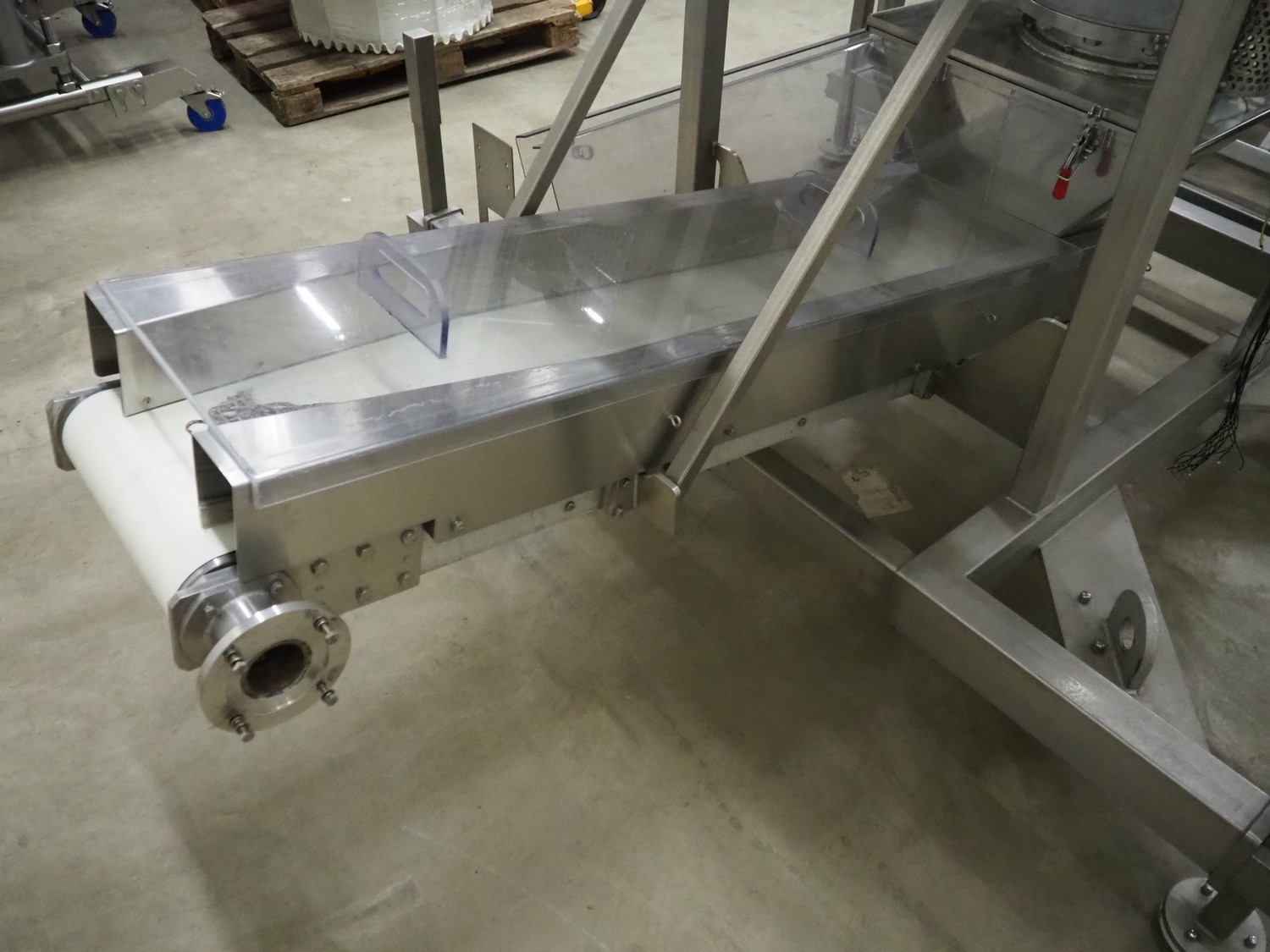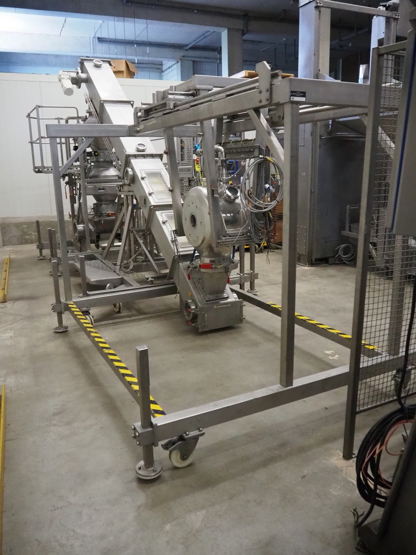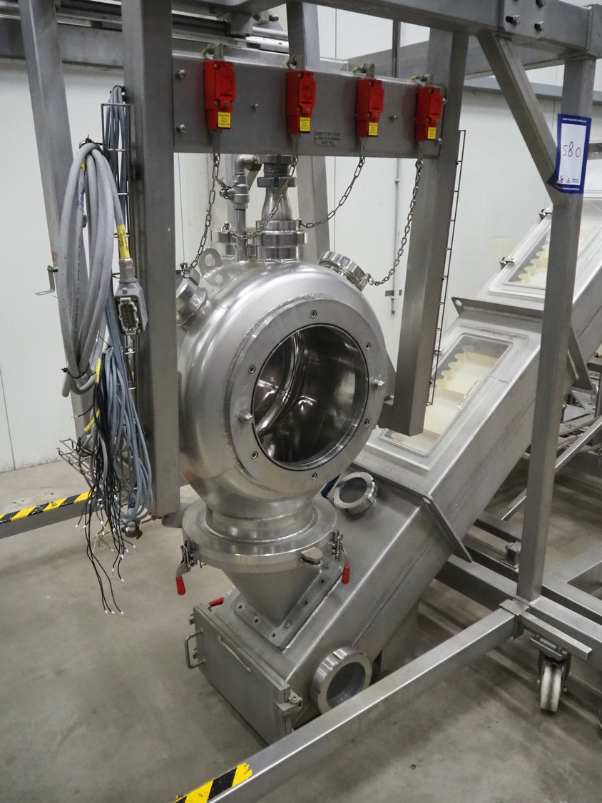 A.Meili SA processing-installation, model: Scaphandre-400, fabrication number: 9794, year of construction: 2007, -1 / 2 bar, maximum working temperature: 110˚C, volume: 120 liter, jacket: 10 liter, Kraft Apparatebau GmbH valve, type: S09-44, serial number: 2101248, year of construction: 2010, dimensions infeed station with drum: 2800 mm x 2400 mm x 2350 mm, elevating belt with dividers, belt width: 240 mm, divider height: 40 mm, elevating height: 2600 mm, total dimensions elevating belt: 2400 mm x 2200 mm x 3200 mm and processing installation, dimensions: 2600 mm x 2170 mm x 2950 mm. Including 3 pallets with valves, parts and extra belt.