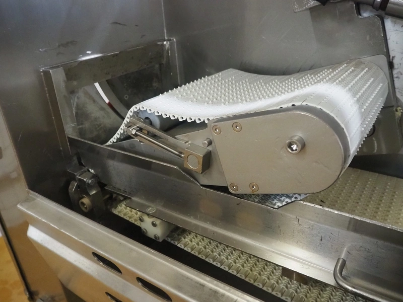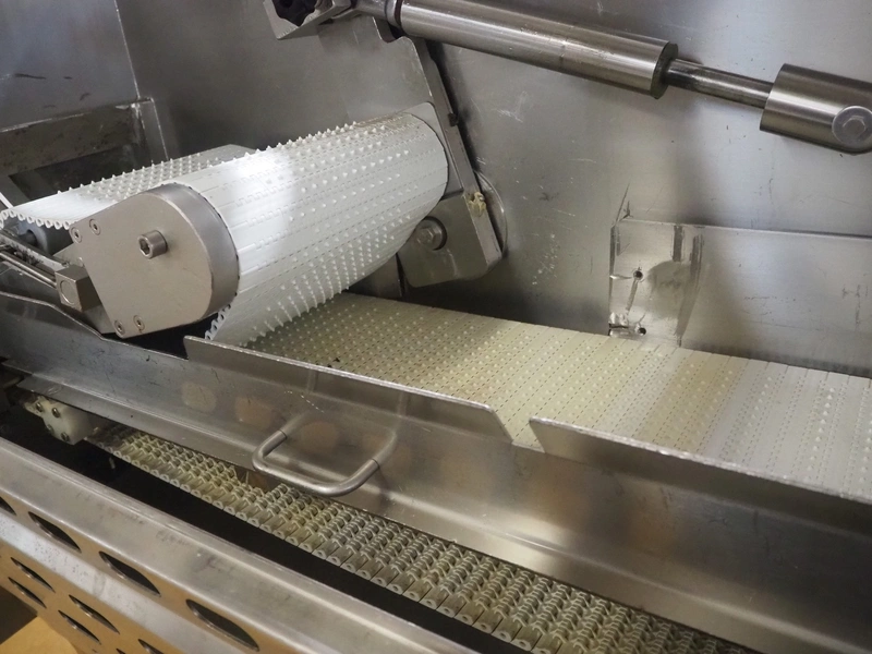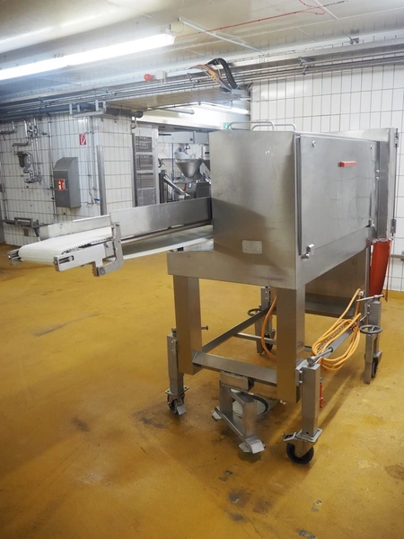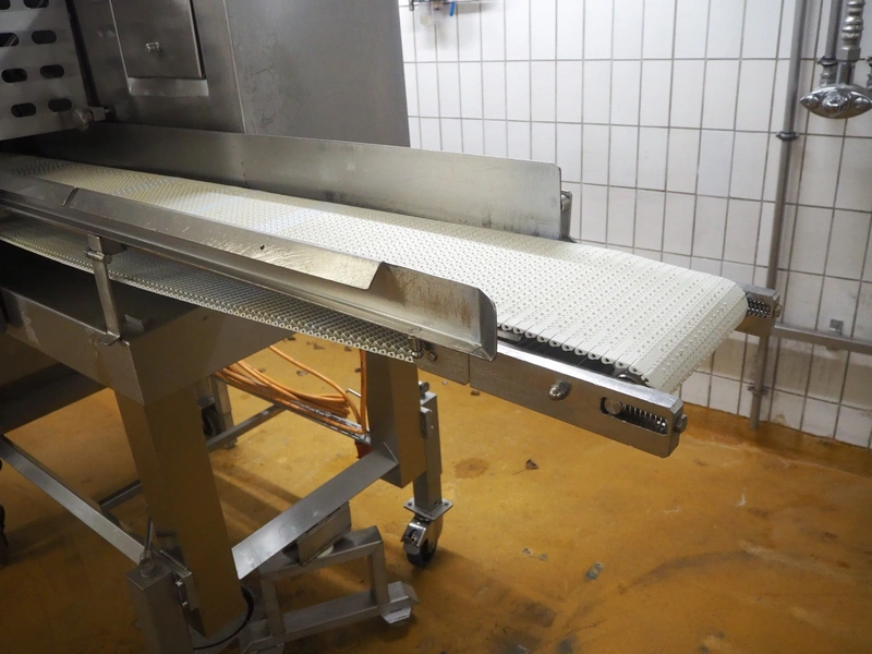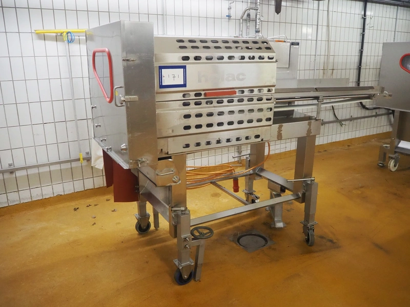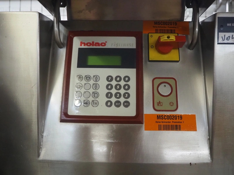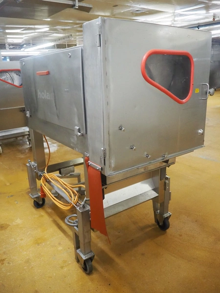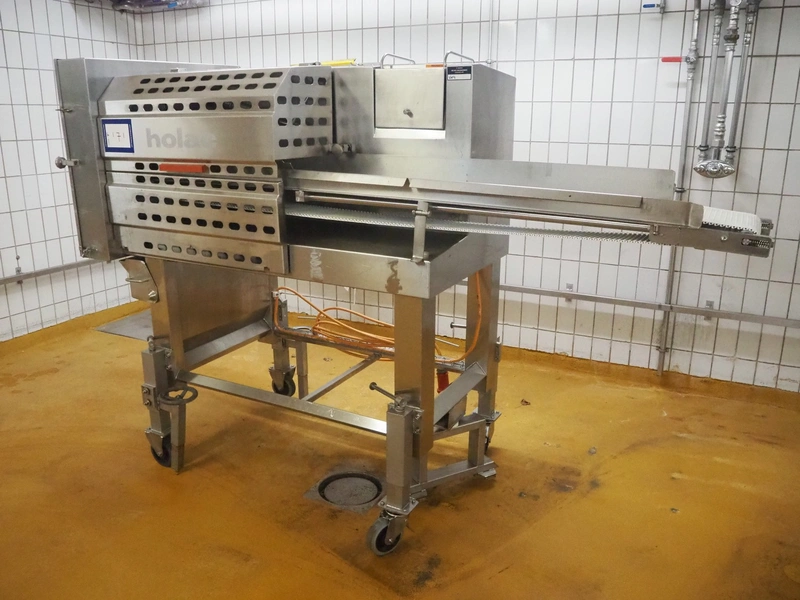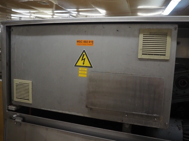 Holac mobile slicer, type: BS 28, machine number: 402-01-02, year of construction: 2007, 400 V, 50 Hz, 12 A, 5 kW, plastic belt, belt width: 280 mm, dimensions chamber: 290 mm x 200 mm, total dimensions: 3000 mm x 1400 mm x 2000 mm.