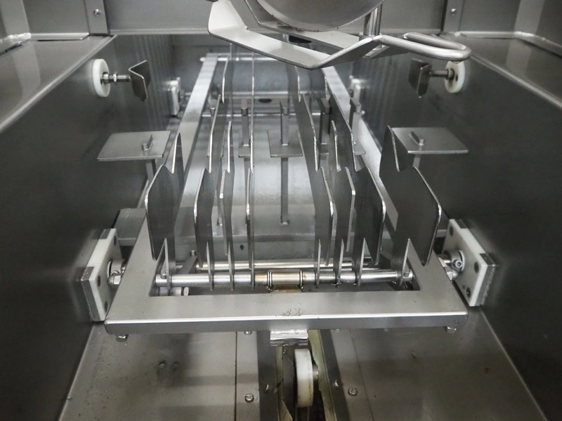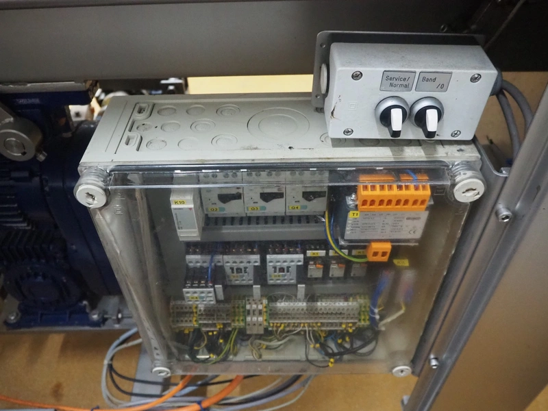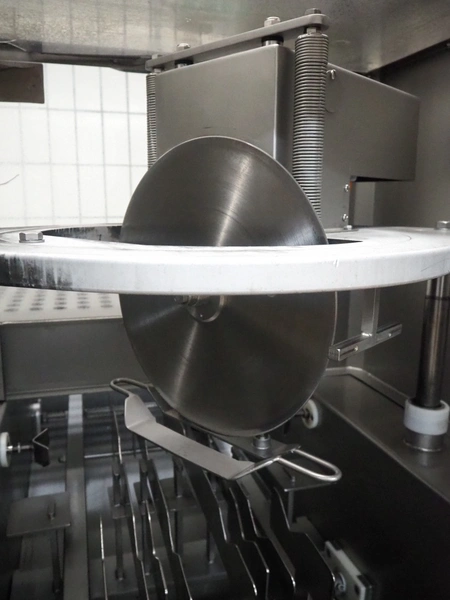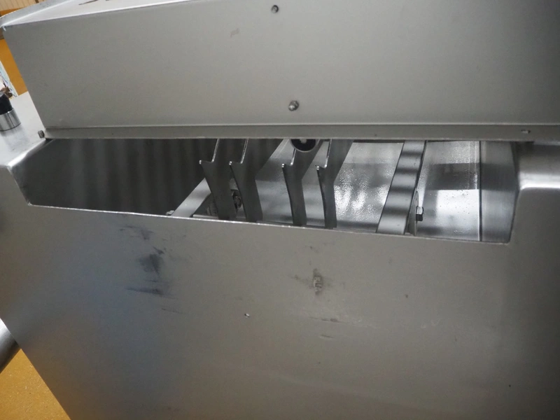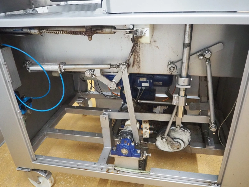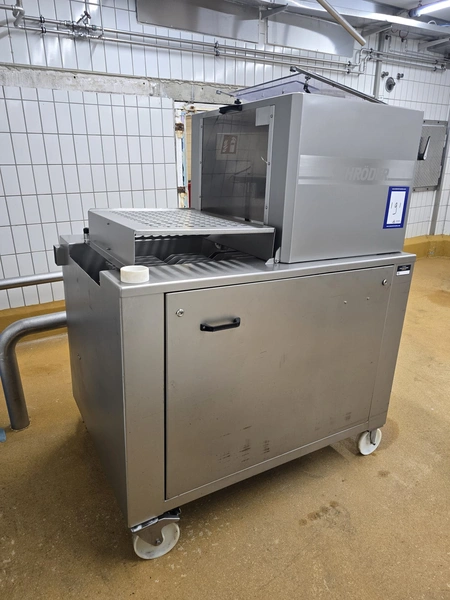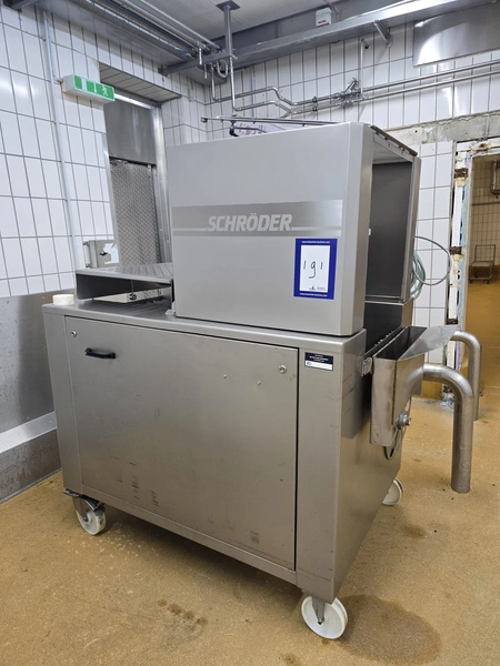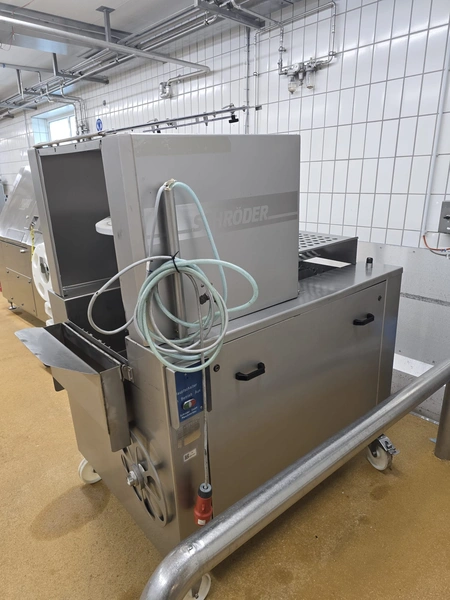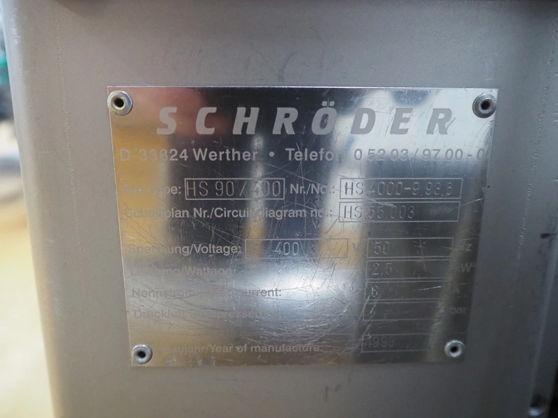Schröder slicer, type: HS 90/400, number: HS 4000-9.93.6, year of construction: 1993, 400 V, 50 Hz, 6 A, 2.5 kW, s/s walking beam, beam width: 260 mm, total dimensions: 1800 mm x 1250 mm x 1900 mm. Incomplete.