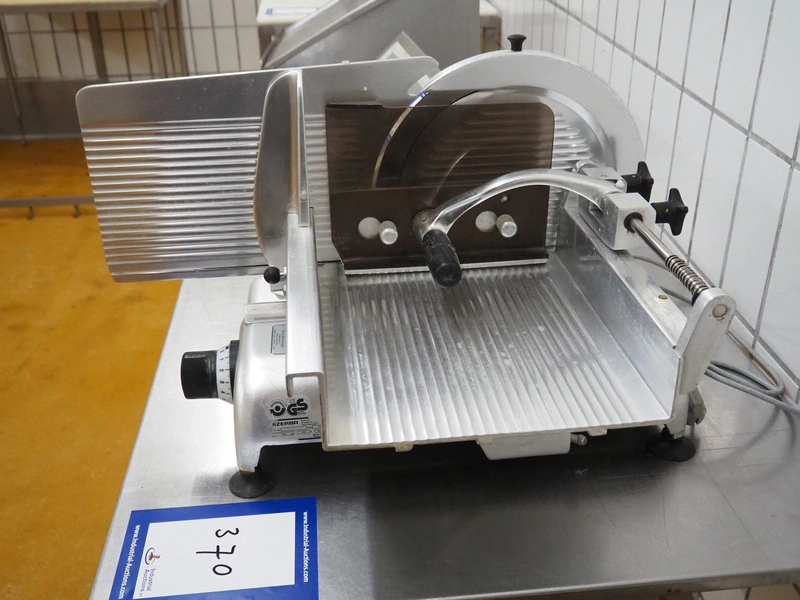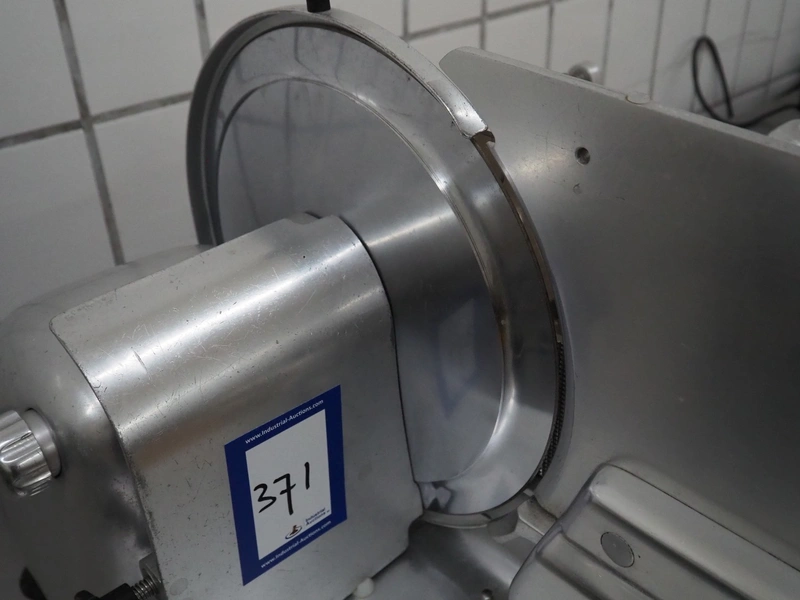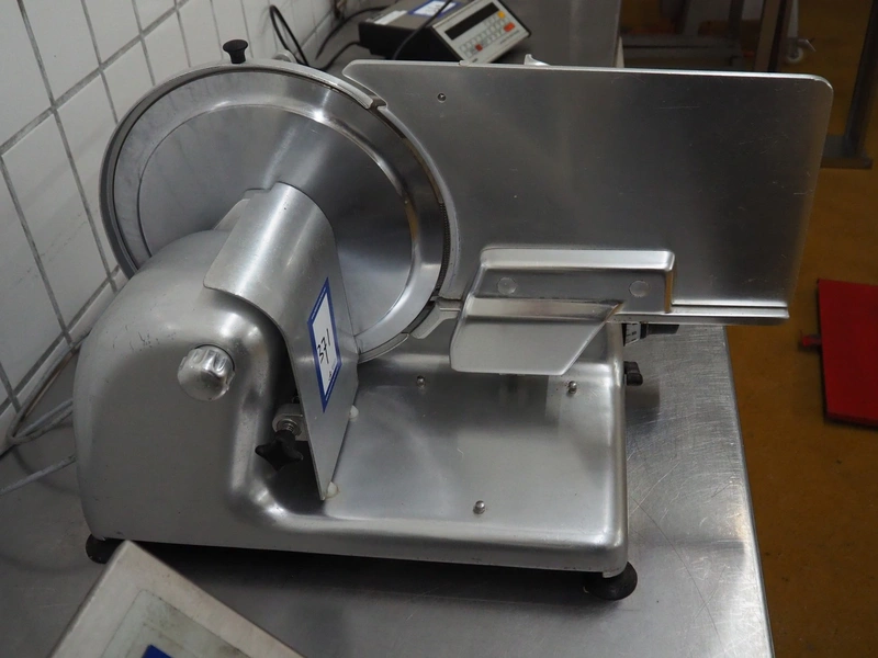 Bizerba slicer, type: VF 3, machine number: 414587, 220 V, 1 Ph, 50 Hz, 1.85 A, dimensions: 680 mm x 550 mm x 400 mm.