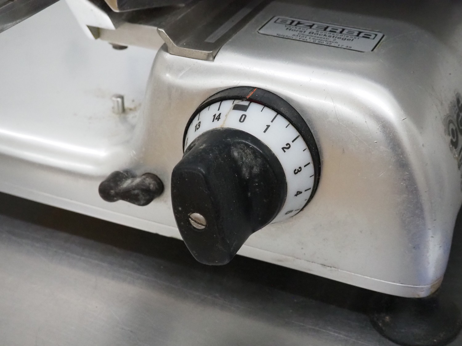 Bizerba slicer, type: VF 3, machine number: 414587, 220 V, 1 Ph, 50 Hz, 1.85 A, dimensions: 680 mm x 550 mm x 400 mm.