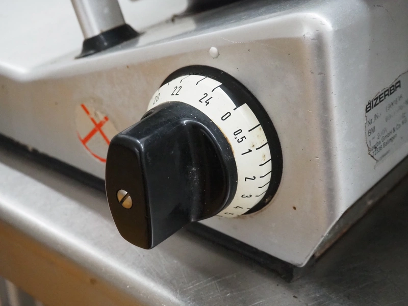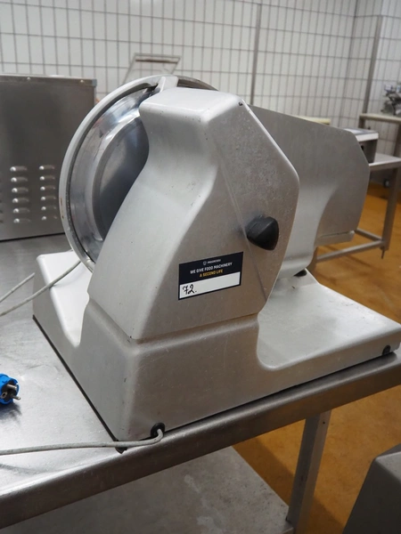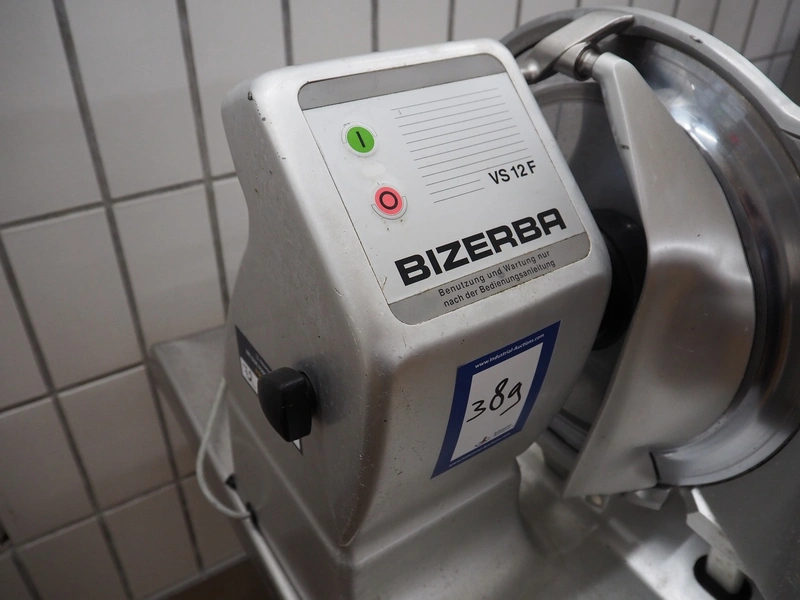 Bizerba slicer, type: VS 12 F, number: 1903836, year of construction: 2001, 230 V, 1 Ph, 50 Hz, 1.8 A, dimensions: 600 mm x 600 mm x 4501 mm. Including knife sharpener.