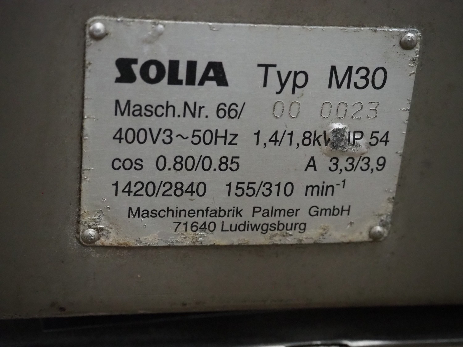 Solia strip cutter, type: M30, machine number: 66/00 0023, 400 V, 3 Ph, 50 Hz, 3.3/3.9 A, 1.4/1.8 kW, 14 knives, distance between knives: 10 mm, total dimensions: 950 mm x 320 mm x 420 mm.