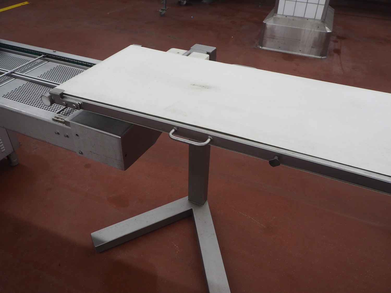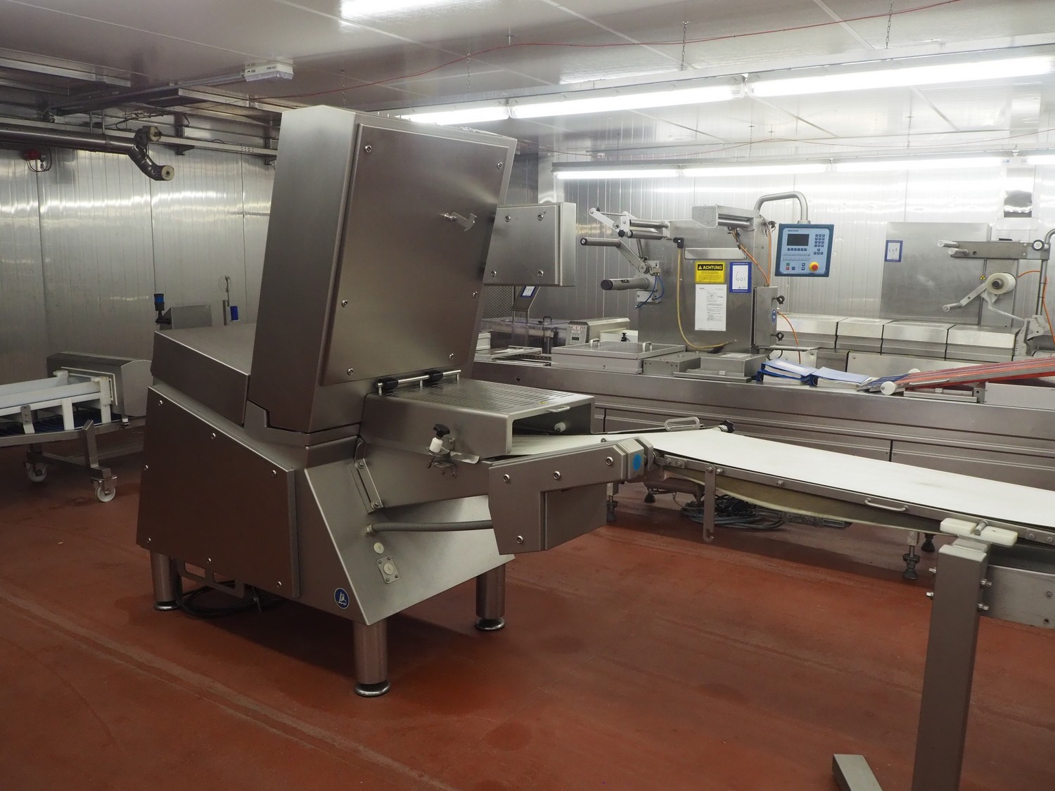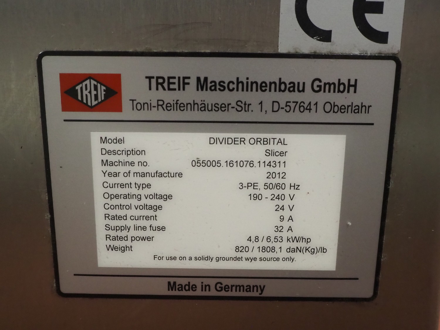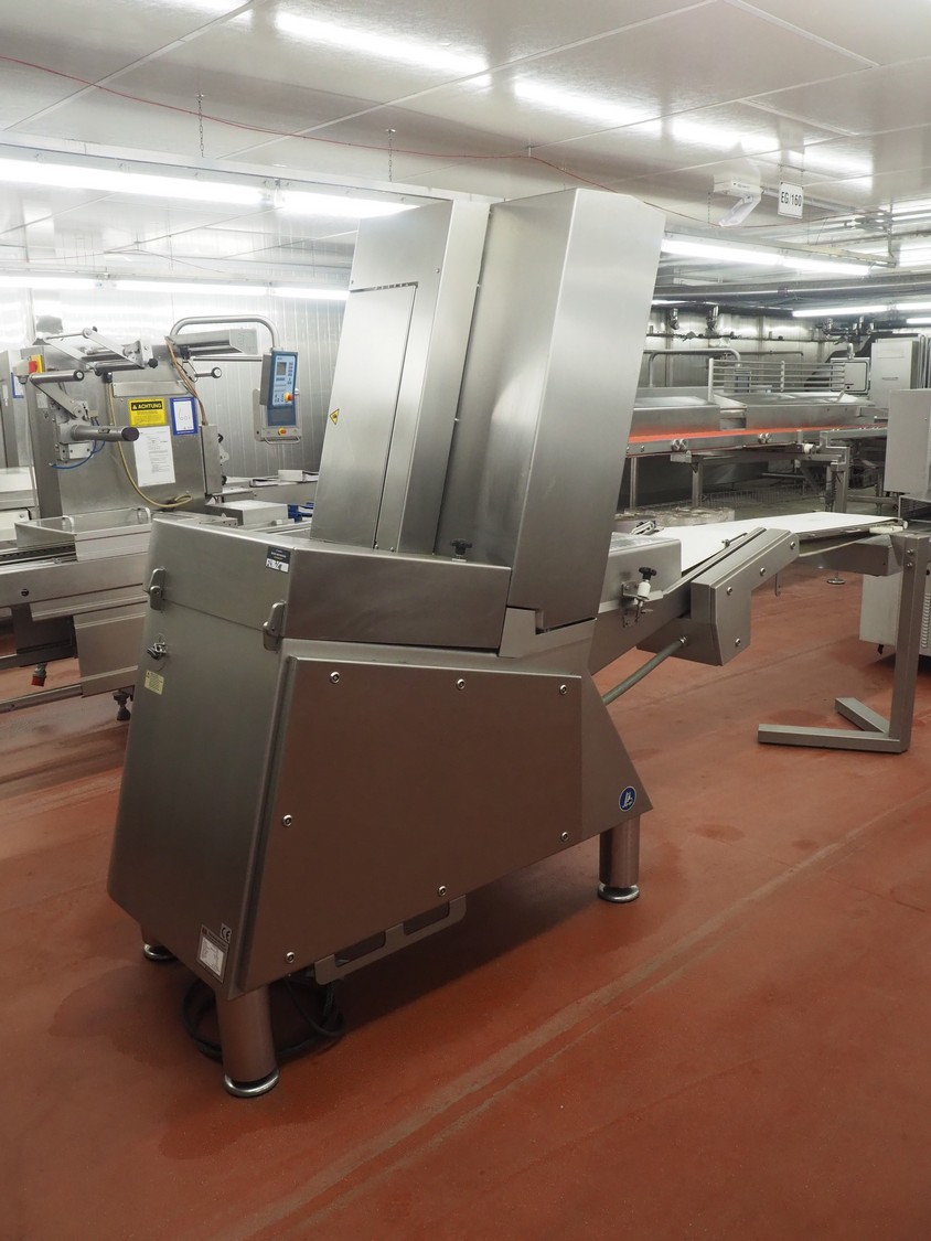 Treif Maschinenbau GmbH slicer, model: DIVIDER ORBITAL, machine number: 055005.161076.114311, year of construction: 2012, 190-240 V, 3 Ph, 50/60 Hz, 9 A, 4.8 kW, weight: 820 kg, plastic outfeed belt, belt width: 410 mm, total dimensions: 3800 mm x 1100 mm x 2180 mm.