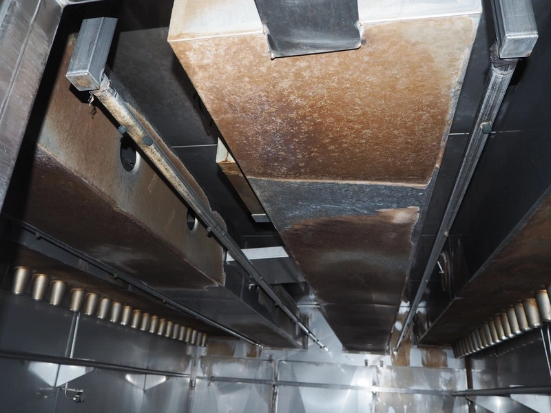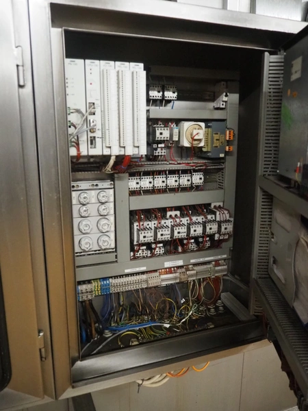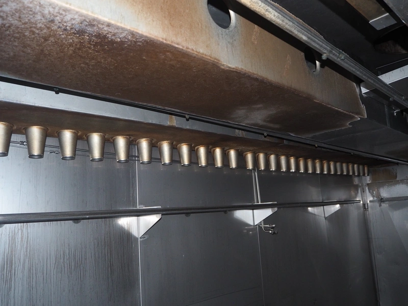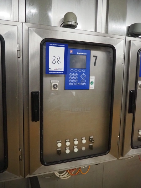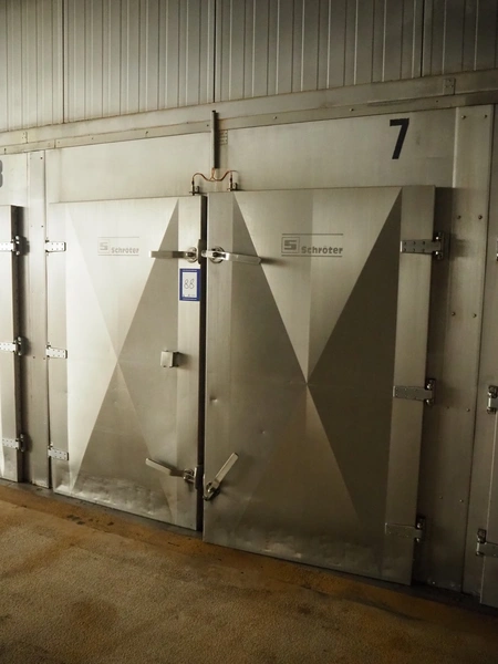 Schröter GmbH & Co. KG Anlagenbau smoking and cooling chamber for 8 trolleys, suitable for hot smoking (liquid smoke) and showering, type: HR-8Wg, manufacturing number: 325-1198/02, year of construction: 05-99, 230/400 V, 29 kW, heating: HD-Dampf, 4-10 bar, 270 kg/H, humidification and cooking: ND-Dampf, 0.5 bar, 250 kg/h, inside dimensions: 2700 mm x 4400 mm x 2050 mm, door dimensions: (2x) 1200 mm x 2050 mm, total dimensions: 2900 mm x 5600 mm x 3300 mm, dimensions switch cabinet: 750 mm x 400 mm x 1000 mm. Liquid smoke generator is not included.